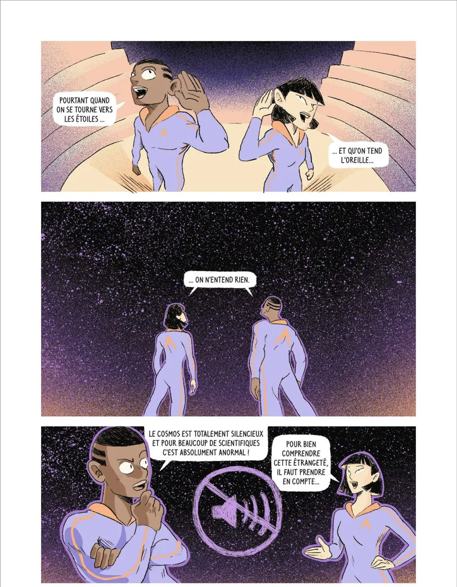 Pour résoudre ce paradoxe, une jeune fille intrépide, accompagnée de son grand-père, un scientifique farfelu, partent à l'aventure et explorent les hypothèses vertigineuses et souvent déstabilisantes de l'un des plus grands mystères du cosmos. Une odyssée à travers l'espace et le temps qui pourrait bien bouleverser vos certitudes quant à la place de l'humanité dans l'Univers. Texte: L'éditeur