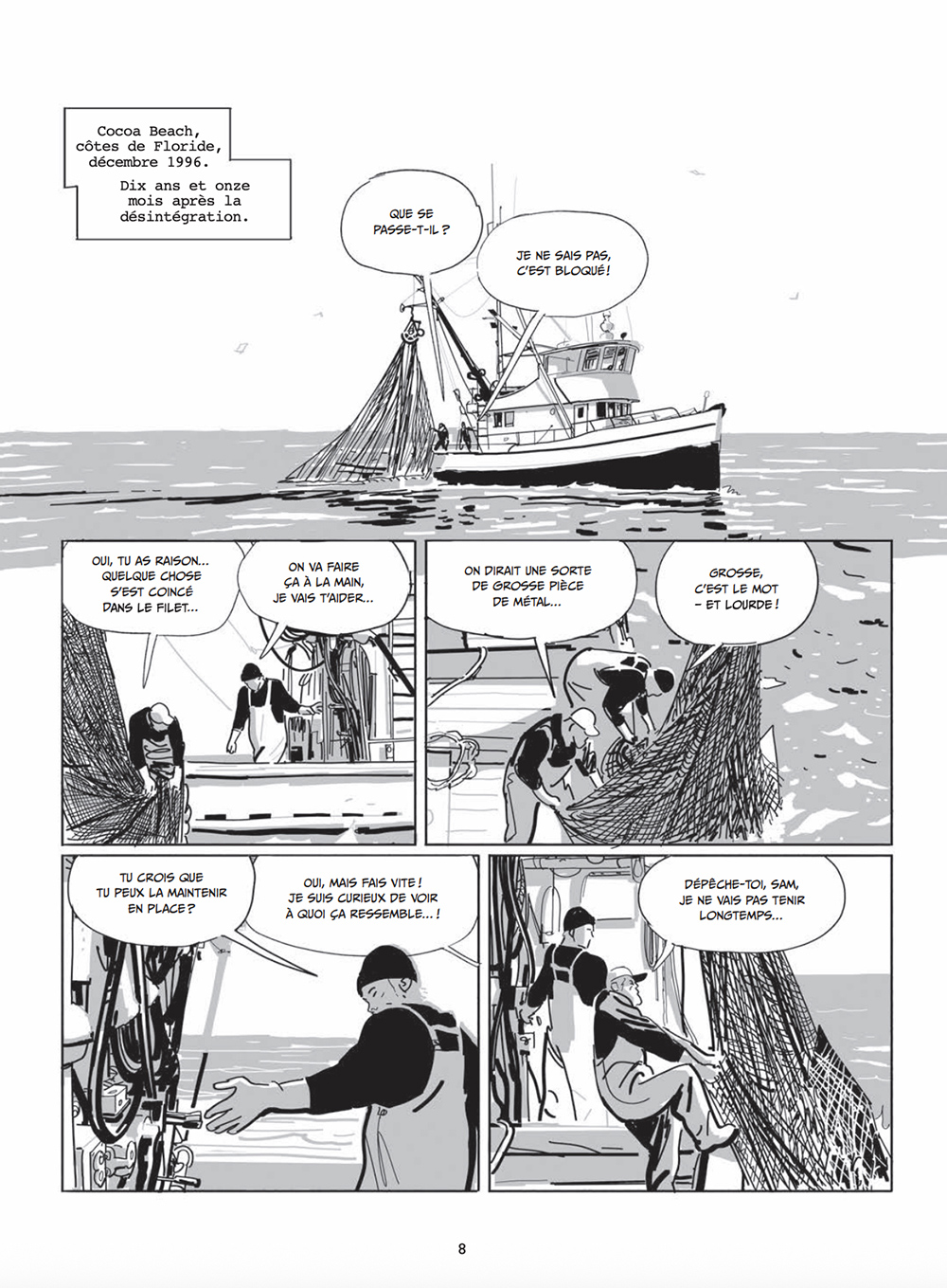 Petit album par le format, mais grand par la pagination, ce livre attire d'abord le regard grace à sa très jolie couverture. Ce casque d'astronaute qui laisse apparaitre partiellement un visage entravé du reflet d'une navette spatiale symbolise parfaitement le rêve de la conquête de l'espace. Et la palette de couleurs nous envoie direct dans les années 80... nous voici directement dans le bain avant même d'ouvrir l'album. Ce récit documentaire est signé par un des co-scénariste de La Bombe. Le sujet abordé ici est l'explosion qui a suivi le décollage de la navette Challenger en janvier 1986. Drame diffusé en direct à la télévision devant des millions de téléspectateurs. Le récit s'attarde sur les passagers qui composent l'équipage. Il sera particulièrement question de l'un d'entre eux. Une professeur, choisie sur le volet après un long processus de sélection, devant devenir la première civile envoyée dans l'espace. Le récit s'attarde sur les années et les mois précédents le drame, habilement décomptés à la manière d'un compte à rebours. Comment nos astronautes se sont préparés : On y suivra leur entrainement, un peu, leurs questionnements et états d'âmes, beaucoup. Il y a d'ailleurs quelques longueurs. Savoir que nos héros s'interrogent, qu'ils stressent et que cela à des répercussions sur leurs vies de famille, c'est logique. D'autant insister, comme par exemple lors de l'enchainement de scènes à Thanksgiving, où chacun découpe la dinde en famille en se retrouvant confrontés aux mêmes questions de leurs proches, c'est un peu longuet à force. A coté de ça, le récit introduit assez tôt le rôle d'un fournisseur de joints toriques utilisés sur le lanceur de la navette. Très vite on comprend que ces pièces auront un role à jouer dans l'explosion à venir. Ce qui est vraiment intéressant, c'est de voir que de nombreuses alertes, parfois virulentes, ont été signalées à plusieurs reprises. Ce qui est terrible, c'est de voir comment la NASA ne les a pas prises en compte, préférant ne pas décaler le lancement pour des problématique d'image et de budget. Tout ça nous conduit inéluctablement au drame annoncé. La fin, probablement légèrement romancée, raconte les dernières secondes de l'équipage et ajoute un peu de tension et de drama à l'ensemble. Un final assez réussi pour conclure une histoire terrible qui aura durablement marqué le monde de l'aérospatial.