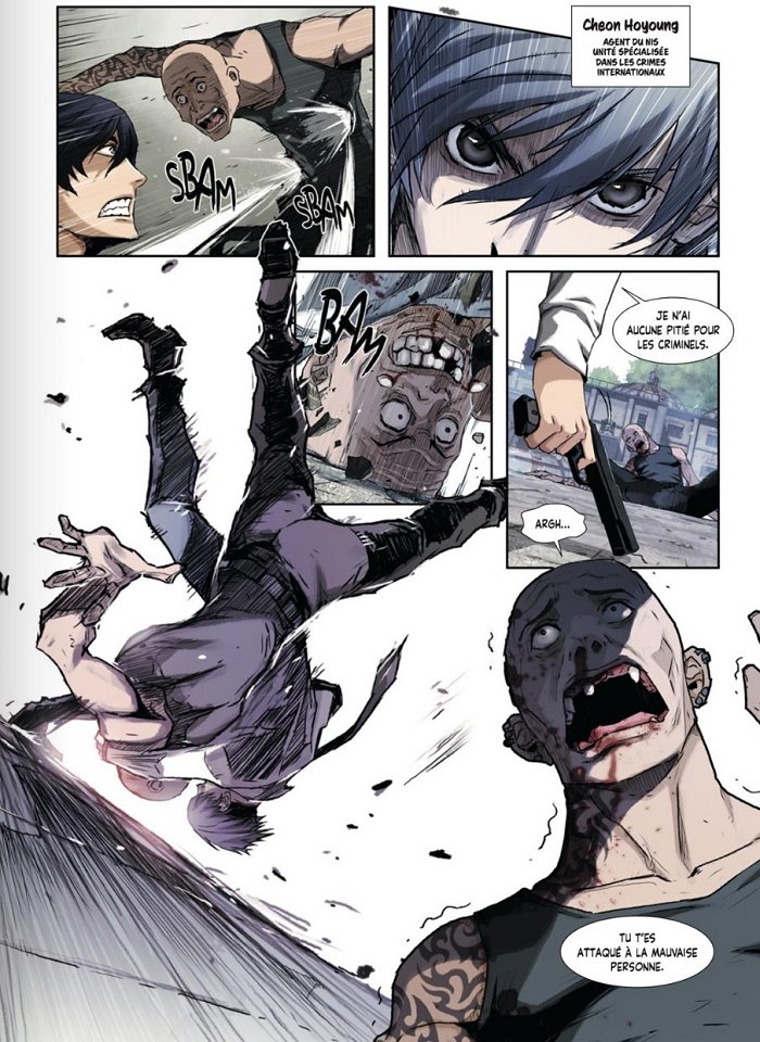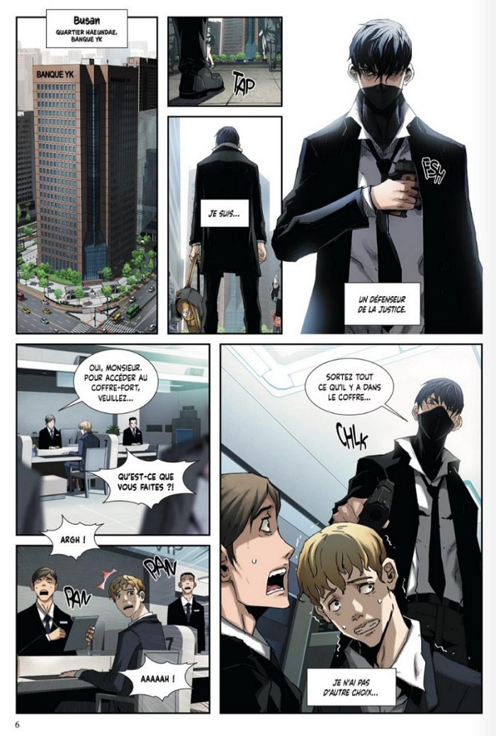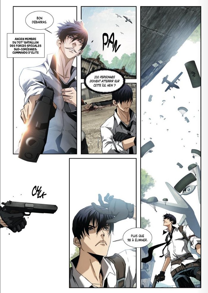 Voici venir une nouvelle série dans la collection Kbooks de chez Delcourt : PUBG Battlegrounds - 100. Tiré semble-t-il d'un jeu vidéo (que je ne connaissais pas), cette adaptation en webtoon oscille entre "Battle Royal" et Fortnite. On ajoute une petite trame scénaristique et des personnages bien déglingos, et vas-y que ça va défourailler, gicler et clamser tranquillement. Notre personnage principal, Cheo Hoyoung est un agent des services de renseignement contraint d'intégrer ce jeu illégal pour tenter de sauver un homme politique caché parmi les participants. Petit détail : tous les autres participants sont des assassins ou des criminels de la pire espèce et tout ce petit monde est largué sur une île où tous les coups sont permis... Alors oui, ça sent un peu le réchauffé et le déjà vu/lu, mais il faut reconnaître que certains personnages secondaires sont plutôt intéressants (et bien déjantés !), ce qui donne du peps au récit. C'est rythmé, les rebondissements s'enchainent et on se laisse porter par ce survival pour peu qu'on apprécie le genre. Côté dessin, ce n'est pas vraiment ma tasse de thé par contre, le graphisme fait très informatisé et ne brille pas par la qualité de ses décors. Heureusement, la gestion des scènes de combat ou d'action sont maîtrisées et donnent tout son élan à la série. (2.5/5)