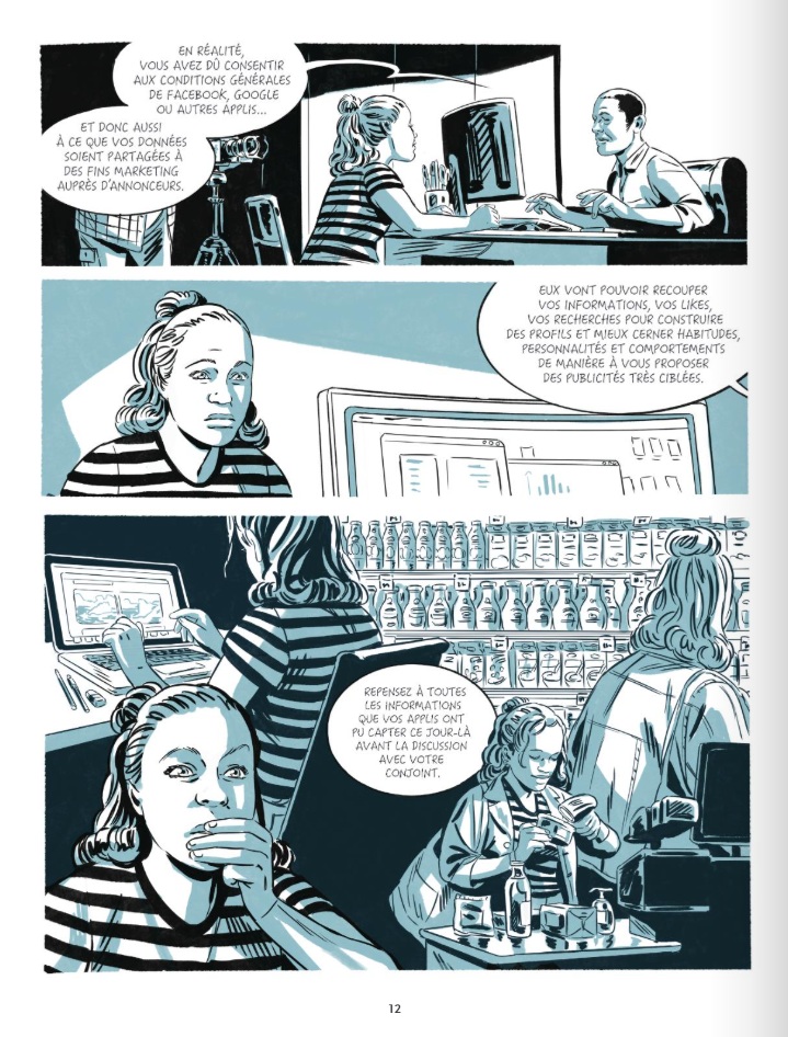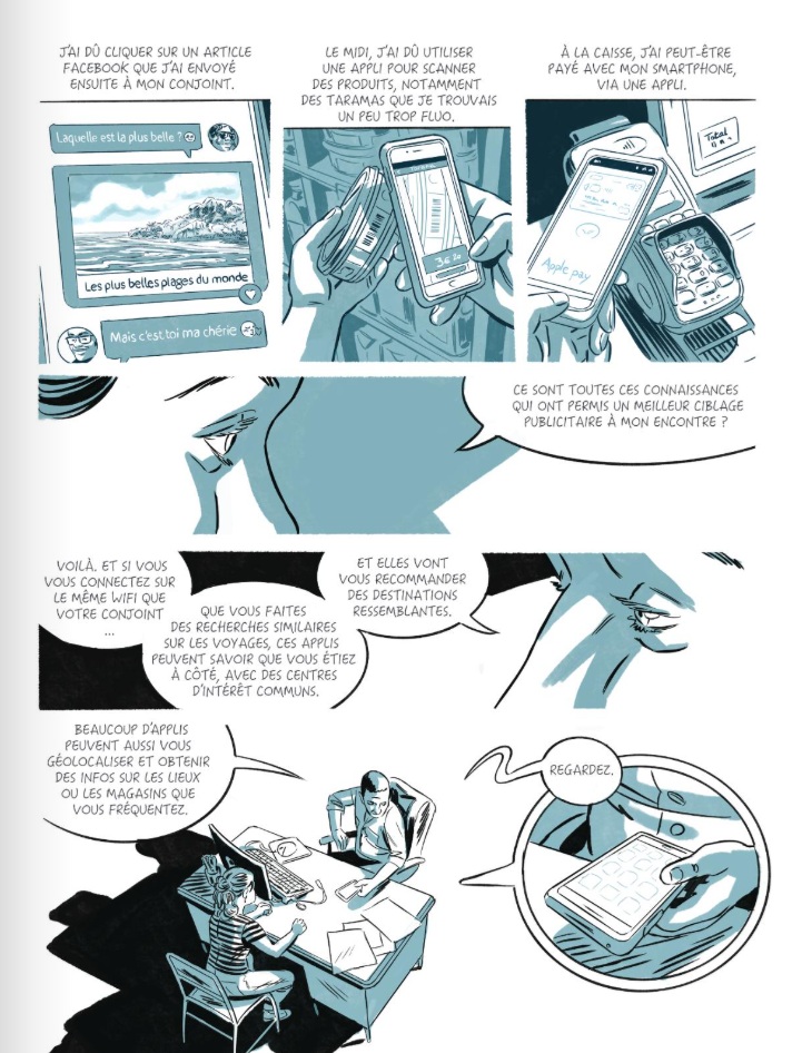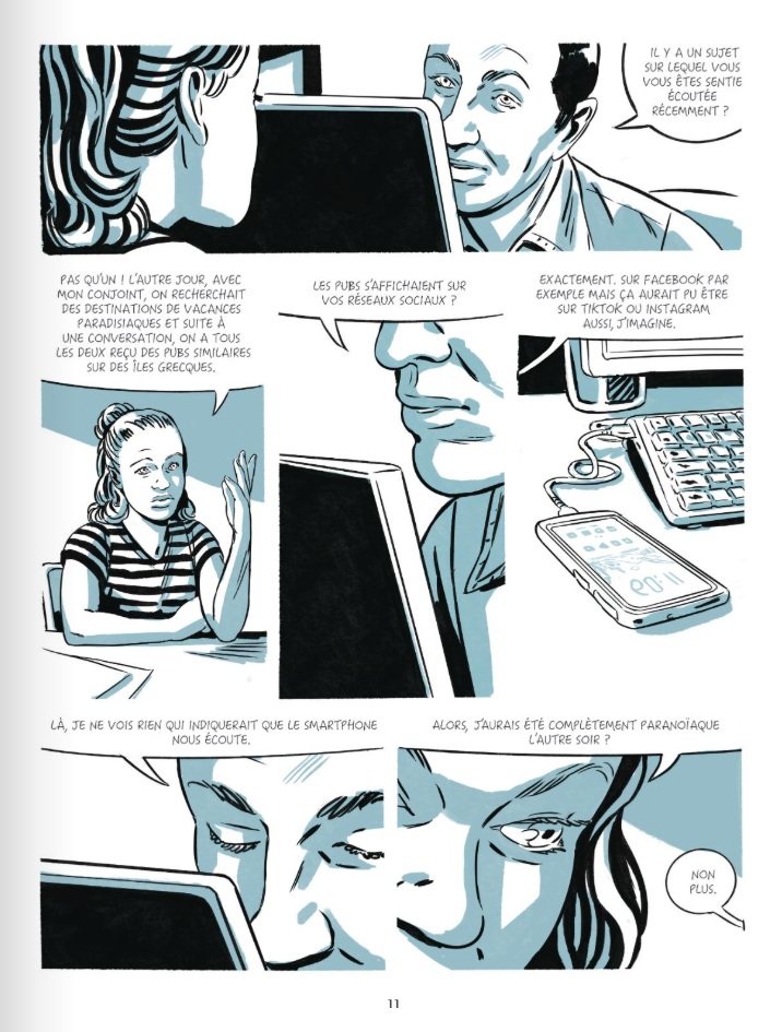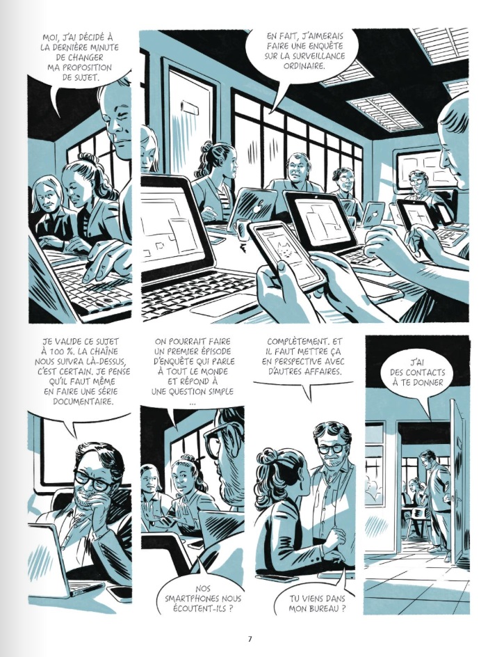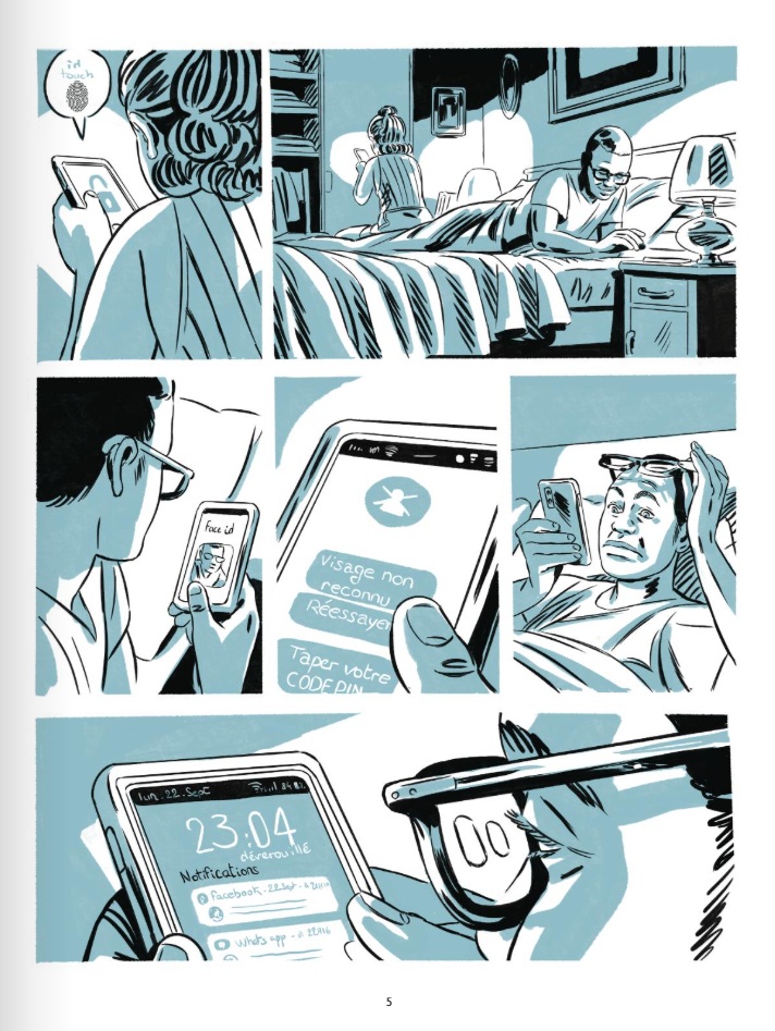 Voilà une BD documentaire de circonstance, vu la poussée sécuritaire qui nous attend avec l'état de notre monde et la poussée des extrêmes dont les traditionnels partis de droite emboîtent le pas, voire les dépassent dans leurs propositions. Dans cette enquête, Julie Scheibling (scénario) et Rémi Torregrossa (dessin) nous expliquent comment nous avons insidieusement basculé dans des sociétés sur-surveillées, sans vraiment en comprendre les enjeux et les conséquences. Qu'il s'agisse de surveillances individuelles, de masse, des smartphones qui vampirisent nos données à des fins commerciales ou politiques, du business de cette surveillance au détriments de nos droits et des trop tardives tentatives de régulation, la nasse est déjà en place. Ces thèmes sont déclinés au fil de chapitres distincts qui exposent clairement les problèmes et les enjeux, portés par un dessin réaliste et efficace. La colorisation sobre jouant sur les monochromies est du meilleur effet pour ce genre d’exercice, nous recentrant sur le sujet. Car même si nous sommes plus ou moins conscients des risques et des enjeux de ces nouvelles surveillances, remettre toutes ces facettes en perspective vous donne quand même froid dans le dos et vous donne juste envie de faire comme l'autrice : récupérer un bon vieux téléphone à clapet.