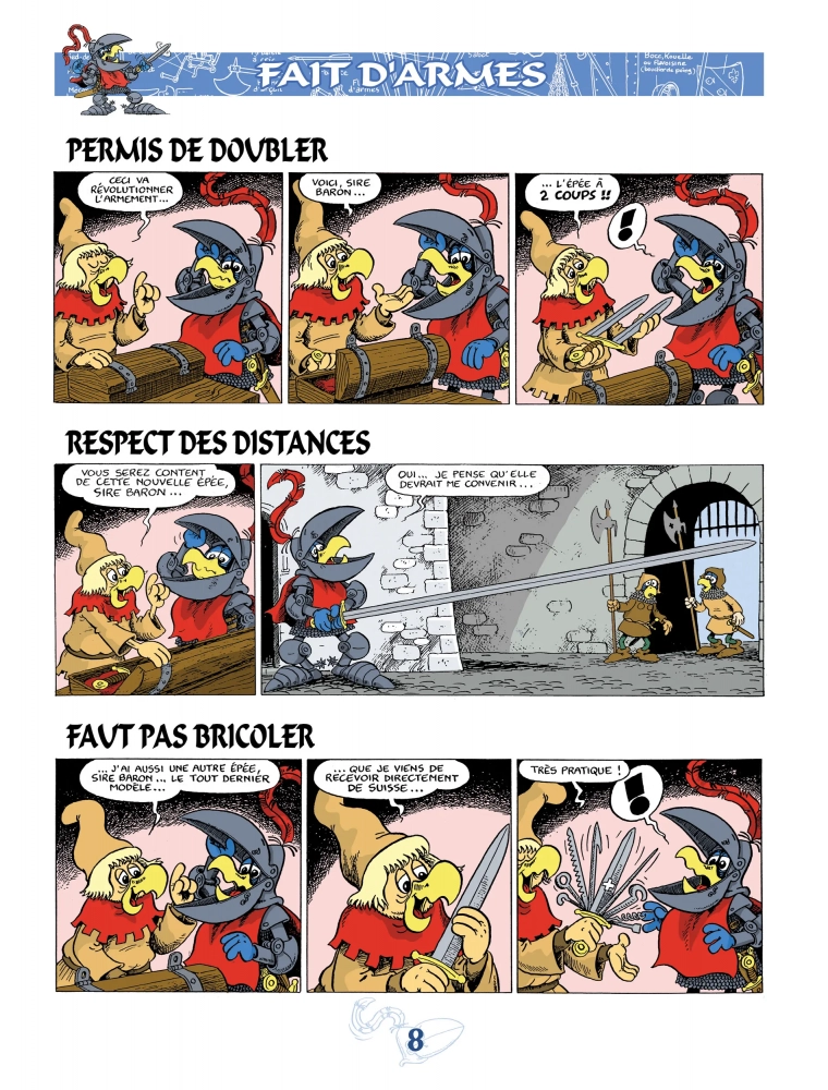 Je ne sais pas si j’aurais davantage apprécié cet album si je l’avais lu plus jeune (car ça s’adresse quand même en priorité, sinon exclusivement à un jeune lectorat je pense), mais l’adulte que je suis n’y a pas du tout trouvé son compte. Je ne connais pas la série Bec-en-fer, mais Sylvain et Sylvette du même Pesch (Belom l’ayant rejoint sur la fin) n’est clairement pas ma came, même si j’en avais lu quelques-uns, quand j’étais gamin (une relecture étant adulte m’avait rebuté). Dans une sorte d’introduction, dans laquelle sont présentés les personnages principaux, il y a une claire volonté d’ancrer les gags dans l’Histoire. Mais ceci disparait rapidement. Il faut dire que la structure – des gags en deux ou trois cases – empêche clairement toute ambition « historique » réelle. Mais ce moyen-âge pour de rire (on est au début du XVème siècle, au temps de la guerre de Cent ans, peu avant Azincourt) ne possède aucune des qualités développées par F’murr ou Peyo dans leurs séries. Les gags sont poussifs, l’humour ne fonctionne pas avec moi en tout cas. Il y a aussi quelques redites (voir le gag de la botte secrète par exemple). Clairement pas ma came. Et cet album, en plus de mon expérience malheureuse avec Sylvain et Sylvette, ne m’a pas vraiment donné envie de découvrir les albums plus longs de Bec-en-fer !