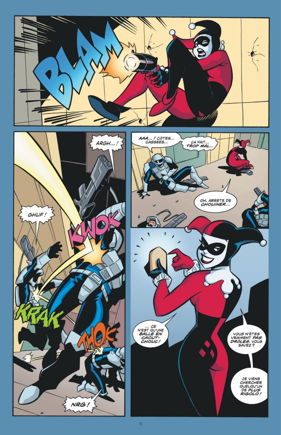 Harley Quinn est un personnage tellement populaire que seulement un an après que DC la finalement accueil dans son univers de comics, elle a eu droit à sa propre série, la première des plusieurs qui sont venus par la suite. Harley a encore son costume classique tiré de la série animée de Batman des années 90 et elle est encore plus ou moins en couple avec le Joker même si durant la majeur partie de la série elle essai de se faire un nom en solo. C'est une série humoristique et de ce coté là j'ai trouvé que c'était inégal. Il y a des bons gags, mais aussi plusieurs trucs vraiment lourds comme par exemple Double-Face qui n'arrête pas de dire deux ou d'autres mots du même genre. Le principal problème que j'ai eu est que la narration m'a semblé lourde. Les cases sont parfois surchargées et les personnages sont parfois un peu figés lorsqu'il y a de l'action. Cela reste sympathique à lire, on était encore à une époque où il se passait des choses à chaque page et qu'un comics ne mettait pas 5-6 numéros pour raconter une histoire. J'aime bien comment on utilise les personnages de la mythologie Batman. Ce n'est pas une série extraordinaire et si vous n'êtres pas fan du personnage d'Harley Quinn, ce n'est pas cette série qui va vous faire changer d'idée, mais cela reste divertissant.