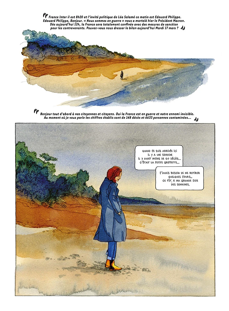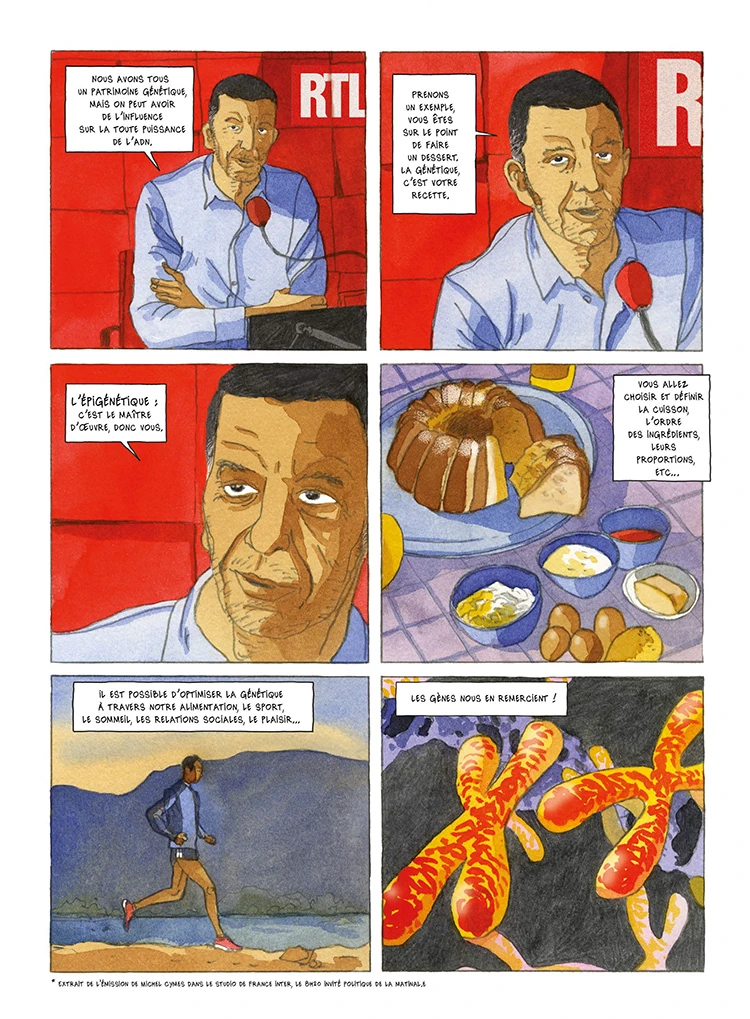 En quoi l’environnement module l’expression des gènes mais pas leur séquence. - Il s’agit d’une histoire complète et indépendante de toute autre. Son édition originale date de 2025. Ce tome a été réalisé par Céline Gandner pour le scénario et par Joël Alessandra pour les dessins et les couleurs. Il comprend quatre-vingt-quatorze pages de bande dessinée. Il commence par un texte d’une page dans lequel la scénariste remercie les personnes qui l’ont encouragée et accompagnée dans la réalisation de cet ouvrage. Il se termine avec un extrait d’un article du Monde, rédigé par Mathilde Damgé et paru le vingt-neuf juin 2021, sur une décision relative à la conservation de ses gamètes pour réaliser une PMA ultérieurement, ainsi qu’une mise à jour par la scénariste sur la PMA et les nouveaux droits pour les enfants nés d’une PMA, où elle précise que cette bande dessinée a été écrite en mars 2020. Épigénétique : Du grec ancien épi Au-dessus de et de Génétique est la discipline de la biologie qui étudie la nature des mécanismes modifiant de manière réversible, transmissible et adaptative l’expression des gènes sans en changer la séquence ADN. En résumé en quoi l’environnement module l’expression des gènes mais pas leur séquence. Céline écoute une émission de RTL une intervention du docteur Michel Cymes. Il parle d’épigénétique : on a tous un patrimoine génétique mais on peut avoir de l’influence sur la toute-puissance de l’ADN. Prenons un exemple : une personne est sur le point de faire un dessert, la génétique, c’est sa recette. L’épigénétique : c’est le maître d’œuvre, donc vous. Il va choisir et définir la cuisson, l’ordre des ingrédients, la proportion, etc. Il est possible d’optimiser la génétique à travers son alimentation, le sport, le sommeil, les relations sociales, le plaisir… Les gènes nous en remercient ! Juliette effectue une balade en bord de mer, constatant que la vie est si imprévisible parfois. Sur France Inter, Édouard Philippe reprend le mot d’Emmanuel Macron disant que la France est en guerre. Le premier Ministre annonce que dès aujourd’hui douze heures, la France sera totalement confinée avec des mesures de sanctions pour les contrevenants. Le journaliste annonce 148 décès et 6.633 personnes contaminées. Quand Juliette est arrivée dans ce village proche d’Honfleur il y a une semaine, il y avait moins de soixante décès, c’est la petite grippette. Elle avait besoin de se retirer quelques jours. Ce fût, à sa grande joie, des semaines. Deux semaines plus tôt à Paris, elle faisait le constat que : C’est fini, elle est périmée. Et pas une larme. Sur la plage, elle se dit qu’elle ne ressent plus rien, un pas après l’autre, son corps est aussi lourd qu’une pierre. Endolori. Un boulet. Et toujours pas une larme. C’est donc cela la sidération ? Le trois mars 2020, elle avait reçu un courriel de la clinique De Tambre, lui disant que le laboratoire de génétique les avait informés que l’embryon n’était pas transférable, et ajoutant que le docteur lui expliquerait le lendemain en profondeur, et qu’ils enverraient le rapport dès que possible. Une bande dessinée qui sort de l’ordinaire par plusieurs aspects. Pour commencer, l’introduction se trouve dans le texte de quatrième de couverture dont la lecture permet d’établir la situation de la narratrice en début de récit : Après le non-aboutissement d’un projet bébé avec son ami homo, l’héroïne se lance, à quarante-quatre ans, sur une PMA IAD en Belgique (don de sperme anonyme par insémination). Bien que son profil biologique soit ultra favorable pour son âge, elle vivra cinq inséminations sans suite. Juliette continue malgré tout d’espérer et tente une PMA à Madrid. Ensuite il s’agit d’un narratif à la première personne, intime, donnant la sensation que c’est la scénariste qui parle elle-même. Au travers de ses réflexions exposées dans les cartouches, Juliette (et pas Céline) expose aussi bien son état d’esprit sur sa volonté et son projet d’enfant, que les informations qu’elle assimile au fur et à mesure de ses recherches, sur l’épigénétique et sur les fonctions de la grossesse qui sont beaucoup plus importantes qu’un simple portage. Le lecteur peut se trouver déconcerté par les circonstances dans lesquelles ces réflexions se produisent : le premier confinement décrété lors de l’épidémie de la COVID-19. Cela induit la forme même de la narration : de longues promenades sur la plage, très peu d’autres personnages, l’importance donnée aux émissions de radio et aux lectures. Par la force des choses, une sorte de parallèle s’installe entre l’annonce du décompte des décès et le projet de vie. Le récit est focalisé sur le personnage de Juliette, sur son projet bébé (comme elle le nomme), sur ses démarches et une forme d’apprentissage. Le dessinateur est ainsi amené à la représenter dans soixante-huit pages, dont trente-deux sont une illustration en pleine page. En fonction de sa sensibilité, le lecteur peut trouver que cette fréquence dans la représentation du personnage principal, souvent en gros plan confine à l’obsession, ou au contraire participe au fait d’en faire le point central, de rendre visible qu’il s’agit d’une démarche personnelle qui lui est spécifique, et qu’il s’agit de son point de vue, fatalement et légitimement autocentré. Comme le montre la couverture (il s’agit d’un dessin en pleine page figurant dans la bande dessinée), Juliette est une belle femme, svelte et souple (on assiste à une de ses séances de yoga en solo devant la mer), sans marque de l’âge, le récit précisant qu’elle a quarante-quatre ans, et le texte de la quatrième couverture évoquant plutôt quarante-six ans. Le dessinateur se tient à l’écart de tout voyeurisme, la montrant