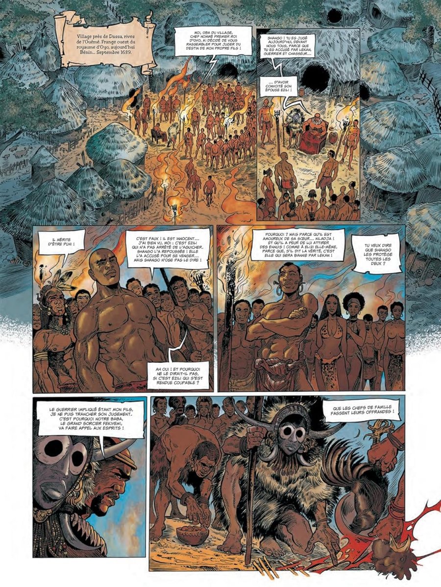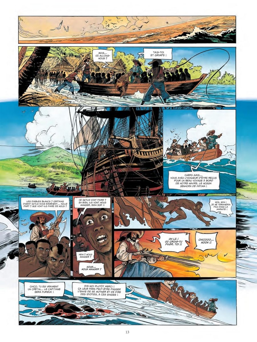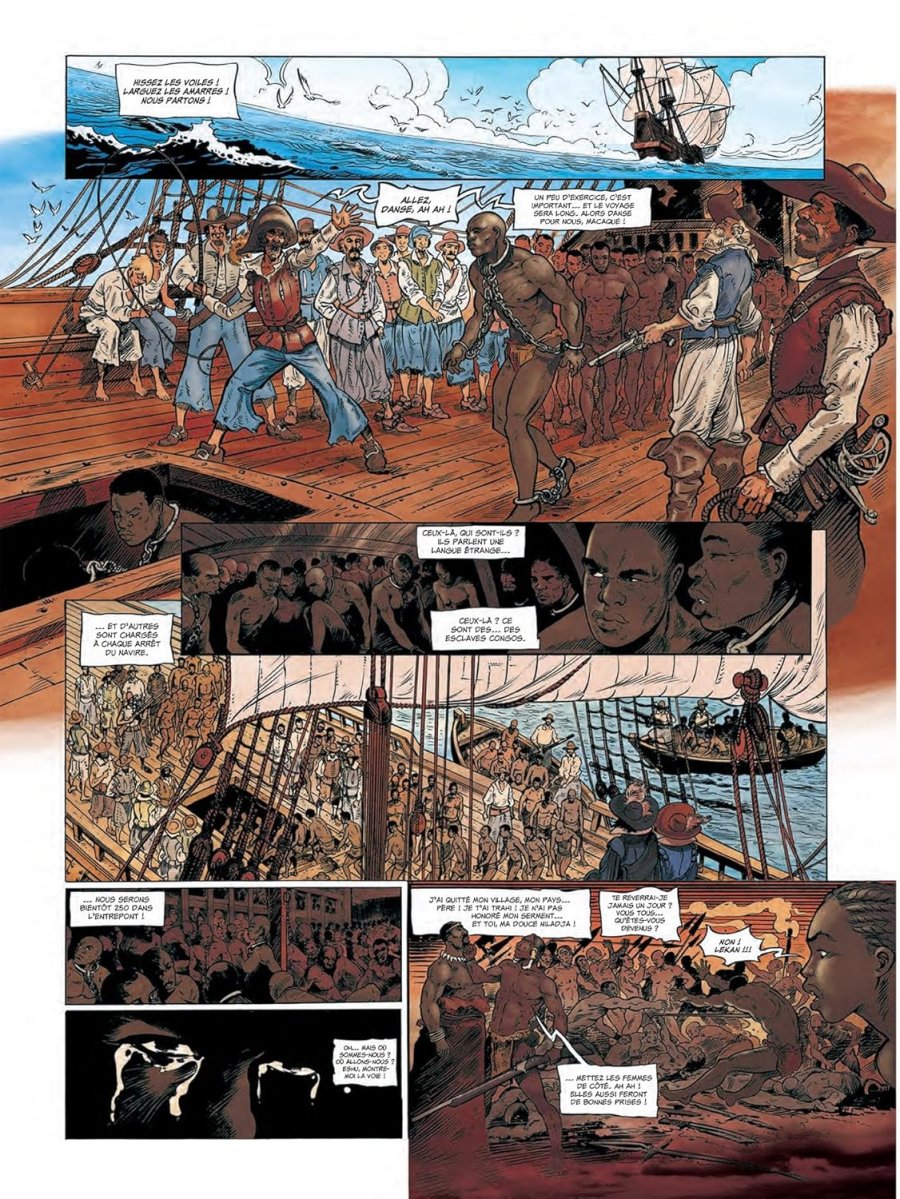 J'aime bien quand la BD permet de mettre en lumière des évènements ou des personnages historiques qu'on a oubliés. On a une image d'Epinal où un pirate des mers de l'époque classique est un homme blanc, souvent barbu, assez costaud. Ici Shango est une force de la nature, mais il est noir de peau. Il a un destin exceptionnel, acquis à la force des bras et grâce à une détermination hors du commun. Des qualités qu'il montre dès le début de son aventure, an agissant pour se libérer des chaînes que lui ont posé ses compatriotes renégats, vendus aux marchands d'esclaves. Cette histoire nous est contée par Marc de Banville, journaliste télé et documentariste spécialiste des zones de guerre, et Arnaud Delalande, connu pour avoir écrit de nombreuses séries historiques. Ils ont donc uni leurs centres d'intérêts et talents de conteurs pour ce récit, prévu en plusieurs tomes chez Robinson. Un récit qui a de forts accents de réalisme, mais qui est fictif, même si peut-être inspiré par des révoltes d'esclaves au XVIIème siècle. C'est bien raconté, on ne s'ennuie pas une seconde, et on a envie d'en savoir plus sur ce précurseur, quelque part, de Toussaint Louverture. Pour mettre en images ce récit plein de bruit et de fureur, les deux co-scénaristes bénéficient de la fougue graphique de Guy Michel, dessinateur né en Haïti, et par conséquent concerné par ce sujet, mais surtout un très bon auteur, capable de mettre en scène des combats, des abordages, des tempêtes sur de beaux galions européens, et d'installer de belles ambiances en compagnie de Tyffenn Guerveno. C'est assez prenant et plaisant à lire, j'aurai plaisir à prendre connaissance de la suite.