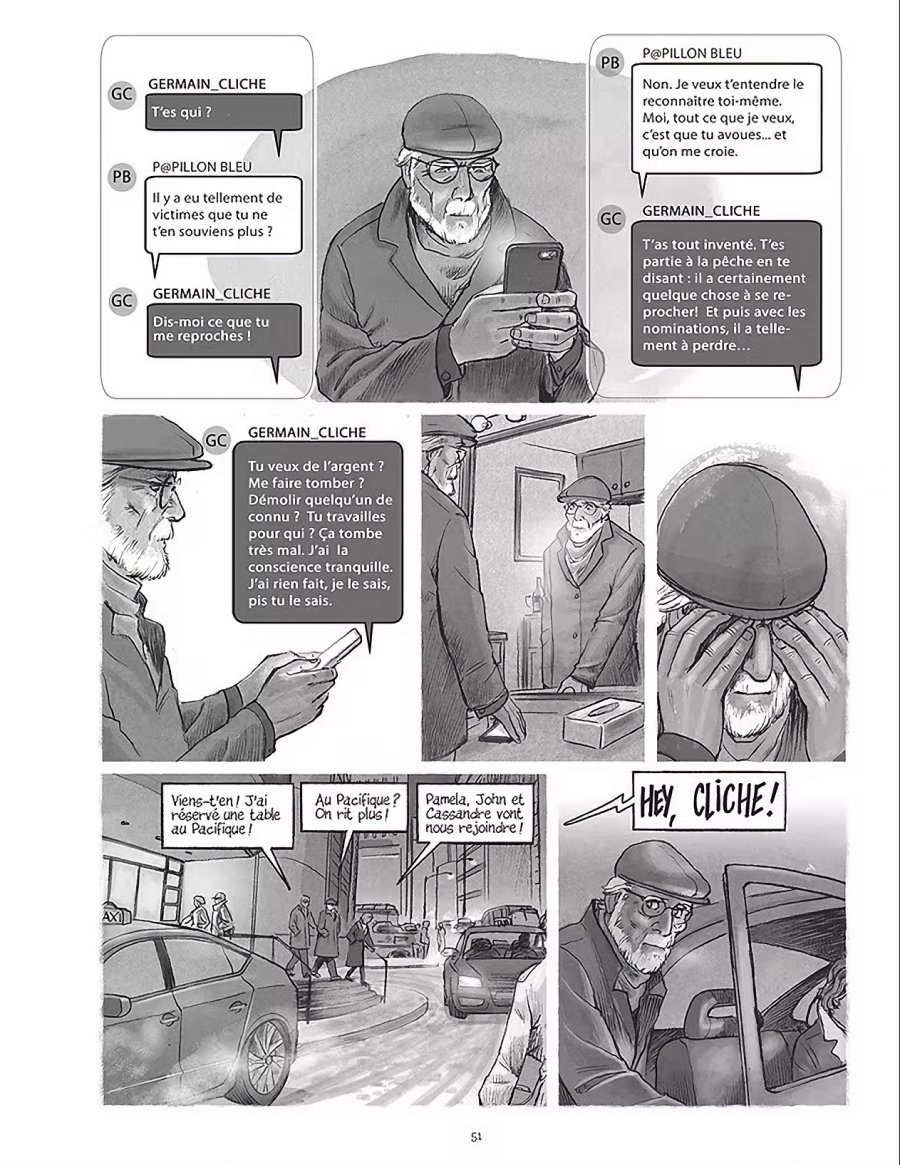 Claude Paiement et Jean-Paul Eid collaborent encore une fois et donne un très bon one-shot qui traite d'un sujet actuel à savoir la dénonciation anonyme d'un réalisateur très populaire qui aurait abusé une femme il y a de cela plusieurs décennies. Le scénario est efficace et très crédible. Les événements qui se produisent après la dénonciation sont réalistes avec ceux qui le défendent et ceux qui le jugent immédiatement. Ajoutons qu'en plus le réalisateur en question vient de sortir un film qui récolte des prix et des nominations alors plusieurs voudraient bien que cette accusation passe sous le tapis en se foutant si c'est vrai ou non, ce qui est important est que ce célèbre réalisateur fait honneur au Québec en gagnant l'oscar du meilleur film étranger ! Je ne sais pas si un lecteur européen va bien comprendre toutes les subtilités de la société québécoise. En gros, avant les années 60 le Québec francophone était dominé par la minorité anglophone et hormis une minorité de bourgeois, la plupart des francophones étaient des prolétaires et tout a changé en seulement quelques décennies. Le personnage principal fait parti de cette génération qui a souvent eu la vie dur avant de pouvoir s'épanouir durant les changements sociaux des années 60-70 et je comprends parfaitement qu'il soit traité comme un bijou national et qu'il faut que sa réputation soit irréprochable. Sauf que sa génération a aussi connue une époque où pouvait faire des choses qu'on ne peut plus faire aujourd'hui.... Le scénario est prenant et les personnages sont complexes. Il y a des dialogues qui font mal parce qu'elles disent des vérités que parfois on ne voudrait pas entendre. Le seul défaut selon moi est que l'identité de la mystérieuse femme qui dénonce et harcèle le réalisateur me semble facile à deviner.