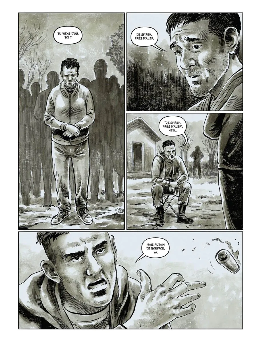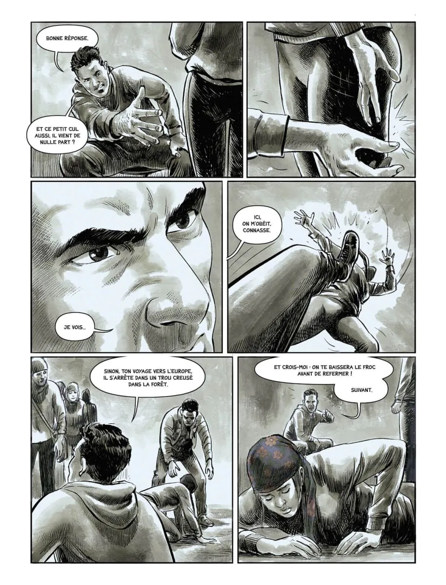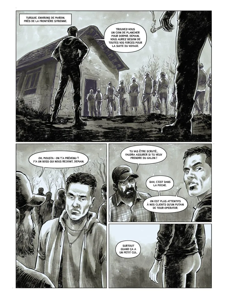 Awar est un passeur, à la tête de convois de migrants vers le Royaume-Uni pour le compte d'un réseau aux méthodes mafieuses. L'arrivée d'une jeune Kurde fuyant la Syrie ravive chez lui de douloureux souvenirs et une humanité qu'il croyait étouffée par ce système cruel dont il n'est qu'un rouage. Basé sur les enquêtes de terrain du journaliste Frederic Loore, cette BD raconte de l'intérieur le fonctionnement du trafic de migrants, en adoptant, fait assez rare, le point de vue des passeurs. La tonalité oscille entre thriller et drame social. Filières, intermédiaires, hiérarchie, méthodes de pression, marchandisation des corps : l'ensemble se veut instructif et documenté, et il y a un solide travail d'enquête derrière la fiction (ainsi qu'un cahier documentaire sur le trafic d'êtres humains en fin d'album). L'objet en lui-même est une bel et grand album, un ouvrage éditorialement soigné qui impose immédiatement sa présence. Le dessin, sombre et réaliste, travaille surtout en teintes de gris, relevées de quelques rares touches de couleur venant souligner certains éléments symboliques, comme le foulard de combattante kurde de la jeune femme. Cette palette restreinte renforce la rudesse du propos. L'atmosphère est lourde, oppressante, bien en accord avec ce récit dur, presque sans échappatoire. Sur le fond, la description du trafic est implacable. On mesure la violence du système, l'exploitation cynique, la peur constante des migrants, l'humiliation organisée par les trafiquants. C'est âpre, parfois glaçant, et probablement crédible au regard de la documentation revendiquée. Pourtant, une question persiste : le traitement des antagonistes m'a semblé très manichéen. Les trafiquants apparaissent comme revanchards, haineux, brutaux, arrogants : de véritables salopards sans nuance, à l'exception relative du héros qui dissimule son humanité derrière un masque d'impassibilité. Leur violence est telle qu'on en vient à s'interroger : est-ce la représentation fidèle d'une réalité déjà insoutenable, ou une accentuation dramatique destinée à renforcer l'impact ? De la même manière, la passivité apparente des migrants face à ces exactions interroge (tout comme leur focalisation quasi exclusive sur le Royaume-Uni comme terre d'accueil, mais c'est un autre sujet). On conçoit que leur situation soit désespérée, que la guerre et l'absence de perspectives puissent rendre acceptable l'inacceptable. Mais face aux abus montrés ici, j'ai parfois eu du mal à comprendre pourquoi aucune révolte ne semblait possible. Je me suis demandé s'il s'agissait du reflet d'un rapport de force si écrasant qu'il annihile toute résistance, ou si le récit ne forçait pas le trait pour dénoncer l'horreur du système au détriment d'un peu de nuance. Je ne peux que supposer que l'histoire est conforme à la triste réalité documentée. Passeur(s) est une œuvre dure, sombre et solidement construite. Un récit instructif et engagé, qui éclaire efficacement les mécanismes du trafic de migrants. Mais son traitement très frontal, presque sans nuance dans la caractérisation des bourreaux, laisse planer un doute : sommes-nous face à une réalité brute, aussi terrible que cela, ou à une vision volontairement accentuée pour frapper les consciences ? Quoi qu'il en soit, la lecture ne laisse pas indifférent.