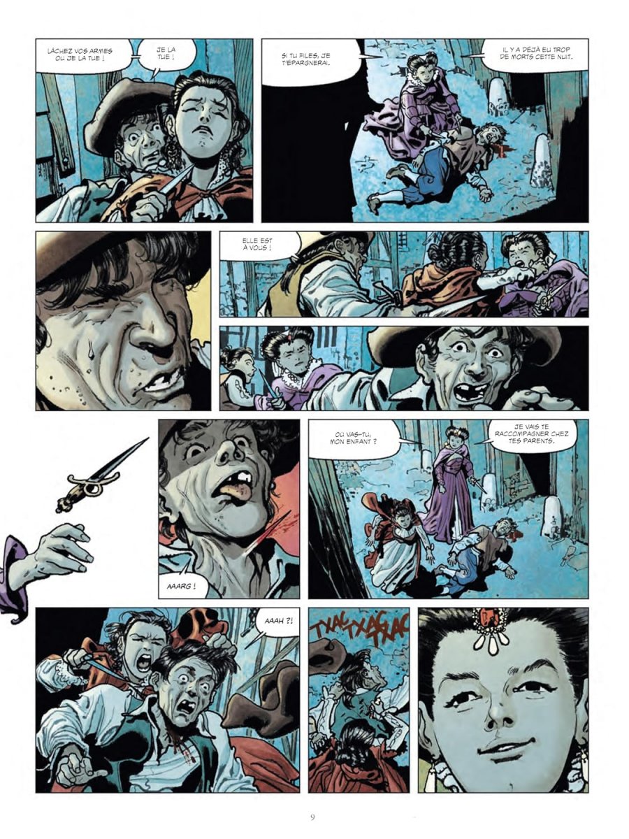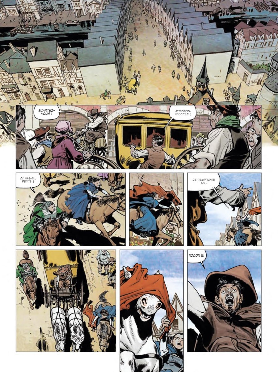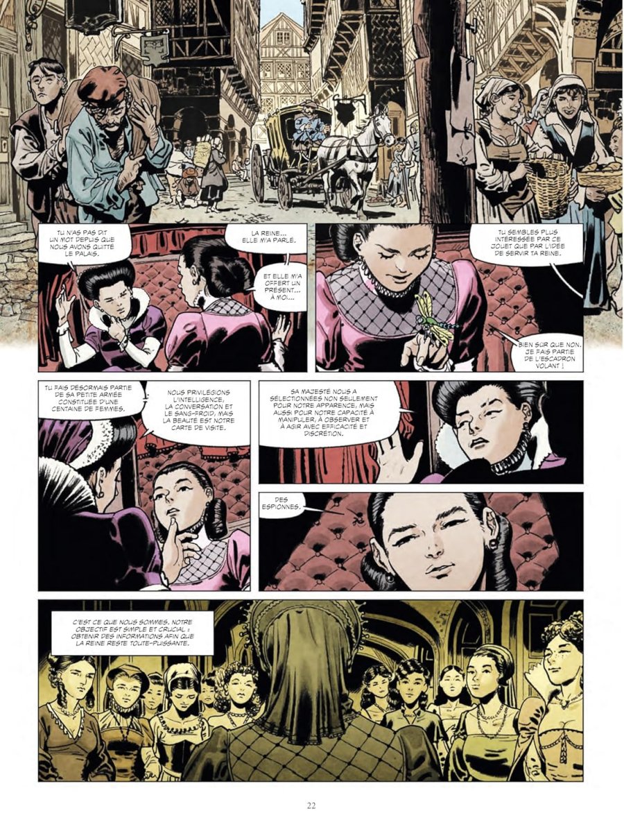 Pendant le (court) règne d'Henri II et celui de ses fils, son épouse Catherine de Médicis a joué un rôle politique très important. On lui prête ainsi la création d'une brigade informelle, surnommée l'Escadron volant, au sin duquel un certain nombre de ses dames de compagnie ont joué le rôle d'espionnes, jouant les bretteuses et obtenant des secrets stratégiques sur l'oreiller. Techniquement, cela faisait de la Médicis une mère maquerelle, utilisant les charmes de ses courtisanes pour obtenir plus de pouvoir. Si cet escadron a réellement existé, il fut l'objet de nombreuses fables, certaines allant parfois très loin. Raule, scénariste espagnol connu notamment pour Jazz Maynard, s'en est emparé pour tourner l'idée à sa sauce, et nous livrer un récit d'aventure historique ma foi pas mal troussé, mêlant intrigues de la Cour et combats d'épées dans les rues de Paris. Avec en prime la présence d'une tueuse venue visiblement d'Orient. Le récit est mis en images par José Muñoz, vétéran de la BD argentine, qui a notamment travaillé avec Breccia et Pratt. Son style s'est affiné dans cette série, pour ressembler à ce que l'on faisait il y a une vingtaine d'années dans la collection (A suivre). C'est très plaisant, et on voit que le dessinateur s'amuse beaucoup à varier sa mise en scène, pour nous offrir de belles planches assez classiques. Curieux de savoir ce qu'il va arriver à Victoria, l'audacieuse débutante, dans la suite d ela série.