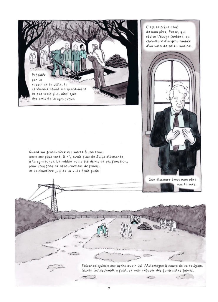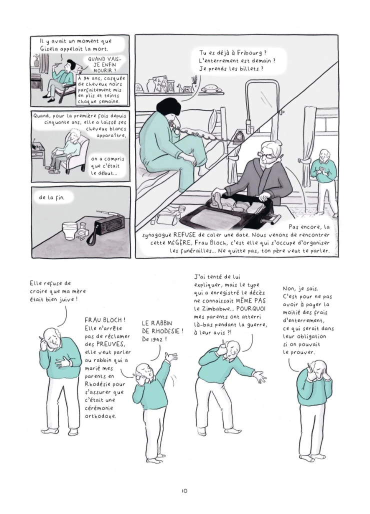 Les différentes communications de l'éditeur annonçaient des révélations fracassantes au sujet de Gisela, dont le fils et la petite-fille sont chargés de vider son appartement à sa mort. Partis d'Angleterre, père et fille traversent alors quatre pays afin de rejoindre Fribourg, en Allemagne, afin de faire rapidement du tri, et de charger vaille que vaille un gros fourgon pour tout ramener outre-Manche où le reste de la famille pourra se servir. L'occasion pour eux de discuter de l'histoire familiale, de l'exil de Gisela en Rhodésie, dans le sud du continent africain, alors qu'une autre branche de la famille part elle vers Amsterdam, la Guyane néerlandaise, et les Etats-Unis. Une véritable odyssée familiale, dont Astrid semble se désintéresser, pour mettre en avant l'inefficacité chronique dont semble souffrir l'intégralité de sa famille : l'enterrement de sa grand-mère ailleurs que dans le vieux cimetière juif de sa ville, saturé, les injonctions contradictoires de sa mère, de sa sœur, les penchants autoritaires d'une cousine... C'est, à ma connaissance, le premier album de l'autrice, dont le métier est celui d'une animatrice spécialiste du stop motion. Et ça se sent : la construction est chaotique, elle se perd dans les différents éléments sans les utiliser vraiment, et l'élément qui donne son nom à l'album apparaît lors d'une brève séquence à la fin de l'histoire. Il reste quand même quelques petits moments d'émotion, comme lorsque le père raconte une drôle d'anecdote de l'époque où il jouait dans une adaptation en théâtre de Peter Pan jeune... Le dessin quant à lui est statique la plupart du temps, un peu minimaliste, on dirait de la ligne claire par moments. Bref, c'est dommage que cette histoire arrive aussi tôt dans l'œuvre de l'autrice, avec plus de bouteille elle aurait pu en faire quelque chose de plus pêchu.