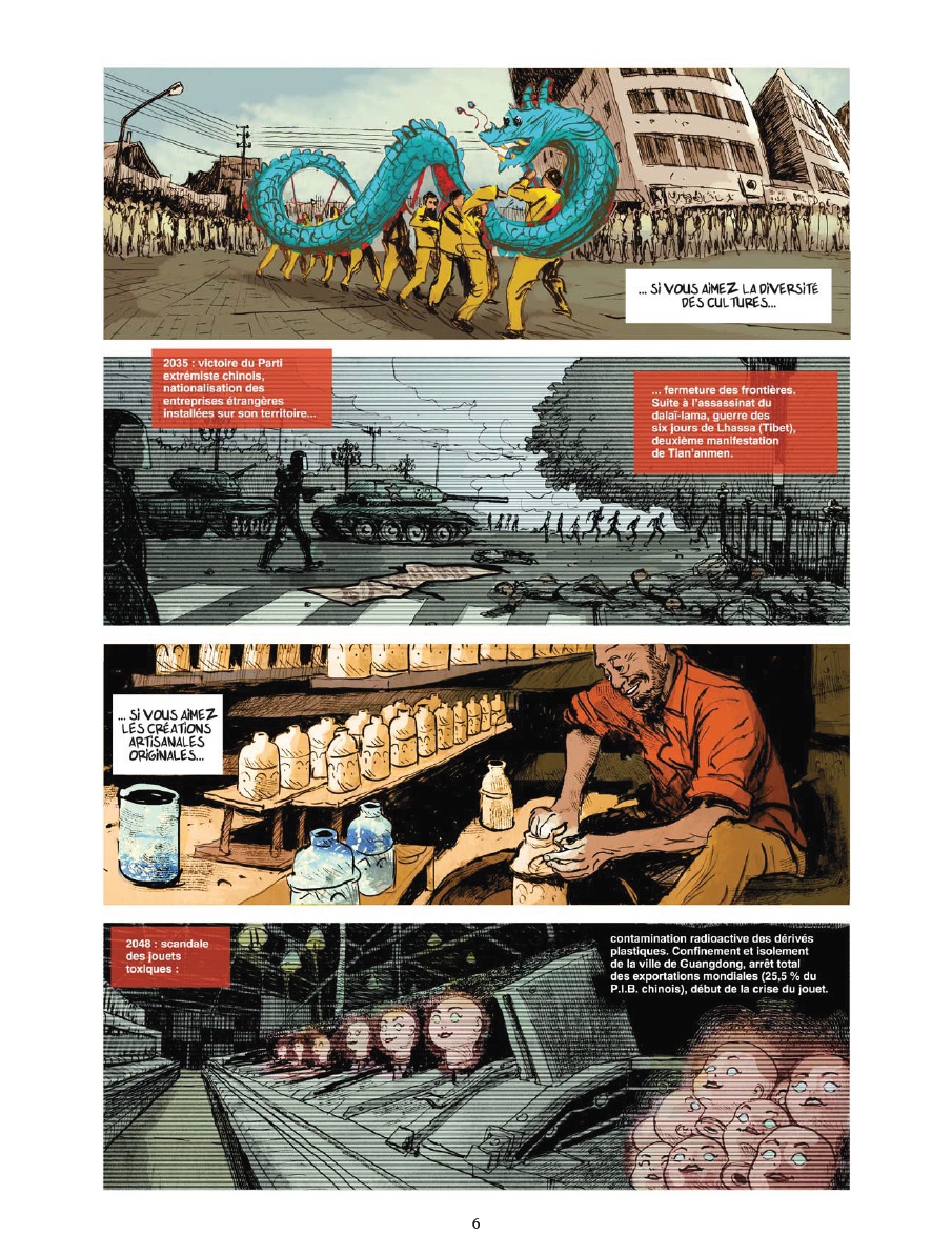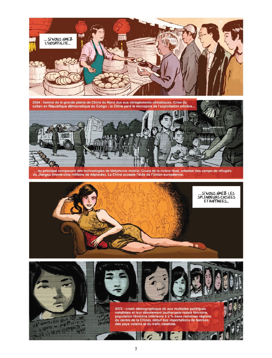 C’est une étrange histoire que nous propose Ducoudray ! partant des conséquences de la politique de l’enfant unique (entre 1979 et 2015), il nous présente une vision de la Chine dans un futur proche (dans une cinquantaine d’année) assez noire – après avoir rapidement évoqué quelques chamboulements, crises et autres guerres ayant eu lieu dans l’intervalle. En cette fin de XXIème siècle, un énorme déséquilibre entre sexes rend les femmes extrêmement rares et recherchées. Elles sont même devenues le principal « produit » trafiqué, vendu et exploité sous le manteau, avec en arrière-plan une dictature. Le héros a vu sa petite sœur enlevée par des trafiquants, et il n’a depuis de cesse de la chercher, traversant mille épreuves – toutes plus glauques les unes que les autres. La chute est encore plus noire et ironique, Ducoudray nous proposant une vision noire de la nature humaine – et des femmes finalement aussi monstrueuses et froides que des hommes – ce qui est à la fois rassurant et inquiétant ! La narration est globalement fluide, même s’il y a clairement des sautes dans l’intensité, quelques longueurs (en particulier dans le passage dans le désert près de l’ancien chantier ferroviaire), et quelques facilités. Mais ça se laisse lire, sans que jamais on ne sorte d’une noirceur poisseuse – alors que le héros, prêt à tous les sacrifices pour retrouver sa sœur, semble être le seul à garder quelques sentiments « humains » dans le cloaque auquel ressemble la Chine dans cette dystopie. Une histoire relativement originale, mais un peu monocorde, elle m’a un peu lassé avant la fin. Une fin qui ne donne pas foi en l’Homme (ou la femme…).