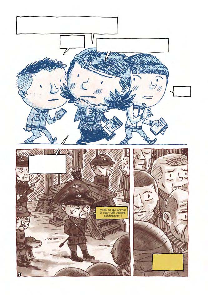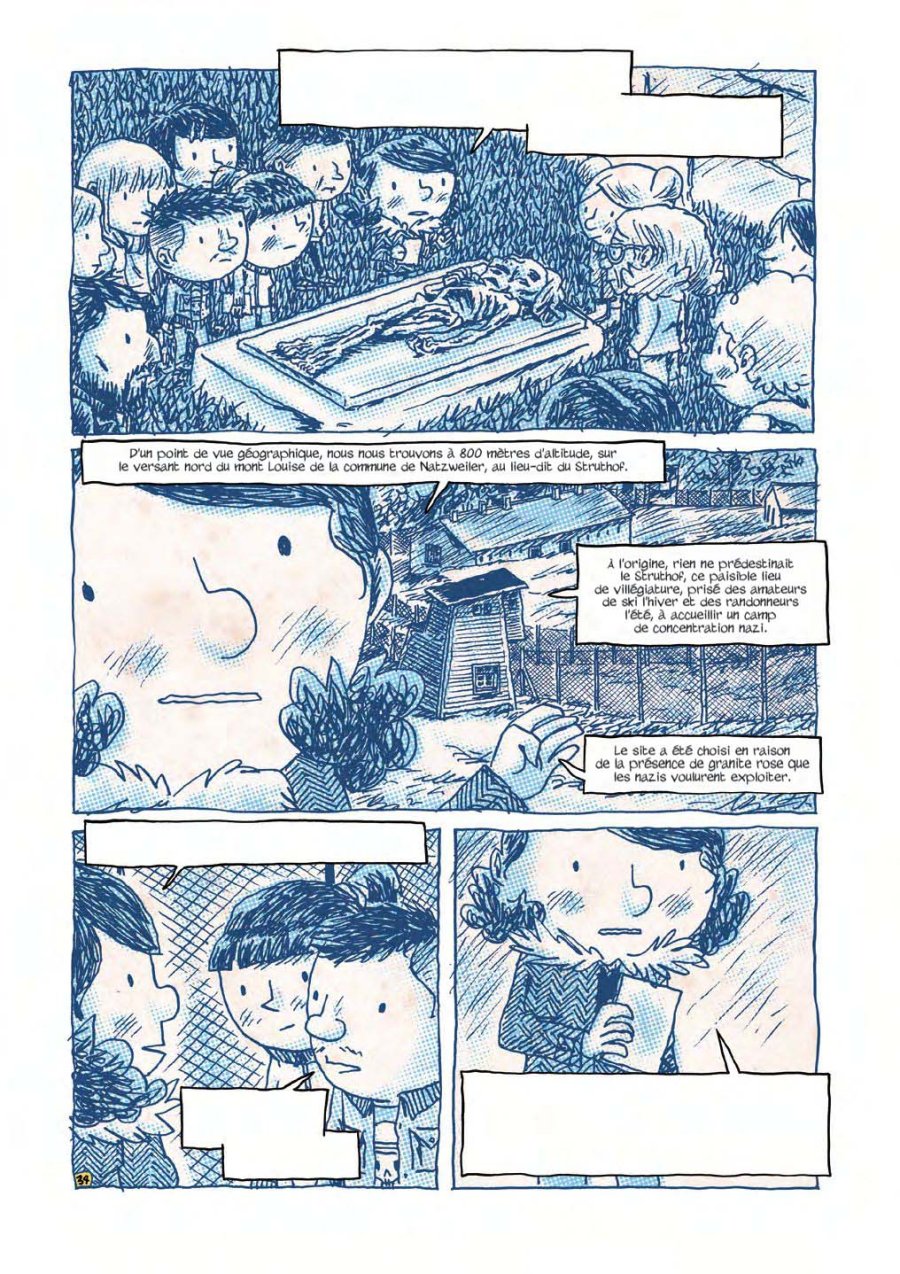 Elles sont nombreuses les BD qui parlent de la Shoah, des actes de barbarie perpétrés par les Nazis avant et pendant la deuxième guerre mondiale. On parle beaucoup de camps de concentration et d'extermination tels qu'Auschwitz ou Dachau, mais on oublie qu'il y en a eu un sur le territoire français, en Alsace. C'est ainsi que Yaël Hassan, autrice "spécialiste" de la Shoah et de la seconde guerre mondiale, a voulu mettre la lumière que ce site, au travers de l'histoire de Simon, un collégien de la région, et de sa grand-mère, elle-même fille d'une déportée, qui vont visiter ce camp. On est vraiment dans leurs pas, d'abord dans la préparation, avec notamment la transmission du témoignage familial. Et lorsque le groupe arrive au Struthof, on nous explique bien comment le camp était organisé, sur beaucoup de plans. La guide sur place ne manque pas de livrer plusieurs anecdotes, de donner des noms, car comme l'indique le prof de la classe, il faut penser aux personnes déportées, exécutées ou mortes des privations comme à une multitude d'individus, qui avaient une famille, des rêves, des émotions, et non comme une masse informe, anonyme. Le camp subsiste sous la forme d'un lieu de mémoire, d'exposition, avec des photos, des films, des textes, des œuvres d'art inspirées par cette immense tragédie. On est bien sûr horrifiés, comme ces enfants, de ce qu'il s'est passé sur ce camp installé sur le Mont Louise, un lieu choisi pour son gisement de granite rose. Un récit tétanisant, mais mené de main de maître par Yaël Hassan. On peut s'tonner de prime abord du choix de Marc Lizano pour illustrer cette histoire. Il est en effet essentiellement connu pour ses albums destinés à la jeunesse, avec son trait faussement naïf, ses personnages aux grosses têtes rondes. Mais on peut comprendre ce choix par le prisme de certains de ses albums précédents, comme L'Enfant cachée ou encore Un Grand-père tombé du ciel. Son dessin expressif se prête en effet à merveille à traiter de sujets parmi les plus graves. Au-delà de cette visite, fictive mais fortement inspirée de ce que les enfants du secteur ont pu vivre et voir, l'album est complété par un cahier didactique, destiné aux jeunes générations, comportant plusieurs lexiques sur la déportation, la Résistance ainsi que la biographie d'une dizaine de déportés cités dans la BD. Essentiel.