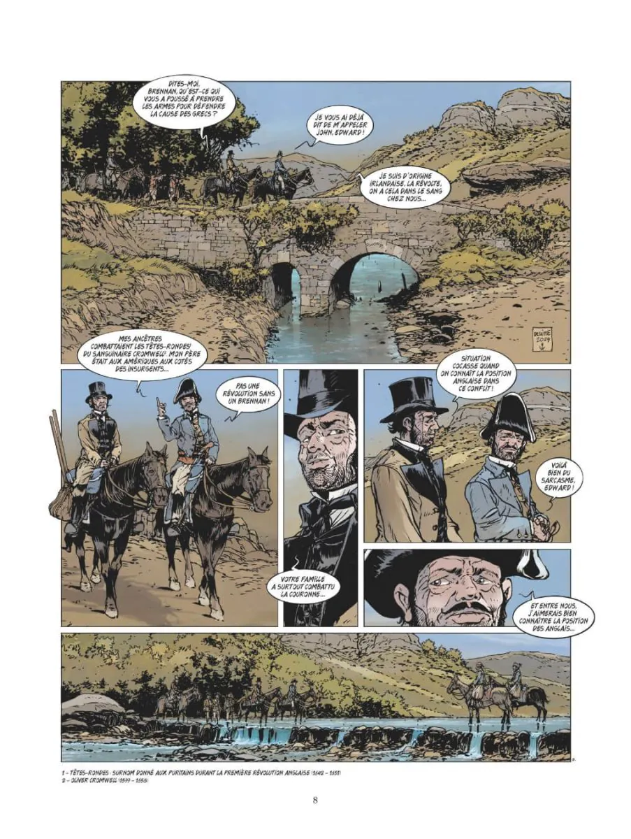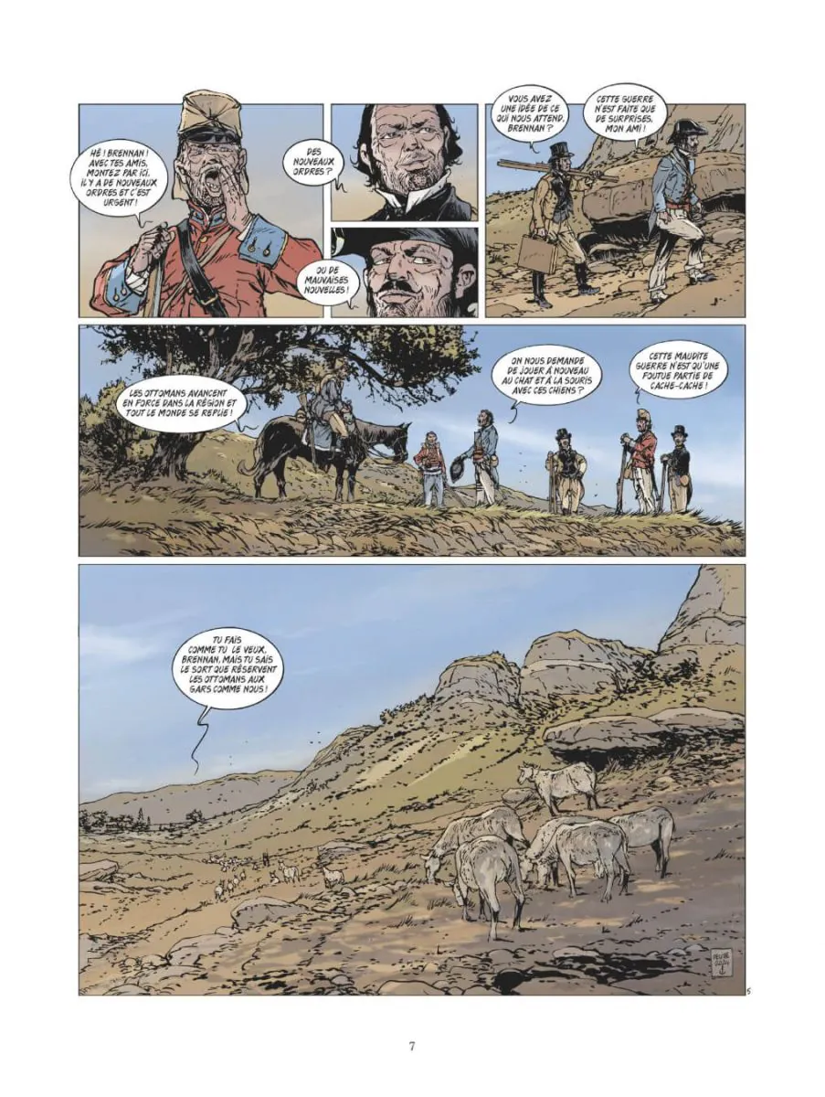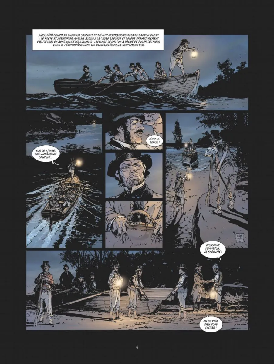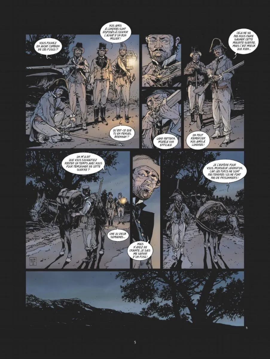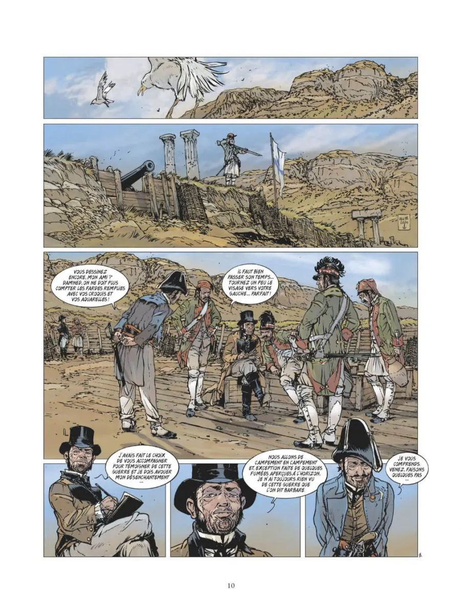 Après avoir attaqué cette collection avec les grandes batailles célèbres et bien documentées, Delitte est bien obligé d’aller dénicher celles que l’Histoire a moins mises en avant. Cela permet au lecteur que je suis de découvrir des conflits « secondaires » et des batailles que je ne connaissais pas du tout. Mais ce sont aussi des batailles qui ont moins d’impact que les plus célèbres déjà traitées. Et ici, la bataille elle-même est assez minimaliste. Pas par le bilan : des milliers de victimes, des dizaines de navires coulés ou sévèrement endommagés. Non, c’est une bataille qui visiblement s’est déclenché « par hasard », au gré d’incompréhension, alors qu’une flotte franco-anglaise (avec en appui des Russes) s’était positionnée presque bord à bord avec des navires turcs, pour les impressionner et tenter de leur faire lâcher la pression sur les indépendantistes grecs. Du coup, la bataille en elle-même se résume à une séance de tir à bout portant, où stratégie, tactique n’ont joué aucun rôle. Comme à son habitude, Delitte – ici seul à la manœuvre – fait précéder cette bataille, sur les deux premiers tiers de l’album, d’une « histoire », pour « faire passer le temps », et aussi pour présenter le contexte, au travers d’un jeune peintre/aventurier anglais romantique, Edward Levington, sorte de Byron en moins consistant, qui rejoint les révoltés grecs, puis la flotte anglaise. Son nom est l’occasion pour Delitte de placer un jeu de mots (il est interpelé au début par un « Monsieur Levington je présume ! »). Le dessin de Delitte est classique. Excellent pour tout ce qui est navire, gréements. Bon pour le reste, mais toujours avec le même type de visages « carrés », parfois difficiles à différencier. L’ensemble se laisse lire, sans plus. La faute sans doute à une bataille qui en elle-même n’est pas extraordinaire. Mais aussi à une narration un peu mollassonne. Comme je l’ai remarqué à plusieurs reprises, Delitte reprend dans ses texte plusieurs passages du court dossier final (qui du coup est un peu redondant). Je commence à avoir lu la majorité des albums de cette collection, et ça doit être la troisième fois (pour des batailles différentes donc) je crois que Delitte explique dans son dossier final que cette bataille sonne le glas des navires à voiles, qu’elle est la dernière bataille opposant ce type de navire… Il faudrait savoir… A réserver aux amateurs d’Histoire (dont je suis), mais il manque quand même à cet album – ou à la bataille qui en est au cœur – quelque chose pour dynamiser la lecture. Note réelle 2,5/5.
