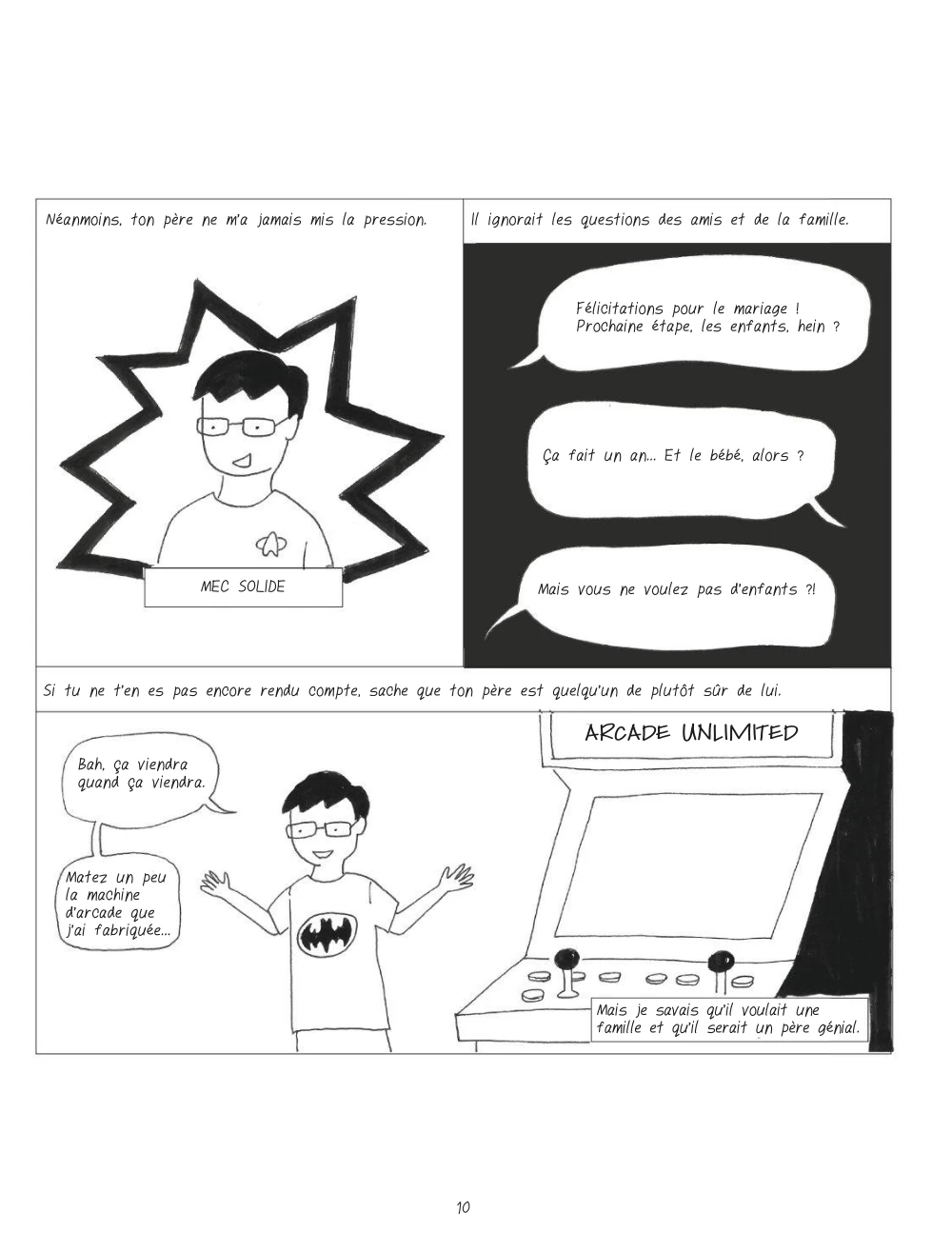 2.5 J'ai remarqué que ses dernières années il y a eu plusieurs bandes dessinées sur les problèmes que les femmes rencontrent lorsqu'elles sont enceintes et aussi après l'accouchement. Est-ce que c'est parce que le monde de la BD est de plus en plus féminines et qu'on a donc des autrices qui peuvent parler de choses que les auteurs ne vivent pas ? En tout cas, ici, l'autrice raconte la dépression qu'elle a vécue après son accouchement et il semblerait que plusieurs femmes souffrent de ce type de dépression. Je ne connaissais pas du tout la dépression post-partum et ça me rends triste de savoir qu'autant de femmes se sentent inutiles et tristes après avoir donné naissance à un être humain. Cela dit, ce n'est pas parce qu'une BD parle d'un sujet intéressant que cela donne automatiquement une BD intéressante. Le dessin est minimaliste au possible, mais au moins c'est lisible et ce n'est pas très moche. Les anecdotes de l'autrice sont inégales avec certaines qui sont meilleurs que d'autres. Au bout d'un moment, je trouvais que ça tournait un peu en rond. Peut-être que les femmes qui ont vécu une expérience similaire à celle de l'autrice vont plus accrocher et se sentir moins seules en voyant que d'autres ont vécu la même chose.