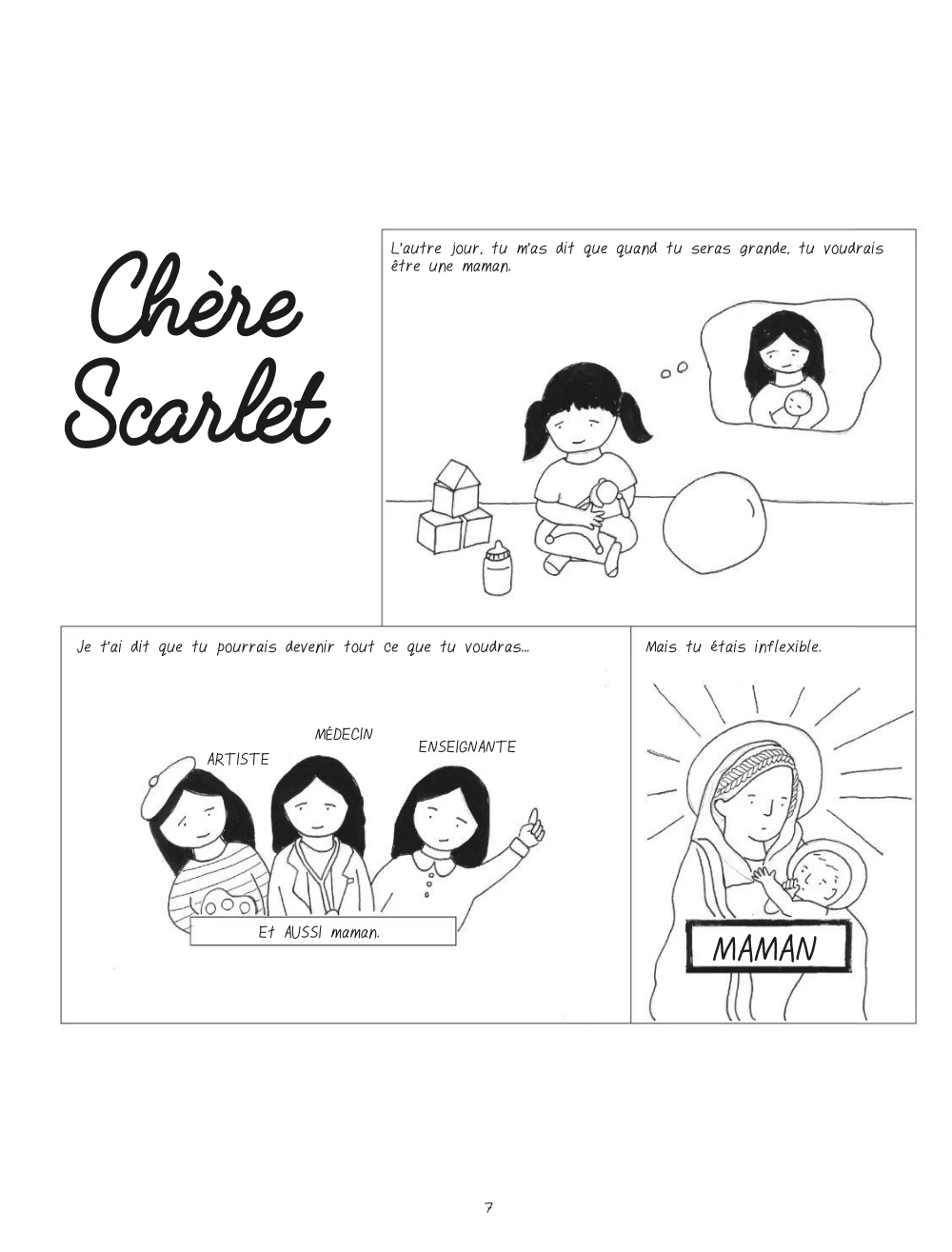 Dans ce roman graphique intime et émouvant, Teresa Wong écrit et illustre l'histoire de sa lutte contre la dépression post-partum sous forme d'une lettre à sa fille Scarlet. Déchirant et drôle, Chère Scarlet rend parfaitement compte du désespoir silencieux de celles qui souffrent de dépression post-partum et du profond sentiment de culpabilité et d’incompétence. Texte : L'éditeur