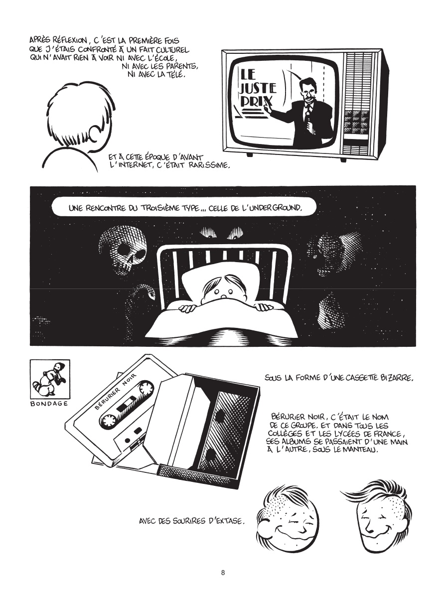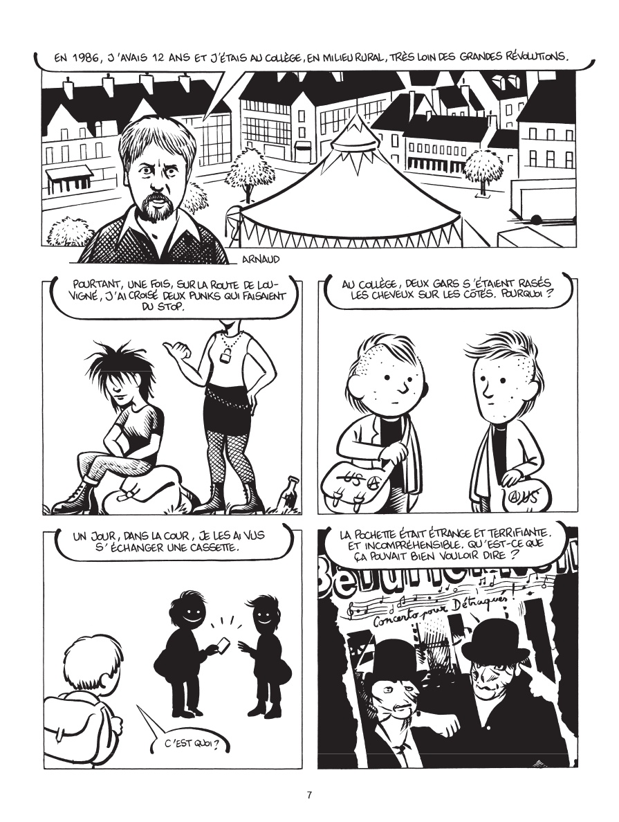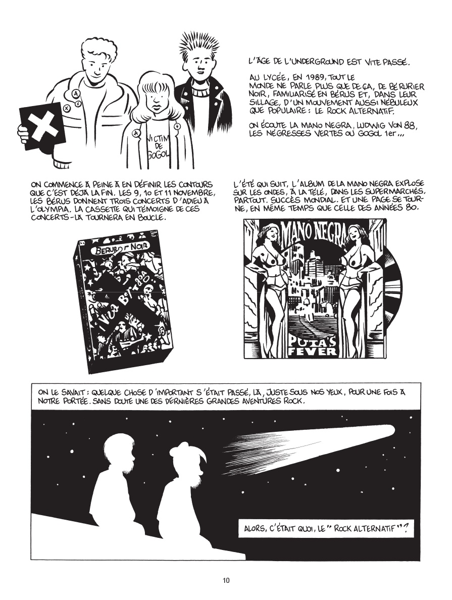 Les deux auteurs s’intéressent de longue date aux cultures et musiques qui sortent des sentiers battus (voir leur relativement récent Underground) dans la même collection de Glénat. Ici, ils s’intéressent au mouvement Punk en France – et à son dérivé « Rock alternatif », durant la décennie des années 1980 – même s’ils débordent un peu en amont et en aval de cette période. On sent que les auteurs sont à la fois connaisseurs, mais aussi « amoureux » de leur sujet, et qu’ils ont puisé aux bonnes sources pour construire leur documentaire, très détaillé, rempli d’informations de première main, mais qui sont toujours contextualisées. Car c’est aussi l’intérêt de ce documentaire de ne pas se contenter de l’aspect purement et uniquement musical, « artistique » (même si cet adjectif aurait révulsé certains des puristes punks des débuts), et de toujours l’inscrire dans un contexte politique et social plus général. La fin du Giscardisme, l’arrivée de la gauche au pouvoir (les progrès et les rapides désillusions), la montée du FN sont autant de marqueurs forts, pour des groupes qui souvent se sont inscrits hors du système, mais dans les luttes sociales. Je n’ai découvert certains de ces groupes (Bérurier Noir, Ludwig Von 88) que vers 1988, un copain lycéen me les ayant fait écouter. Et je n’ai vu les Bérurier qu’une seule fois, lorsque je participais aux manifestations contre la réforme Devaquet (perchés sur un char, ils donnaient une pêche de folie aux manifestants autour d’eux !). Et la Mano Negra ou les Négresses vertes que j’ai écouté ensuite étaient un peu le feu de la comète, on était déjà dans quelque chose de plus « commercial ». Mais cet album se révèle à la fois factuel et intéressant, et les lecteurs peuvent (re)découvrir un pan de la culture populaire qui s’est développé sans – voire contre – les médias traditionnels (le mépris et le et le refus de collaborer étant sans doute réciproques, tout du moins jusqu’à la fin des années 1980).