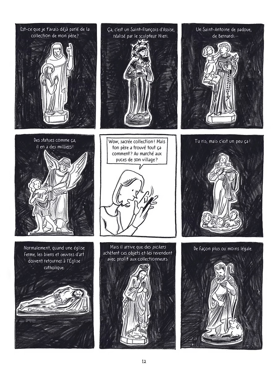 Qui veillera à sauvegarder ce pan essentiel de notre histoire avant qu’il ne s’efface pour de bon? Sans nostalgie ni complaisance, la journaliste Isabelle Lareau interroge membres du clergé, collectionneurs privés et revendeurs en tous genres sur les traces de ce legs complexe. Une enquête magnifiée par le dessin fidèle et détaillé de Francis Desharnais, qui rend justice à la richesse de ces trésors ignorés du plus grand nombre. Texte : L'éditeur
