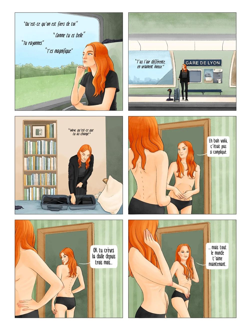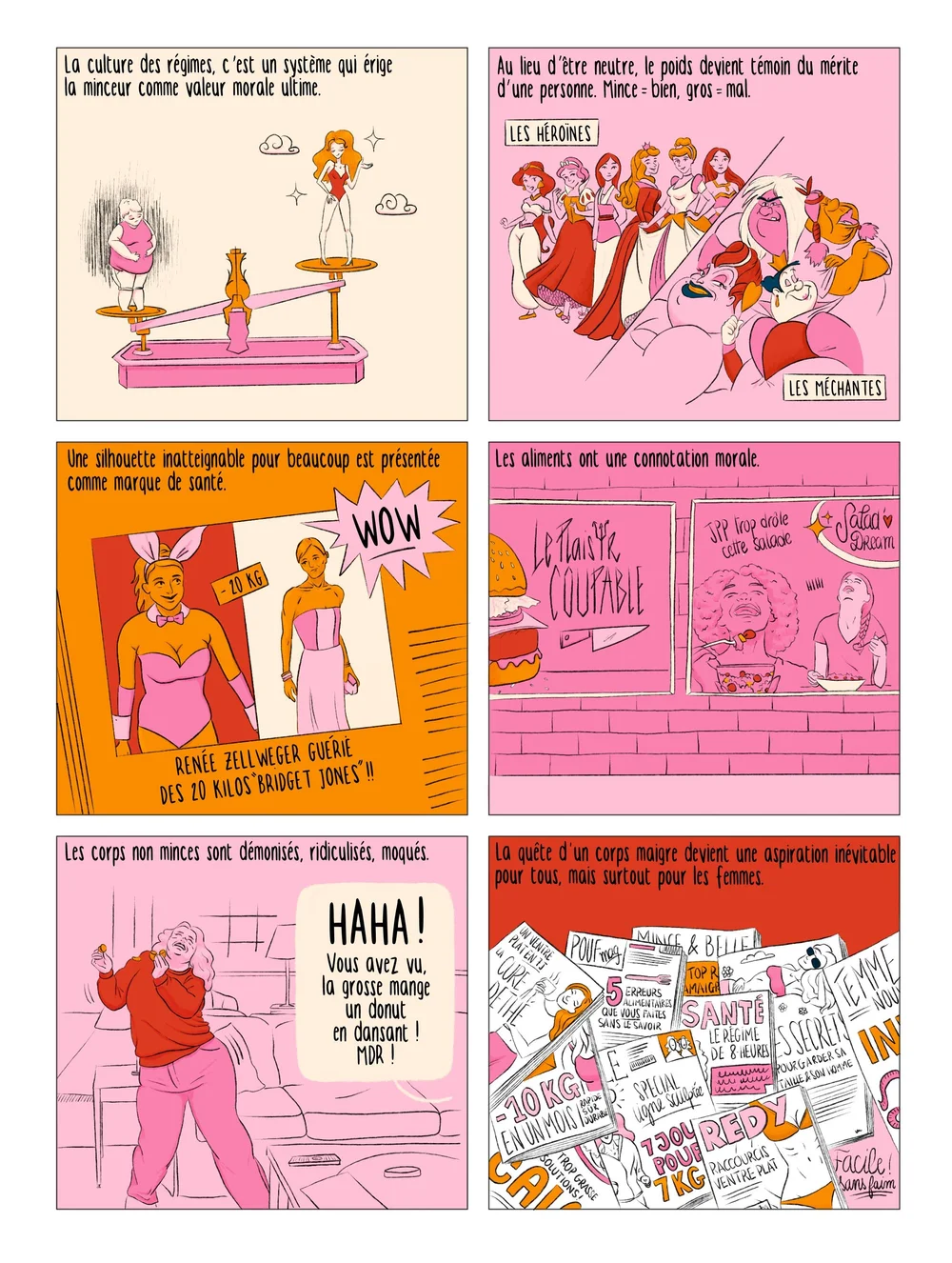 Si l’album est vaguement romancé, et que l’héroïne se prénomme Paula, il semblerait qu’Hermine nous raconte ici quelque chose d’autobiographique. L’album est donc uniquement centré sur Laura, qui monologue, discute avec sa psy, ou a quelques échanges avec ses parents ou quelques amis. Tout tourne autour de ses obsessions – directement liées aux injonctions de la société, relayées par amis, collègues, parents – pour lesquelles Laura devrait être « belle », c’est-à-dire sans « gras superflu ». Au milieu des dépressions, des régimes plus ou moins violents et exotiques, des tentatives pour cacher à ses proches son mal-être et ses kilos sous disant en trop, Paula cherche à émerger, à trouver une solution. Déjà à s’accepter telle qu’elle est. Et comprendre les mécanismes à l’œuvre. En fin d’album, de nombreuses ressources (numéros verts/hotlines, bibliographie, associations) pouvant aider ceux et celles (les femmes étant plus touchées que les hommes par les injonctions sociétales) qui rencontreraient les mêmes soucis que Paula. Le dessin est statique, avec quelques itérations iconiques, et la narration n’est pas non plus très dynamique. Mais l’essentiel est sans doute ailleurs, l’album a surtout valeur d’exemple, de lecture propice à déclencher un processus de sortie d’une spirale négative (qui peut mener au suicide).