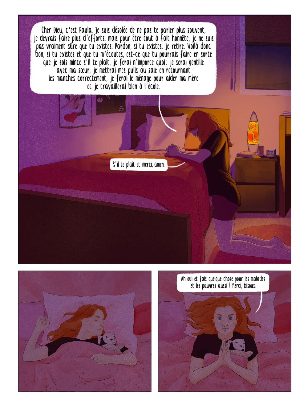 Dans Moi, Paula, 25 ans, 10 ans de privation, la jeune Paula entame un dialogue sincère avec sa psychologue, figure rassurante qui l’accompagne dans un voyage introspectif à travers son passé. À travers des souvenirs d’enfance et d’adolescence, l’album retrace les origines profondes de son mal-être et de ses troubles du comportement alimentaire, qui culminent à ses 25 ans. Peu à peu, se dessine le portrait d’une jeune femme en quête de réconciliation avec son corps et d’une estime de soi longtemps fragilisée. L’album aborde les thèmes complexes de la santé mentale qui mènent à la dysmorphophobie. Malgré la gravité du sujet, le ton est empreint de drôlerie. Les troubles du comportement alimentaire sont encore une pathologie taboue.