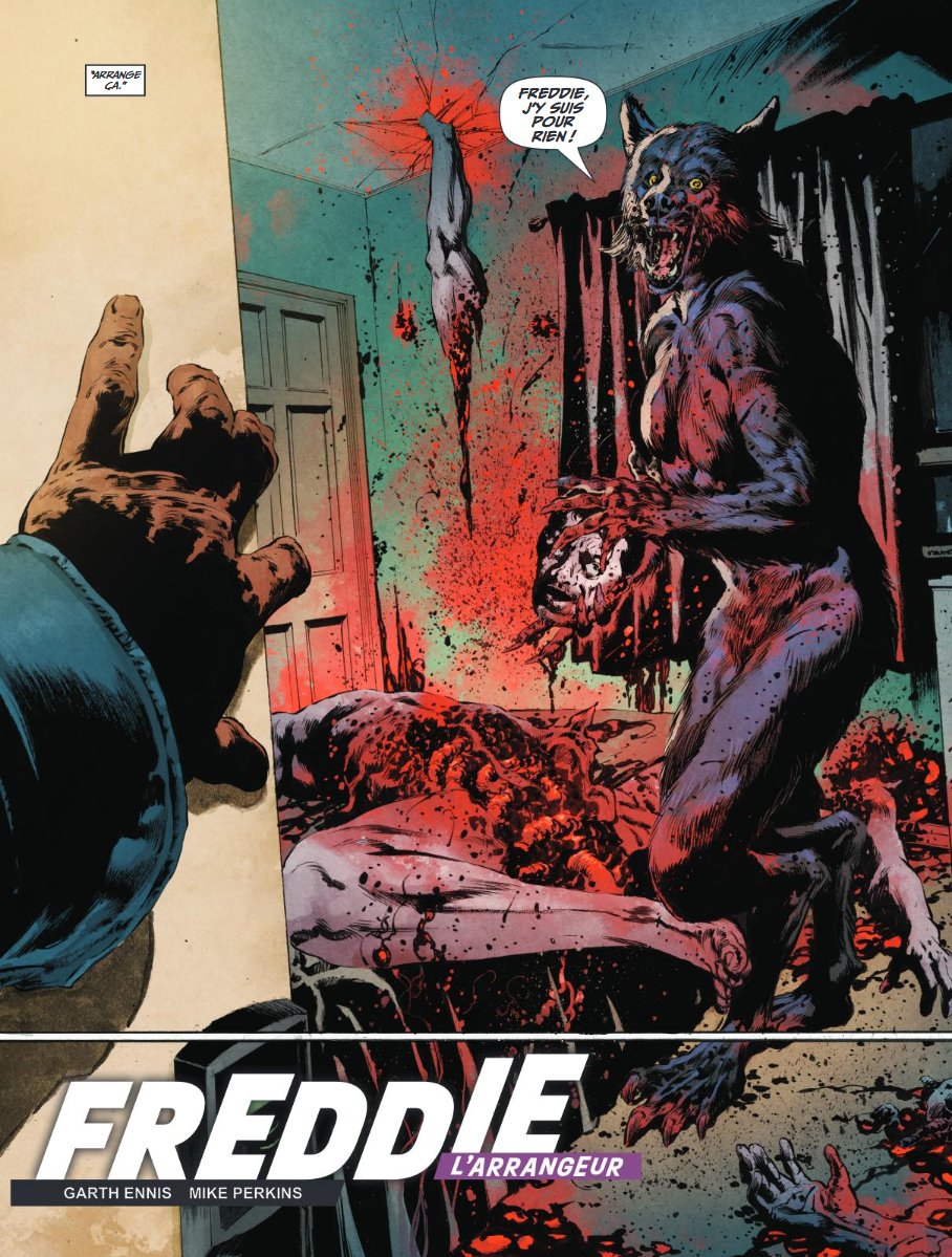 Dans le genre scénario complètement barré, j'avoue que là on a du lourd ! J'en étais encore à me demander quel était l'énergumène qui avait pu nous pondre un opus aussi disjoncté quand j'ai réalisé que c'était Garth Ennis, le scénariste de la série The Boys... Aaahhhhh ba oui, du coup je comprends mieux ! Avec ce oneshot fantastique, il ne déroge pas à ses habitudes et nous propose un récit où se mêle fantastique, trash, humour (noir souvent) et un petite touche de cul. Cocktail explosif s'il en est, son Freddie, s'il n'est pas Krugger, n'est pas loin de croiser régulièrement les griffes de la nuit. Son boulot ? Faire le ménage après le pétage de plombs de superstars qui sont en réalité des créatures fantastiques. Sauf qu'une fois bien parties, ça dérape sévère du côté des starlettes... Un loup garou bourré ou un extraterrestre défoncé, ça éparpille vite façon puzzle un humain pas prévenu ! Et c'est Freddie qui gère... Il faut donc aimer les scénarios bien perchés qui défrisent pour apprécier l'album. Pour ce qui est du dessin, on retrouve le trait classique pour du comics de Mike Perkins, que j'avais découvert et apprécié avec un autre récit d'horreur : La Malédiction de Rowans. Il maitrise bien son bestiaire fantastique & Co : parfait pour l'exercice. Passé la surprise du pitch, on se surprend même à finalement trouver tout ça un peu court, les 42 pages de l'album sont vite avalées façon T-Rex !
