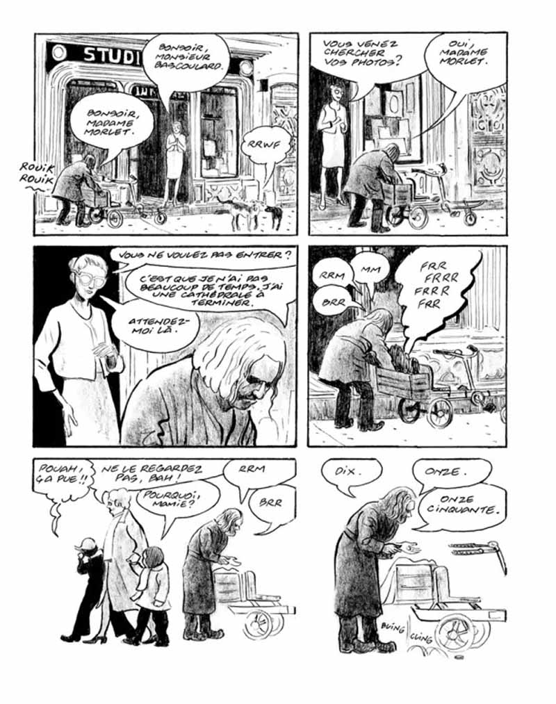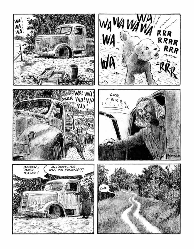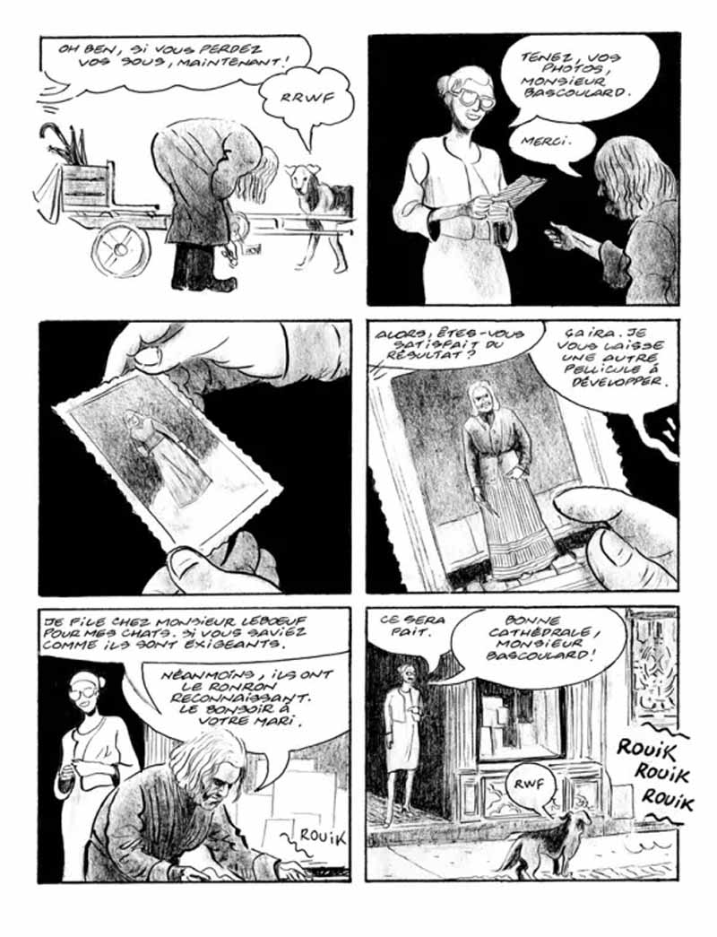 Mais qui était donc « Marcel Bascoulard » ? Un illustre inconnu, dans le vrai sens du terme, puisqu’on ne peut pas dire que le personnage disposait d’une notoriété extraordinaire. Et pourtant. Une fiche Wikipédia lui est bel et bien consacrée. Pour tout habitant de Bourges, avant sa disparition en 1975, il était impossible de ne pas le remarquer dans ses accoutrements féminins — il adorait poser en robe devant les photographes —, il était ce qu’on appelle une figure ! Dans la cité berrichonne, il a même une place à son nom ainsi qu’un buste en bronze, dans le quartier Avaricum qu’il fréquentait souvent. Mais surtout, Marcel Bascoulard était un artiste, dans le vrai sens du terme également. Sa vie se confondait avec son art, mais il n’était pas fan des honneurs, lui dont le travail a été remarqué dans diverses expositions. Armé de ses crayons et de son carton à dessin, il passait beaucoup de temps à déambuler sur son « étrange tricycle couché », dans les quartiers de Bourges, à dessiner ses rues et ses monuments. On lui commandait ses dessins, ce qui lui permettait de subsister, mais l’homme, attaché à sa liberté de clochard céleste, préférait vivre à l’écart, dans un abri de jardin ou un camion épave, en compagnie de ses chats et de son chien Bobby. S’il était plus connu pour ses représentations réalistes de la ville, sa vraie marotte était l’art abstrait, malheureusement moins rentable sur le plan pécuniaire. Sa plus grande malédiction fut d’avoir pris sous son aile un jeune marginal qui s’était révélé n’être qu’un voyou intéressé par les revenus issus de la vente de ses œuvres, n’hésitant pas à le menacer s’il se montrait réticent. La suite tragique, on la connaît à la lecture du livre… Ce personnage haut en couleurs détonnait dans le paysage. Il déconcertait le citoyen lambda, effarouchait le bourgeois, et pouvait provoquer la révulsion par le fait qu’il ne se lavait jamais. Il n’aurait pourtant jamais fait de mal à une puce, même une nuée, laquelle le lui rendait bien… mais il ne laissait personne indifférent. Incontestablement fascinant, c’était peut-être sa liberté indomptable — et si voyante ! — qui dérangeait les « honnêtes gens », bien plus que les effluves généreux qu’il laissait dans son sillage. En réunissant des petits morceaux de puzzle, Frantz Duchazeau est parvenu à composer le portrait passionnant d’un artiste attachant, dans les dernières années de sa vie, un artiste dont on perçoit les blessures remontant à l’enfance et qui ont fait de lui ce qu’il était. C’est ainsi que l’auteur nous immerge dans cette bonne ville de Bourges, dans ses faubourgs et sa campagne environnante, là où l’artiste avait élu domicile. L’histoire se laisse littéralement dévorer, tant l'homme fascine, quand bien même il ne se passe rien d’extraordinaire. On retiendra tout de même la scène cocasse d’un Stéphane Collaro courant frénétiquement après un Bascoulard récalcitrant, n’hésitant pas à salir ses beaux souliers dans la gadoue campagnarde, pour tenter de lui extorquer quelques mots. Comme on pourra s’en rendre compte, la priorité pour Collaro n’était pas tant de rencontrer Bascoulard que d’obtenir l’interview d’une « bête de foire », qui à coup sûr ferait un carton dans son émission de radio. Duchazeau a opté pour un trait simple et humble, en noir et blanc. Le co-auteur des « Cinq conteurs de Bagdad » ayant pour habitude de dessiner d’un seul jet, oscillant entre dépouillement graphique et minutie des détails, il s’est concentré ici sur les poses et attitudes de Bascoulard, conférant à l’ensemble une belle authenticité. Dans une sorte de communion avec notre clochard céleste, il reprend également à son compte des représentations de Bourges et des environs, en glissant çà et là, une vue de la cathédrale, d’une place avec ses maisons à colombages, ou d’une simple locomotive à vapeur. « Marcel Bascoulard », c’est le bel hommage à un artiste énigmatique qui souhaitait s’effacer tout en restant visible, à la fois humble et un brin provocateur. Son look improbable faisait tache dans un contexte ultra-conventionnel, comme le révélateur d’une époque où la question de la domination masculine et du féminisme commençait à peine à secouer le débat public. On devra se référer à l’évocation de son père violent pour mieux comprendre. A titre personnel, j’ai découvert Marcel Bascoulard l’an dernier, le temps d’un week-end à Bourges. Je suis tombé complètement par hasard sur une photo du personnage affichée discrètement dans la vitrine d’un photographe, peut-être là où l’artiste venait poser du temps de son vivant. Je n’en avais jamais entendu parler auparavant, mais mon regard semble avoir été comme aspiré par ce portrait. J’étais donc ravi de la sortie de l’ouvrage qui m’a permis d’en savoir plus, et n’ai pas été déçu, tant s’en faut. J’irais même plus loin, cette bande dessinée est un de mes coups de cœur de ce début d’année.
