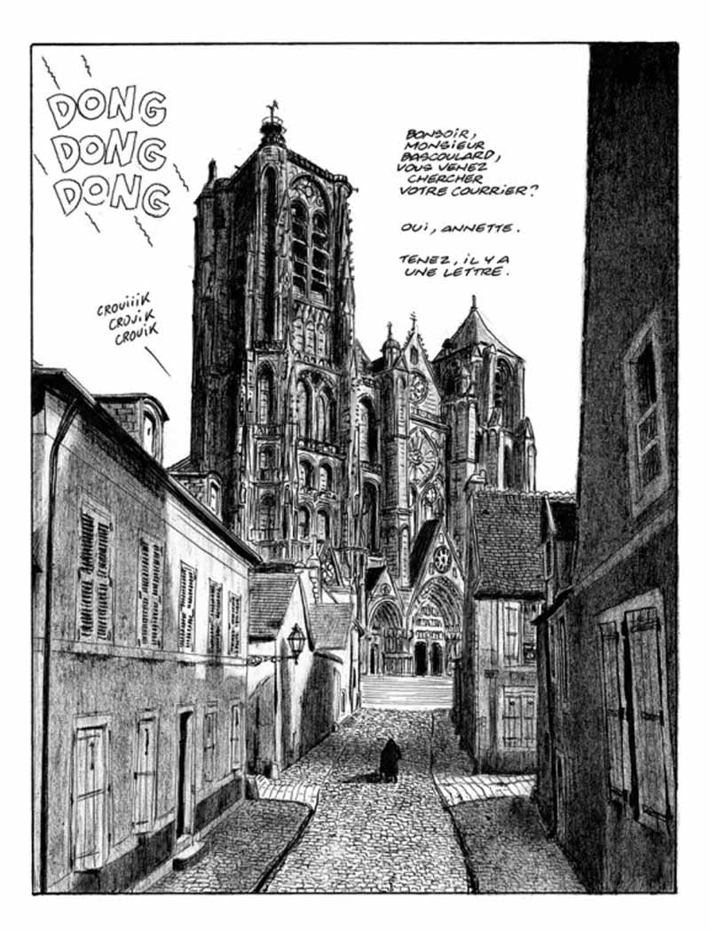 Un homme courbé, que de loin on imagine vieux, pousse une étrange carriole, à travers les ruelles froides et moyenâgeuses de Bourges. Il fait presque jour ; pas encore. Il se cale, sort une feuille de papier immaculée et commence à dessiner méticuleusement le vaste vaisseau de pierre qui se dresse, puissant, dans la lumière fraîche : la cathédrale de Bourges. Pas une arche fine n’est oubliée, il s’applique. La ville s’éveille peu à peu, les gens le croisent sans le voir, peu le saluent, presque personne ne s’approche de cet homme loqueteux : il se gratte follement et pue. À la fin de sa journée de labeur, il retraverse la ville, chacun se hâte pour se mettre au chaud. À la périphérie, il rentre dans une boucherie où il est accueilli. Contre un dessin, il accepte un peu de mou pour ses chats. Il repart. Il fait nuit maintenant, il emprunte un chemin malaisé, gorgé d’eau, où les roues de son tricycle s’enfoncent. Il pousse, il patine, il avance. Son chien aboie, le voilà dans son paradis, cabane camion, camion épave, fait de tôles et de pneus ramassés. « Là mon beau, là, tiens c’est pour toi… ». Mais qui était donc ce Bascoulard, ce pèlerin étrange qui déambulait en habits de clochard ou vêtu en femme, un crayon et quelques feuilles toujours à la main ?…