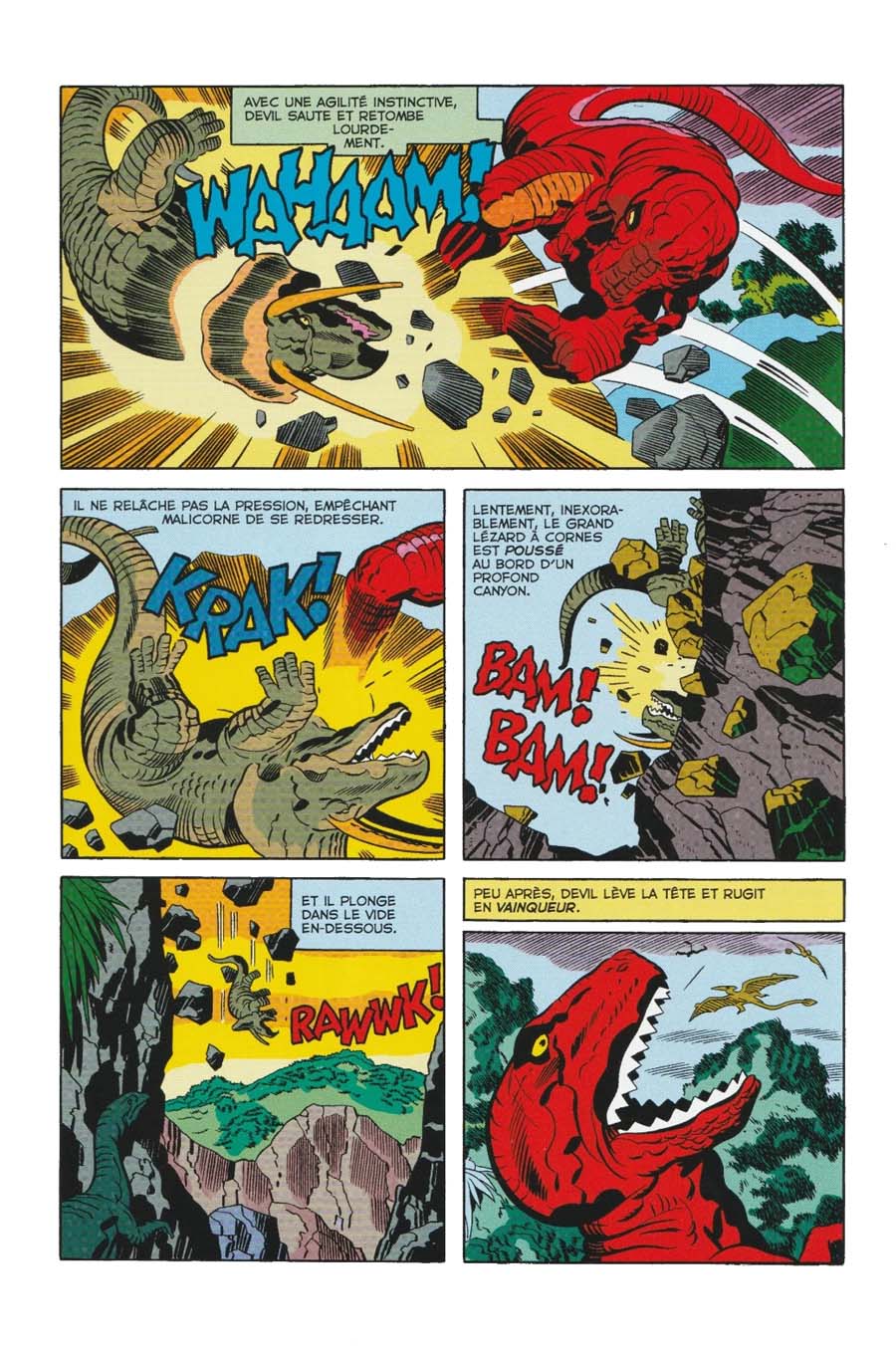 Dinosaures de pacotille, aventure grand spectacle authentique - Ce tome regroupe l'intégralité des épisodes de la série Devil Dinosaur, soit 9 épisodes de 17 pages chacun, initialement parus en 1978. Ils ont tous été écrits, et dessinés par Jack Kirby. L'encrage est réalisé par Mike Royer, et la mise en couleurs par Petra Goldberg (les couleurs n'ont pas été refaites, elles ont été ravivées.). Dans des temps immémoriaux, quand les dinosaures existaient encore, un tyrannosaure à la peau rouge (d'où son nom de dinosaure du Diable) fait régner sa loi dans une vallée. Un concours de circonstances l'a amené à tolérer la présence, et même à s'attacher à un hominidé (déjà plus homme que singe) appelé Moon Boy. Au cours des deux premiers épisodes, cet improbable duo va devoir affronter une tribu agressive ayant décidé de reprendre le contrôle de la vallée, en tendant un piège à Devil Dinosaur, avec des épieux plantés dans une fosse. Puis ils devront faire face à un humanoïde géant belliqueux (épisode 3), des robots extraterrestres colonisateurs (épisodes 4 à 6), une intelligence artificielle laissée par les extraterrestres (épisode 7), une tribu dompteuse de dinosaures (épisode 8). Le tome se termine en apothéose avec un passage temporel qui projette Devil Dinosaur dans une région habitée du Nevada en 1978. Ce tome comprend également les pages de texte écrites par Kirby pour les épisodes 1 à 4, pour justifier de la licence artistique qui fait coexister proto-humains et dinosaures, et le courrier des lecteurs succincts des numéros 5 et 6. Il s'achève avec une courte page retraçant la carrière de Kirby de manière expéditive. En 1970, Jack Kirby avait quitté Marvel pour aller travailler chez l'éditeur concurrent DC Comics, où il a réalisé des séries comme Le Quatrième Monde, Les Losers, Le Démon, O.M.A.C., Kamandi . De 1976 à 1978, Jack Kirby revient travailler pour Marvel Comics sur des séries comme Les Éternels (Jack Kirby), Machine Man - Le Robot vivant, 2001, a space odyssey, Black Panther - Le monde va disparaitre ! et Captain America, où il est son propre scénariste. "Devil Dinosaur" a été réalisé pendant cette période, où Jack Kirby était également son propre responsable éditorial. Jack Kirby a beau expliquer tant et plus que vu le nombre de milliers d'années dont les scientifiques ne savent rien, il n'y a pas de raison qu'il n'y ait pas pu avoir coexistence entre dinosaures (ayant disparu il y a 65 millions d'années) et hominidés (apparus il y a 2,5 millions d'années), les faits ont la tête dure, et il s'agit bel et bien d'une licence artistique. Il a beau expliquer en cours d'épisode que les phylactères et les bulles de pensée retranscrivent librement le langage primitif de Moon Boy et du petit peuple, les tournures de phrase au relent shakespearien détonnent. Il a beau expliquer que parmi les dinosaures, certains devaient disposer d'une intelligence supérieure aux autres, le comportement de Devil Dinosaur est parfois dicté par des intuitions ou des stratégies plus humaines qu'animales. En outre, Kirby n'hésite pas à intégrer des éléments anachroniques (les dompteurs de dinosaures), ou issus de mythologies postérieures de plusieurs millions d'années (un géant, des extraterrestres, ou encore une faille spatio-temporelle de type Triangle des Bermudes). Ces épisodes sont donc à prendre comme des divertissements issus de l'imagination fertile de Jack Kirby, et certainement pas comme un témoignage au premier degré. L'aventure est au rendez-vous avec des affrontements physiques à chaque épisode, des événements surnaturels, un soupçon d'anticipation, de nombreux rebondissements. Kirby est en pleine forme (graphique) dessinant les rochers mieux que jamais (cette texture de pierre inimitable), et conjurant une flore conceptuelle (aucune chance de reconnaître une plante ou essence d'arbre) pour des environnements sauvages et inhospitaliers. Cette vallée comprend un volcan qui crache régulièrement une épaisse fumée et quelques flammes, mais pas de coulées de lave. Kirby ne vise pas le réalisme ou la reconstitution authentique, il souhaite plutôt capturer et faire passer par ses dessins la vitalité des hommes préhistoriques et la dimension primordiale de la nature. Il souhaite également transcrire la taille imposante des dinosaures, leur puissance physique et leur férocité. Là encore, il ne faut pas s'attendre à des dessins descriptifs, respectant scrupuleusement les dernières avancées paléontologiques. Il suffit de regarder la dentition de Devil Dinosaur sur la couverture pour constater que le dessin s'attache plus au caractère acéré des dents, qu'à leur forme exacte. De la même manière, la morphologie des dinosaures relève parfois de l'invention pure. Pourtant, impossible de rester de marbre devant ce tricératops (en tout cas cette représentation évoque l'idée de tricératops) en train de charger vers le lecteur, ou devant Devil Dinosaur lui-même avec sa puissance dévastatrice (et ses énormes muscles des cuisses). L'épisode 7 comprend une grande case (page 132) où Moon Boy évolue dans un plan d'eau dans lequel d'énormes brontosaures sont en train de se nourrir, magnifique image (en dépit des inexactitudes). Kirby prend également des libertés avec le régime alimentaire de ces monstres, Devil Dinosaur étant un herbivore (épisode 1, page 17). Pour les 6 premiers épisodes, Kirby a repris le dispositif qu'il avait inauguré dans la série Kamandi : un dessin pleine page pour la première page, suivi par un dessin occupant la double page suivante, pour une sensation de grand spectacle inégalable. Ces épisodes constituent des récits d'action, dans une ère mésozoïque fantaisiste. Jack Kirby reprend le schéma des histoires de superhéros dans le sens où Devil Dinosaur triomphe plus souvent de ses adversaires par sa force brute que par sa ruse. M