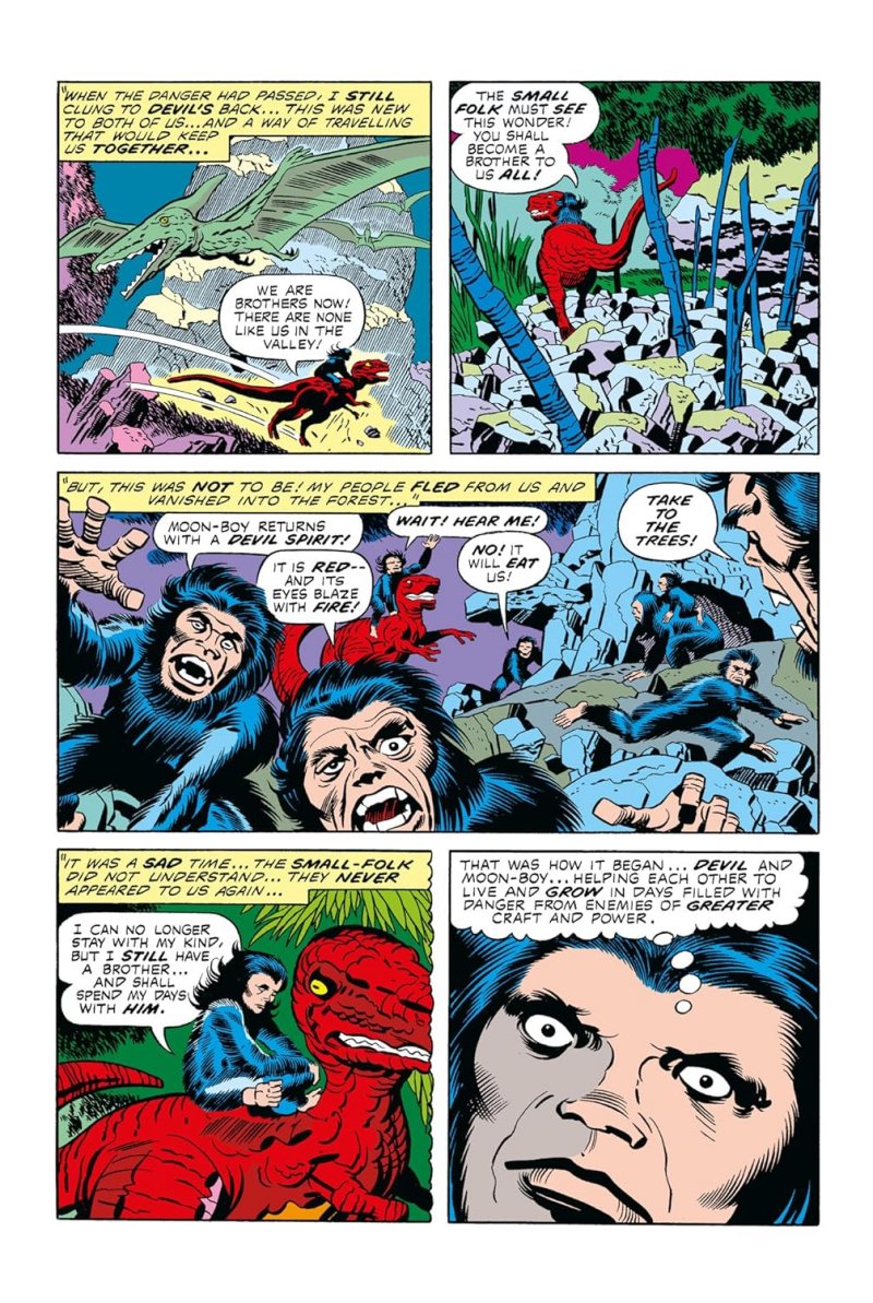 Originaire du monde des dinosaures, une terre primitive issue d'une dimension parallèle, le « lézard géant » Devil Dinosaur naît avec une peau verte éclatante. Mais lorsqu'une tribu l'attaque et tente de le brûler, il subit une mutation qui le transforme en créature rouge écarlate. Sauvé par le jeune Moon Boy, issu d'un peuple ennemi de ses agresseurs, Devil Dinosaur se lie d'amitié avec lui. Dès lors, les deux compagnons deviennent inséparables.