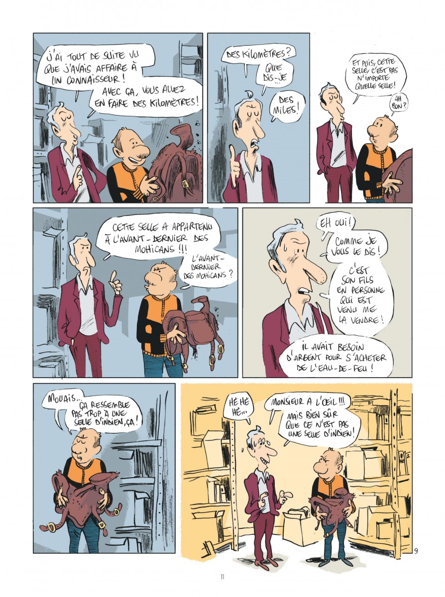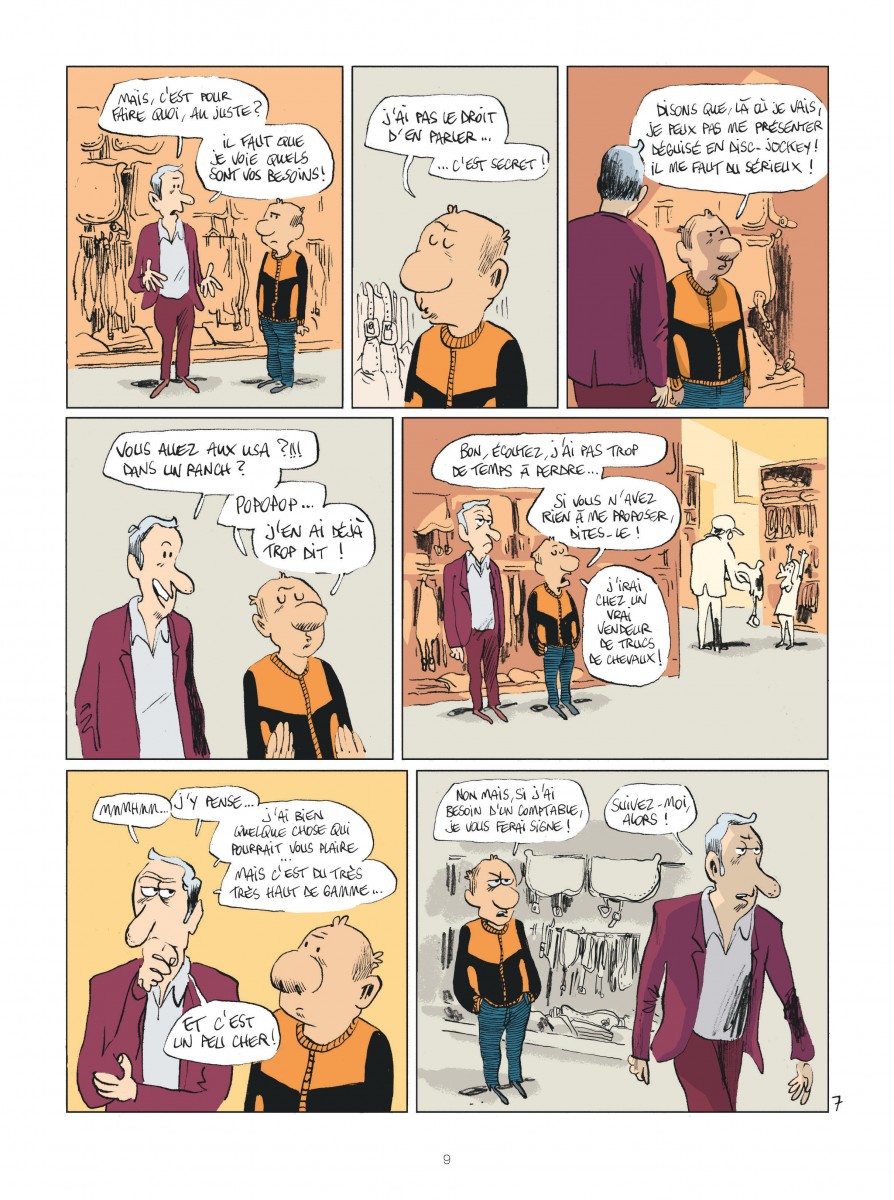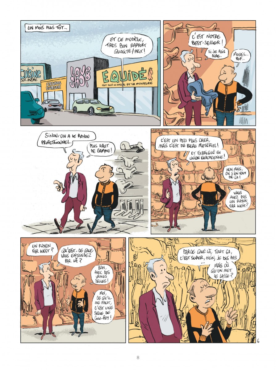 Guillaume Bouzard part dans le désert espagnol pour raconter les coulisses du tournage de la future série Lucky Luke... Mais voilà, c'est Bouzard. Donc on croise bien l'équipe, les décors, quelques acteurs aperçus le temps d'une case, et même Rantanplan, mais le véritable centre du livre reste Bouzard lui-même et sa capacité à être perpétuellement à côté de la plaque. Je suis un très bon client de son humour et, ici encore, il réussit à me faire franchement rire. Son sens de l'absurde, de l'autodérision et du décalage permanent fonctionne à plein régime : dialogues lunaires, situations inutiles mais savoureuses, gags franchement couillons (quand je dis que je suis bon client, j'ai éclaté de rire au nom de Ranplanplan), et détournement constant du principe même du reportage. Graphiquement, c'est du Bouzard pur jus : expressivité maximale, énergie du trait et mise en scène entièrement au service du comique. J'ai aussi beaucoup aimé les couleurs, réalisées par un trio de coloristes que je ne connaissais pas, qui parviennent à donner une belle chaleur aux décors espagnols : on se croirait au Far West. Derrière ce faux journal qui n'en est pas vraiment un, je n'ai pas pu m'empêcher de ressentir un léger sentiment de vide, puisqu'on apprend finalement peu de choses sur le tournage lui-même et que Bouzard préfère tourner autour du sujet, digresser, s'égarer volontairement. Mais ce manque de matière réelle fait aussi partie du dispositif comique et, même si je reste avec cette petite impression de creux, cela ne m'a pas empêché de passer un très bon moment. Drôle, potache, très personnel : exactement ce que j'attendais de Bouzard et de son fidèle Rouplouplou.