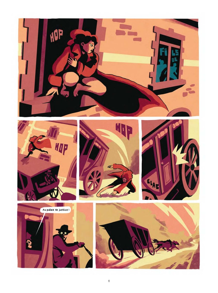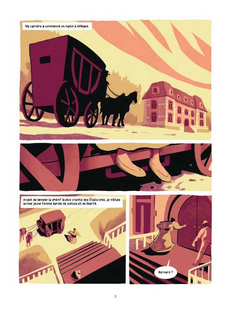 L'héroïne, Cécile, fille de magistrat rêve de marcher dans les traces de son père et d'embrasser également une carrière dans la magistrature. Seulement, en 1848, la société de l'époque ne voit pas les choses comme cela. Ce type de carrière est réservé aux hommes tandis que la place des femmes est plutôt à la maison. Cécile ne l'entend pas de cette oreille. Il n'en faut pas plus pour embarquer avec elle dans un récit d'aventures, teinté de western et de féminisme. De western car sa route va la mener dans un village du sud des États Unis où elle héritera de l'étoile de shérif. De féminisme car ses talents d'oratrice lui serviront autant pour défendre les causes qu'elle estime justes, que pour plaider la cause de son genre dans un combat contre la discrimination. L'histoire s'appuie d'ailleurs sur quelques faits historiques pour étayer ce propos. Ce mix donne un récit burlesque et distrayant. Il y a quelques scènes assez sympathiques. Que ce soit la beuverie qui va la conduire vers les USA, l'attaque de train qu'elle va vivre lors de son premier voyage, ou son plaidoyer improvisé pour éviter la pendaison à ses agresseurs, il y a quelques passages cocasses. La dimension sociale est également abordée intelligemment et l'ensemble se tient sur 120 pages. Un premier album original, tant dans le graphisme que dans le propos.