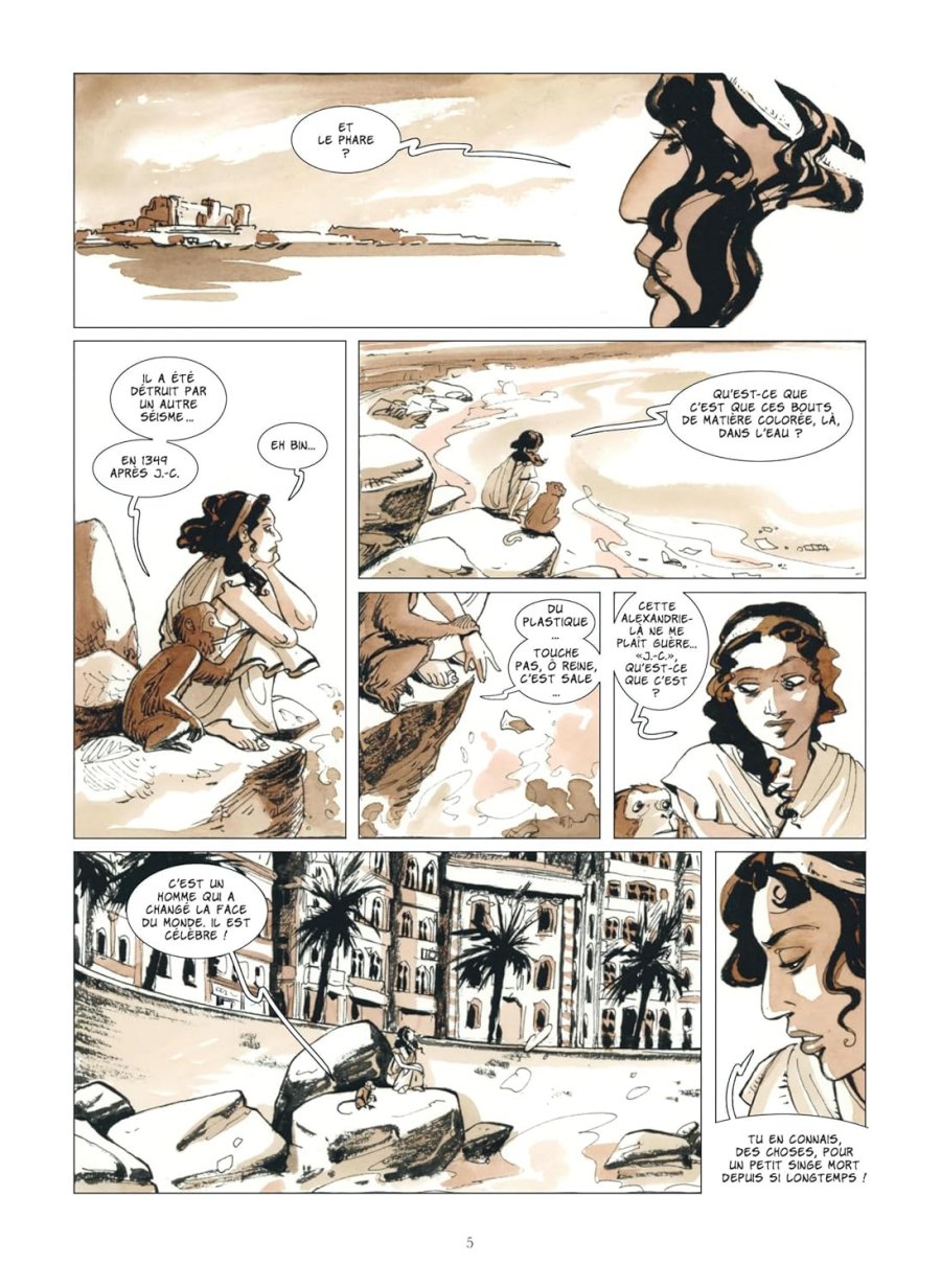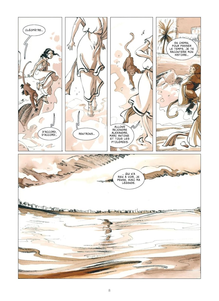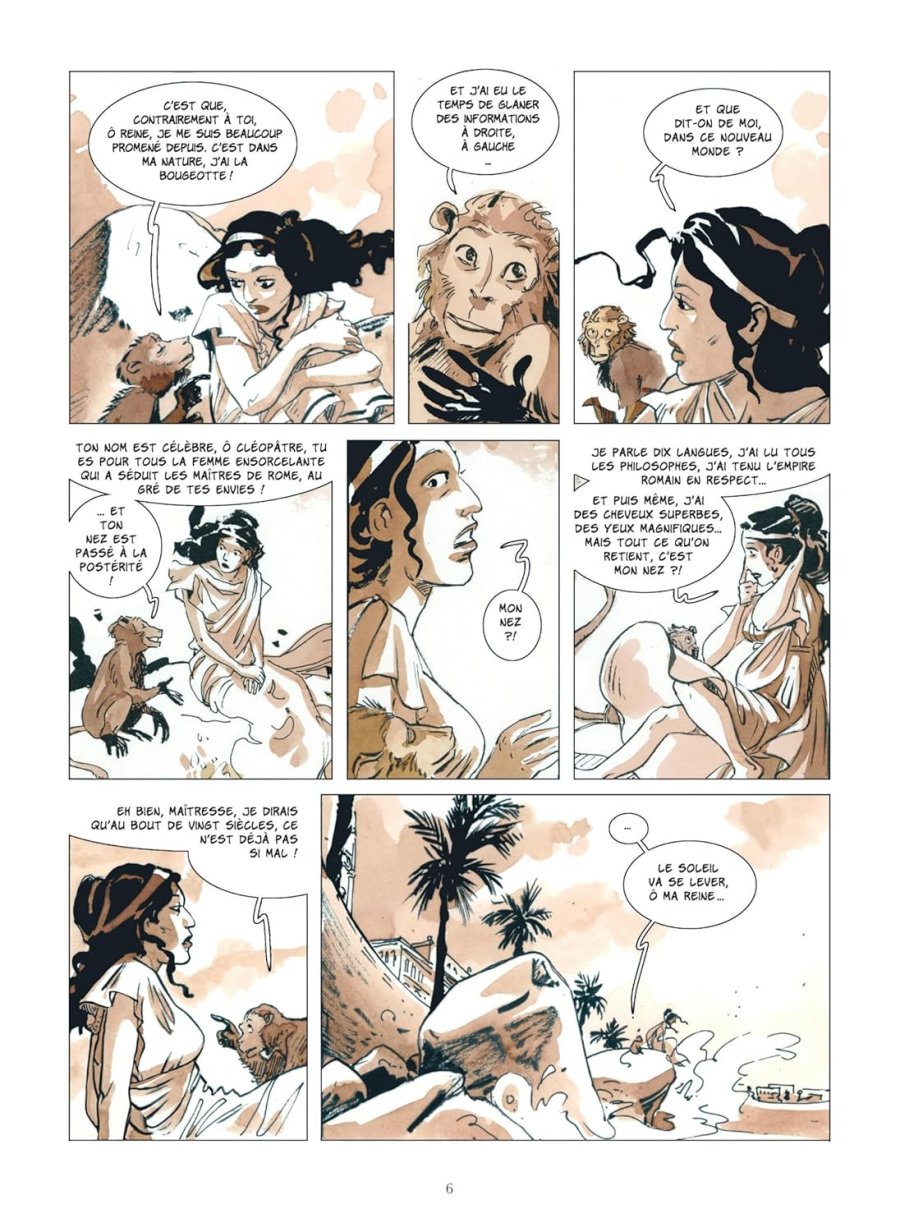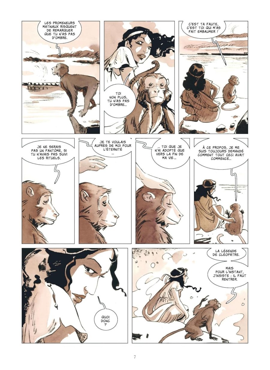Isabelle Dethan, une passionnée de l'histoire antique livre une biographie sur Cléopâtre. C'est un album qui m'a semblé bien documenté et qui essaie le plus possible de raconter la vraie vie de Cléopâtre loin des mythes qui tournent autour d'elle. C'est assez dense avec souvent beaucoup de textes, mais le scénario est aussi clair et facile à comprendre ce qui n'était pas facile. Non parce qu'avec toutes les intrigues à la cour d'Égypte ainsi qu'à Rome on peut facilement se mélanger, surtout lorsque plusieurs personnes portent le même nom, mais on ne se perd jamais. Cléopâtre est montrée comme une femme complexe qui est prête à tout pour protéger l'Égypte, même se débarrasser de ses frères et sœurs encombrants. Une bonne idée de Dethan est que c'est Cléopâtre elle-même qui narre sa vie tout en dialoguant avec la momie d'un ancien pharaon ainsi qu'avec son singe. Ce sont selon moi les meilleurs passages, surtout lorsque Cléopâtre essaie de justifier ses actions, cela permet de ne pas rendre cette biographie monotone et sans vie. Le dessin de Dethan est toujours aussi bon. À lire si on s'intéresse à l'histoire de l'antiquité.