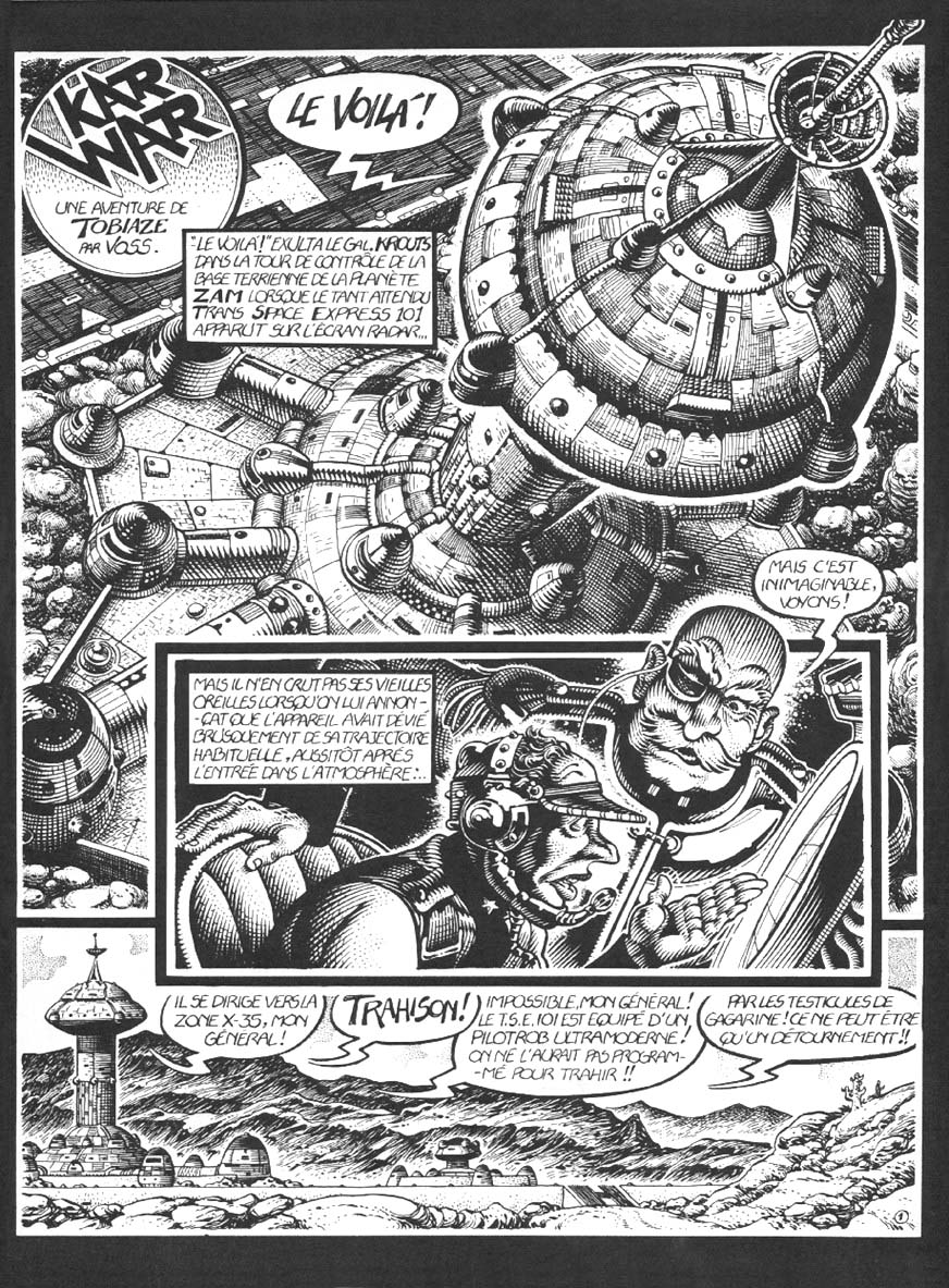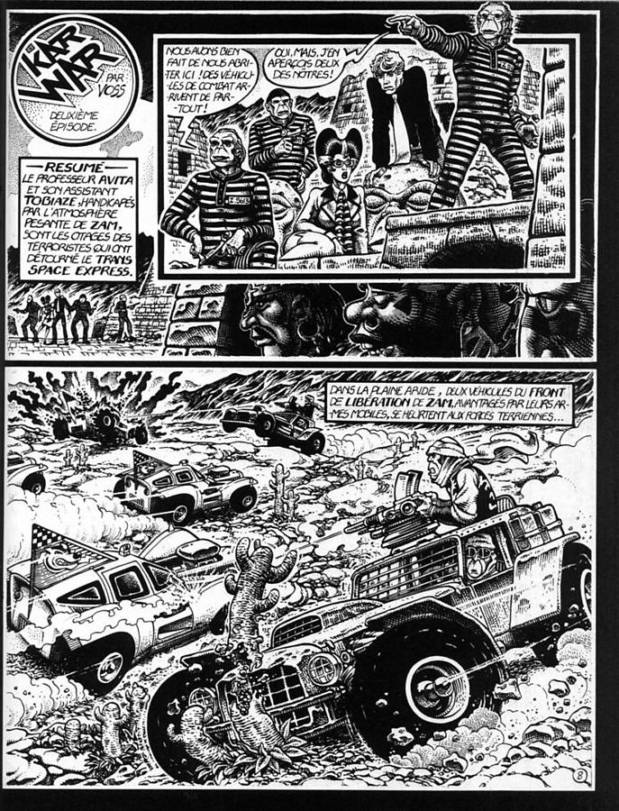 La deuxième publication de Voss dans la collection Pied Jaloux et la troisième aux Huma si on compte Heilman. Le dessin de Voss atteint ici sa pleine maturité artistique. Il y a une maîtrise du noir, un souci maniaque du détail dans chaque vignette... Les bolides terrestres et les engins spatiaux sont sublimes. Kar War se classe sans conteste sur le podium des plus belles bandes publiées dans cette collection. C'est d'autant plus dommage que l'histoire n'est pas toujours au niveau des images. En effet, on a droit à une intrigue trop convenue de bandes rivales cherchant à s'emparer du pouvoir sur une planète lointaine. La narration ne nous laisse pas souffler, on est souvent noyé sous les péripéties. De manière générale, le récit m'a moins emballé que L'Arbre à came qui était plus agréable à suivre. On a droit à une seconde histoire assez réussie de 10 pages, Vol de Lune, en fin d'album. Une très belle bande, passée pas loin du chef d'oeuvre si la narration avait été mieux maîtrisée.