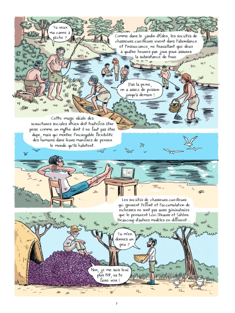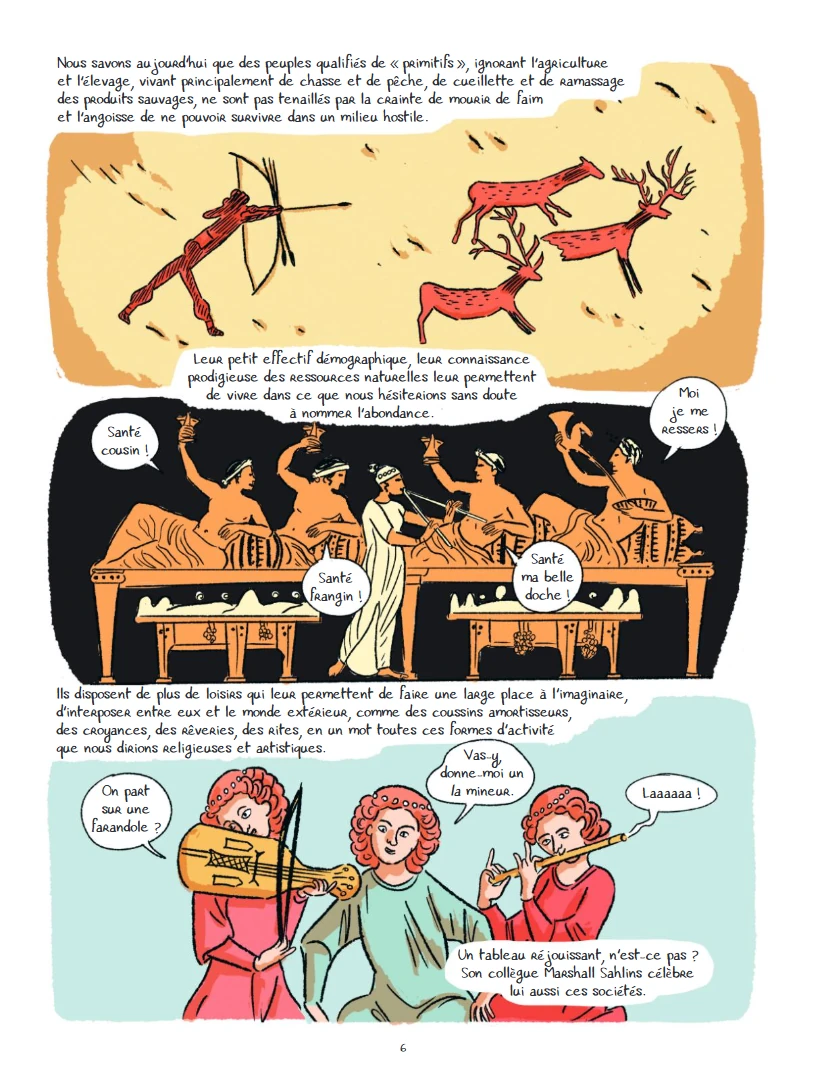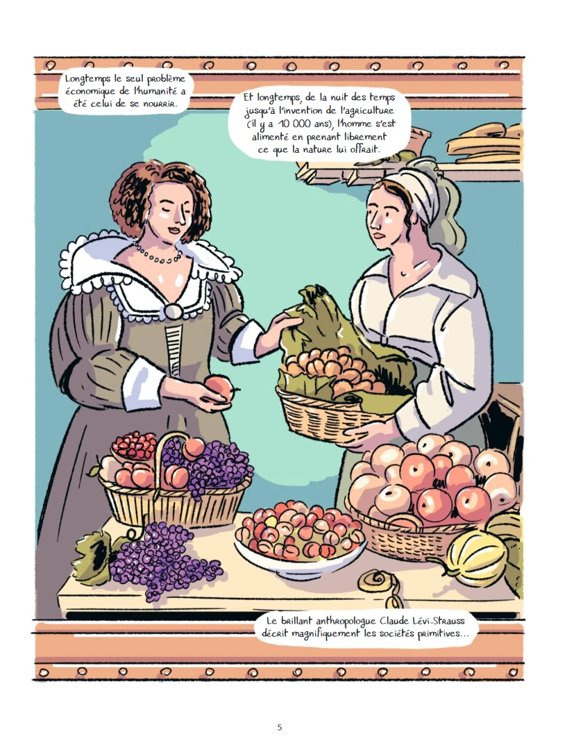 La prospérité matérielle reste la principale préoccupation des sociétés modernes. - Ce tome contient un exposé complet, indépendant de tout autre, ne nécessitant pas de connaissances préalables. Son édition originale date de 2025. Il s’agit de l’adaptation d’un texte de l’économiste Daniel Cohen (1953-2023), originellement intitulé : Une brève histoire de l’économie (paru en 2024). Elle a été réalisée par Aude Massot pour le scénario, les dessins, les couleurs, aidée par Laurence Trouvé pour ces dernières. Il comprend cent-quatre-vingt-deux pages de bande dessinée. Il se termine avec dix conseils pour être heureux, sur deux pages, d’après Bruno Frey, une postface de deux pages, rédigée par Julia Cagé (professeur d’Économie à Sciences Po Paris et lauréate du prix Yrjö-Jahnsson), un index d’une page recensant les termes allant de Agriculture à Valeur-travail, et des remerciements de l’autrice. Daniel Cohen et sa fille Pauline sont en train de visiter le Louvre. Ils sont tous les deux assis sur un banc, en train de contempler le tableau La Marchande de fruits et légumes (1630), de Louise Moillon (1609-1696). Le professeur ne peut pas s’empêcher de faire remarquer que la croissance économique est la religion du monde moderne. Elle lui demande si ce week-end passé ensemble pourrait se dérouler sans cours d’économie. Il continue quand même : cela fait des années qu’il réfléchit aux moyens de rendre la société plus juste. Elle lui fait remarquer qu’elle a l’impression qu’ils sont face à une fatalité : la croissance économique est la seule perspective de la société. Elle ne voit pas comment ils pourraient s’en défaire, et elle trouve ça un peu désespérant. Il poursuit : Hélas la culture et les problèmes métaphysiques ne sont pas devenus les enjeux majeurs de leur époque. La prospérité matérielle reste la principale préoccupation des sociétés modernes. Alors même qu’elles sont six fois plus riches qu’au siècle dernier. Longtemps le seul problème économique de l’humanité a été celui de se nourrir. Et longtemps, de la nuit des temps jusqu’à l’invention de l’agriculture (il y a dix mille ans), l’homme s’est alimenté en prenant librement ce que la nature lui offrait Le brillant anthropologue Claude Lévi-Strauss décrit magnifiquement les sociétés primitives. On sait aujourd’hui que les peuples qualifiés de primitifs, ignorant l’agriculture et l’élevage, vivant principalement de chasse et de pêche, de cueillette et de ramassage de produits sauvages, ne sont pas tenaillés par la crainte de mourir de faim et l’angoisse de ne pouvoir survivre dans un milieu hostile. Leur petit effectif démographique, leur connaissance prodigieuse des ressources naturelles leur permettent de vivre dans ce que l’on hésiterait sans doute à nommer l’abondance. Ils disposent de plus de loisir qui leur permettent de faire une large place à l’imaginaire, d’interposer entre eux et le monde extérieur, comme des coussins amortisseurs, des croyances, des rêveries, des rites, en un mot toutes ces forces que l’on dirait religieuses et artistiques. Comme dans le jardin d’Éden, les sociétés de chasseurs-cueilleurs vivent dans l’abondance et l’insouciance, ne travaillant que deux à quatre heures par jour pour assurer la subsistance de tous. Cette image idéale des structures sociales d’hier doit toutefois être prise comme un mythe dont il ne faut pas être dupe, mais qui montre l’incroyable flexibilité des humains dans leur manière de penser le monde qu’ils habitent. Une entreprise ambitieuse et de belle ampleur : réaliser une adaptation en bande dessinée d’un exposé constituant une brève histoire de l’économie. Ambitieux parce que le texte est déjà écrit et complet et qu’il faut trouver comment en faire une bande dessinée qui dépasse le stade de texte illustré avec des images redondantes. De belle ampleur puisqu’en effet l’ouvrage part de la préhistoire pour parvenir jusqu’à l’époque (très) contemporaine (il est question d’intelligence artificielle), avec même une ouverture sur des perspectives constructives pour le proche avenir, ce qui est encore plus ambitieux au vu de l’état de la planète au moment de la rédaction de l’article original. L’adaptatrice reprend un dispositif éprouvé, utilisé dans la majorité des ouvrages vulgarisateur de la collection La petite bédéthèque des savoirs : mettre en scène un avatar de l’auteur, en l’occurrence l’économiste lui-même, qui bénéficie ici d’un interlocuteur pour réagir et relancer la conversation, à savoir sa propre fille. Tout est prêt pour un exposé en neuf chapitres, certains comprenant des sous-chapitres, en particulier ceux consacrés à la mondialisation, et à la révolution numérique. Dès les premières pages, le lecteur apprécie la fluidité de la narration. Il ressent que l’adaptatrice a su conserver la logique de l’exposé de l’économiste, qu’elle l’a assimilée, et qu’elle l’a retranscrit avec intelligence. Dans l’introduction et le premier chapitre, il constate l’efficacité et la pertinence de l’avatar de Daniel Cohen et l’apport des remarques de celui de sa fille. Il fait l’expérience de la diversité des représentations visuelles. Certes certains passages semblent être l’intégration en l’état du texte de l’exposé, pour autant les dessins dépassent un simple état utilitaire ou fonctionnel, ou même celui de gag ajouté pour conserver artificiellement l’attention du lecteur. L’artiste fait usage de plusieurs modes narratifs. Le lecteur apprécie d’entrée de jeu de pouvoir accompagner ainsi le père et la fille. Cela apparaît comme une évidence de voir l’économiste faire son cours (sa fille a raison sur la nature de sa discussion) libéré des limites d’une salle de classe ou d’un amphithé