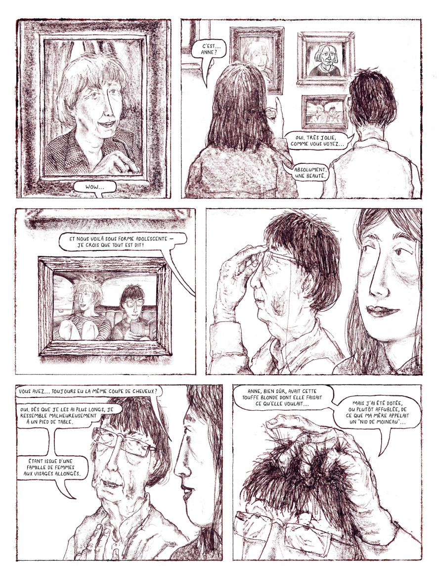 J’avais découvert Joff Winterhart sur son précédent album (« Courtes Distances »). Un récit qui m’avait marqué par son dessin sans concession, un humour très anglais et une sensibilité dans l’écriture qui m’avait démontré combien l’auteur aimait ses personnages bien plus grâce à leurs défauts qu’au travers de leurs qualités. « Chère historienne » fait office de confirmation. L’auteur nous offre en effet et à nouveau un double portrait de personnages attachants réunis par la vie malgré une grande différence d’âge et des trajectoires sans similitudes. L’une est historienne et cache une vivacité d’esprit, un humour et sa grande humilité derrière une apparence austère. L’autre travaille pour une boite de production, vient de se faire larguer par son fiancé (en plein enterrement de vie de jeune fille), picole de trop et cherche sa place dans l’univers. Entre les deux va naitre une histoire d’amitié, une connexion profonde alors que la première est sollicitée par la seconde pour animer une série télévisée consacrée à l’Histoire. Les deux personnages n’ont pas une grande opinion d’elles-mêmes mais elles font leur bonhomme de chemin, soucieuses de ne pas déplaire à leur entourage tout en restant fidèles à leur vision des choses. J’ai été très sensible à la douce ironie qui se dégage du récit. Margaret Crypt, l’historienne, pose sur son entourage un regard à la fois tendre et spirituel. J’ai beaucoup aimé ses « décrochages » lors des réunions, durant lesquels elle passe son temps à penser à autre chose ou à observer les autres intervenants. J’ai aimé ce regard sur la vie, la sienne, l’actuelle comme la vie passée, mais aussi celle des autres, sans jugement mais avec amusement. Le dessin de Joff Winterhart est en osmose avec le récit par sa tendance obsessive à aller chercher le petit détail grotesque, à le mettre en avant mais à ne pas le caricaturer. Il y a ainsi des enchainements de cases, des cadrages, des expressions de visage disséminés tout au long du récit qui restent gravés dans ma mémoire bien après ma lecture. La technique employée par l’auteur pour dessiner ses planches offre un rendu assez proche du trait de « Courtes Distances » mais implique une part de hasard (le résultat final n’est visible qu’après réalisation de la planche ou ‘en trichant’, en soulevant une plaque en cours de réalisation pour voir ce que ça donne). Je trouve le procédé intéressant mais j’y vois aussi une certaine logique avec le récit : cette part de hasard qui influence le résultat final vient faire écho à la part de hasard qui oriente la vie des personnages (et, d’une manière plus générale, nos vies à tous). Je regrette certes quelques longueurs mais, dans l’ensemble, je peux dire que j’ai vraiment bien aimé. Par contre, si vous n’avez pas accroché à « Courtes Distances », je ne vois pas pourquoi vous accrocheriez à cet album, qui offre exactement les mêmes qualités et défauts. Mais pour les autres (Alix, Blue Boy), je ne peux que conseiller ce nouvel opus, qui vient magnifiquement clore la trilogie Bon Jovi de l’auteur (c’est du moins ainsi qu’il l’appelle, démontrant par cette appellation le caractère décalé de son humour).