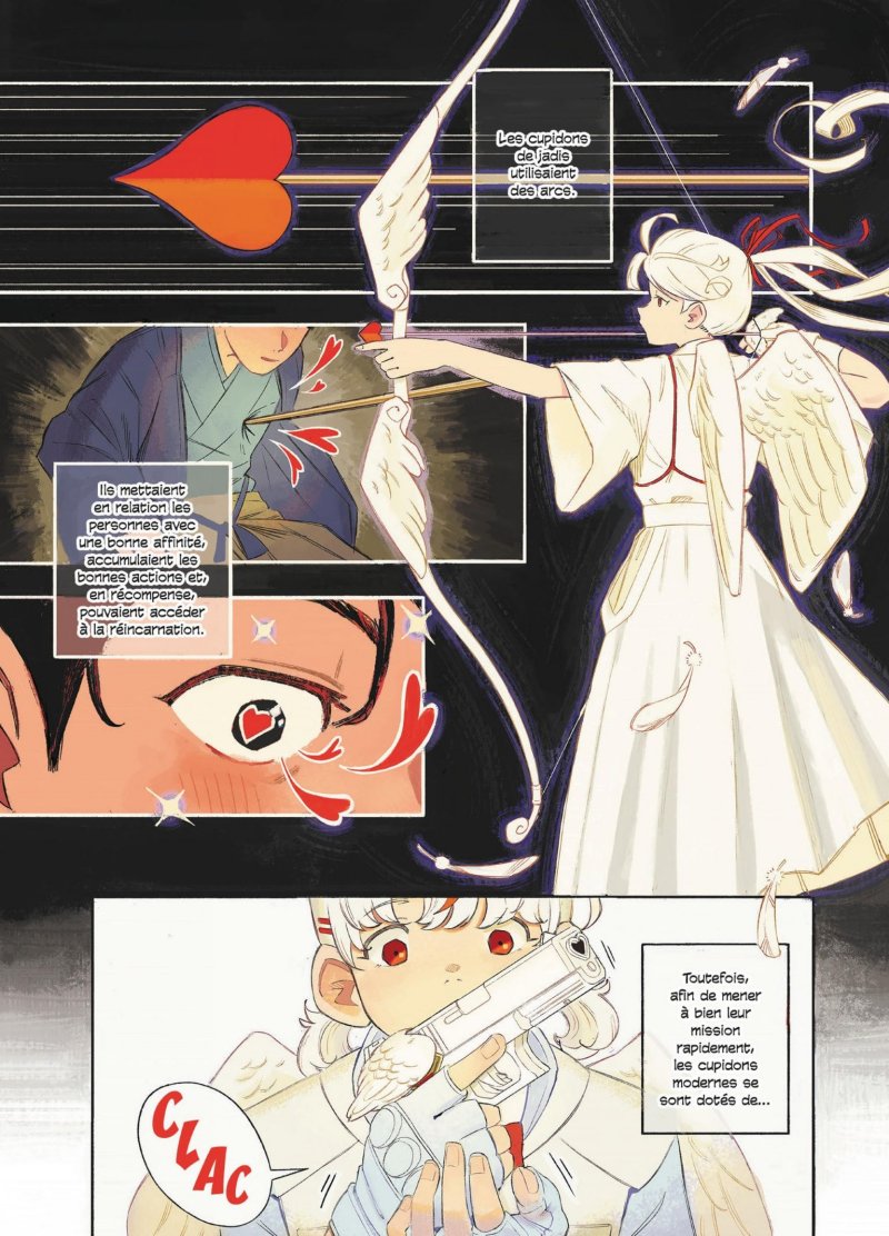 Keuwa ?! Love Bullet est arrivé dans nos vertes contrées ?! Et la traduction est de très bonne facture ?! Incroyable mais vrai et je me devais de l'acheter ! Love Bullet c'était à la base un one-shot tout à fait charmant qui avait fait parler de lui sur internet et qui avait finalement réussi à obtenir une sérialisation. Je l'avais découvert dès la sortie du oneshot, comme beaucoup j'étais tombée sous le charme de l'idée et cela me fait donc plaisir de voir que l'œuvre pourra désormais toucher un public encore un peu plus large. La base est simple mais bourrée de potentiel : et si les âmes des jeunes gens morts avant d'avoir pu connaître l'amour se voyaient offrir le droit de servir la déesse de l'Amour en personne. Comment sert-on la déesse de l'Amour ? En tirant des balles de calibre 12 dans la tête des amoureux transis en devenir, pardi ! Grenades, fusil de sniper, armes de poings en tout genre, les cupidons de cette histoire sont de véritables Rambo, des "one-man army" (ou plutôt "one-girl army" dans le cas présent), des machines de guerre armées jusqu'aux dents pour réussir leur mission. "Pourquoi tirer sur des gens" vous entends-je dire ? Mais parce que les arcs c'est désuet ! Vous avez idée du nombre de personnes que l'on pourrait faire tomber (amoureuses) avec des moyens modernes comparé aux armes d'antan ? Surtout quand on nous promet une récompense aussi alléchante qu'une résurrection et la possibilité d'enfin connaître l'amour soi-même une fois que l'on aura pu permettre à suffisamment de couples de naître, alors on enfile son gilet pare-balle, on se renseigne sur ses cibles et on se prépare à chasser sa prime karmique, nom de nom ! On suit Koharu, nouvelle cupidon fraîchement réincarnée, entremetteuse de talent de son vivant et toujours aussi empathique, qui va devoir apprendre les ficelles du métier avec ses trois mentors : Kanna, une feignante au grand cœur, Ena, une professionnelle pure et dure, et enfin Chiyo… une bastonneuse dans l'âme qui préfère clairement casser la gueule à ses camarades cupidons plutôt que de faire son boulot ! Ce qui marche beaucoup dans cette histoire, c'est le mélange loufoque de la prémisse et la forme parfaitement sérieuse de son exécution, qui à aucun moment ne se gênent l'une l'autre. Mieux : le sérieux des cupidons et de leur mission appuie le décalage comique. Et même au-delà du comique, c'est une série loufoque qui se permet d'être touchante, de traiter avec rigueur son sujet principal, qui est celui de l'amour et des relations entre les individu-e-s. Non, vraiment, sans pour autant vous faire miroiter un chef d'œuvre insoupçonné, je le redis : Love Bullet est une série tout à fait charmante, un petit délire qui n'oublie pas d'être de qualité, une ode à l'amour explosif (entre individus comme envers les armes et les situations de guéguerre, ne nous voilons pas la face). Allez, un p'tit coup de cœur, c'est de circonstance !