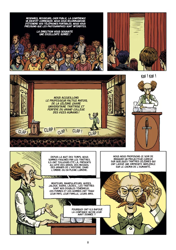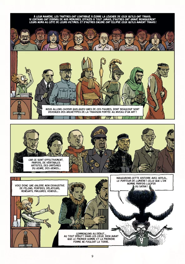 C'est fou comme l'HIstoire est émaillée d'histoires de trahisons diverses et variées. Ici nous avons plutôt des trahisons politiques, des gens dont les revirements, les magouilles et les manigances ont causé du tort à leurs nations ou leurs mentors. On commence -presque- par Judas, dont l'existence n'est pas avérée, mais qui est devenu un symbole au fil des interprétations de la Bible. Il y a des noms qui entrent en résonance avec l'actualité récente, dont un certain Quintus naevius Cordus Sutorius Macro, communément appelé... Macron, ou encore le traitre norvégien des années 1940 Vidkun Quisling, qui fonda un parti inféodé aux Nazis, et dont la traduction littérale est "Rassemblement national". D'ailleurs pour les anglophones le vocable quisling signifie traître. A la tête de différents pays, de différents partis, ces sombres personnages ont juré la perte de ceux qui les ont vus naître, les ont adoptés (comme Brutus avec César) ou les ont formés, comme Sarkozy avec Chirac. Tous l'ont payé cher de leur vie ou dans la postérité, certains ont carrément été oubliés de l'Histoire, et cet album, particulièrement mitonné par Didier Convard, passionné d'Histoire et par Jean-Christophe Camus. Les historiettes sont comme toujours dans cette collection, habilement racontées, on ne s'ennuie pas, et il y a toujours cette touche d'humour, ici sous la forme d'un professeur-conférencier qui sert de respiration dans un ouvrage un peu didactique. Le dessin de Pascal Magnat, loin d'être celui d'un simple exécutant, se montre assez inventif et nerveux pour que l'ensemble constitue un moment de lecture très plaisant.