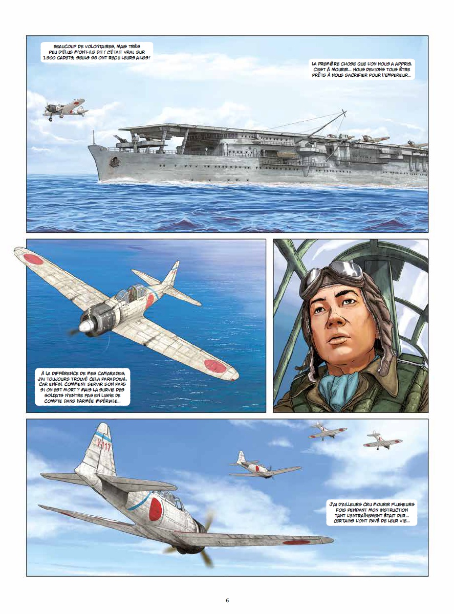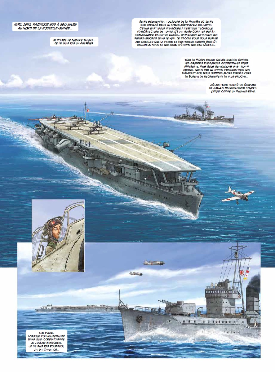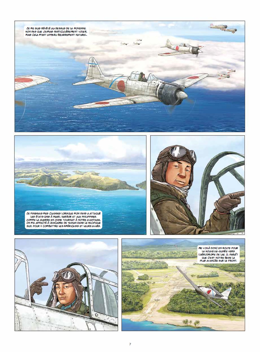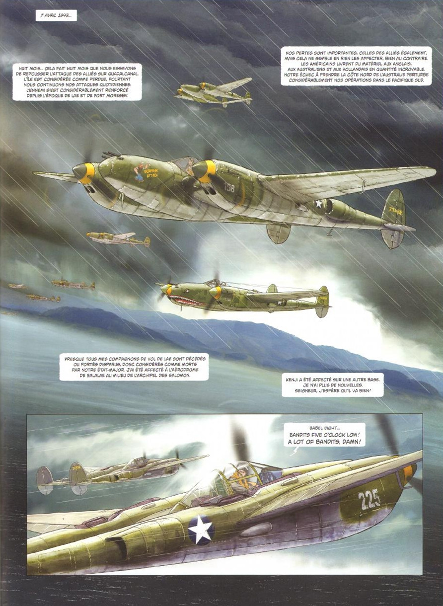 Une série qui n’est pas des plus originales – même si Speltens a choisi ici de ne traiter la guerre que du côté japonais – mais qui ravira à coup sûr les amateurs de la période et de ces théâtres d’opération (la seconde guerre mondiale dans le Pacifique), et ceux que l’aviation militaire et les combats aériens passionnent. En effet, le dessin de Speltens est vraiment très bon. Un chouia figé pour les personnages, mais son trait est précis et agréable à l’œil. Et les avions sont vraiment très bien représentés – comme souvent pour les auteurs de cette collection Cockpit (mais ici on est plutôt dans le haut du panier). En fin du premier album, Speltens nous donne même à voir chaque type d’avions représentés dans la série, avec une fiche technique. Concernant l’intrigue, elle se laisse lire agréablement elle aussi. Le contexte est bien rappelé avec deux pages en début de chaque album qui rappellent les enjeux et les principaux événements, et de belles cartes permettent aux lecteurs qui ne situeraient pas les lieux nommés de s’y retrouver aisément. Vu du point de vue des Japonais – et en particulier d’un pilote, Daisuke – la série commence là où l’élan japonais s’essouffle, à partir du printemps 1942, Midway, puis Guadalcanal, et enfin Iwo Jima et la défait dans le dernier tome encore à paraître. Speltens montre bien que, malgré la censure et l’implacable discipline imposée à tous (poussant au suicide tous ceux qui ne peuvent plus combattre – rendre étant inenvisageable), il devient rapidement évident que la supériorité américaine amène une fin inéluctable. Daisuke est un pilote courageux, discipliné, mais cela ne l’empêche pas de se poser des questions, et de ne pas être aveugle face à la réalité : ses compagnons meurent en grand nombre. La narration est un peu lente, et l’intrigue manque sans doute un peu de densité (Speltens tente de pallier ce manque dans le deuxième tome avec un long passage au Japon, lorsque Daisuke bénéficie d’une convalescence). Mais ça reste quand même une série sympathique, et chouette à regarder.