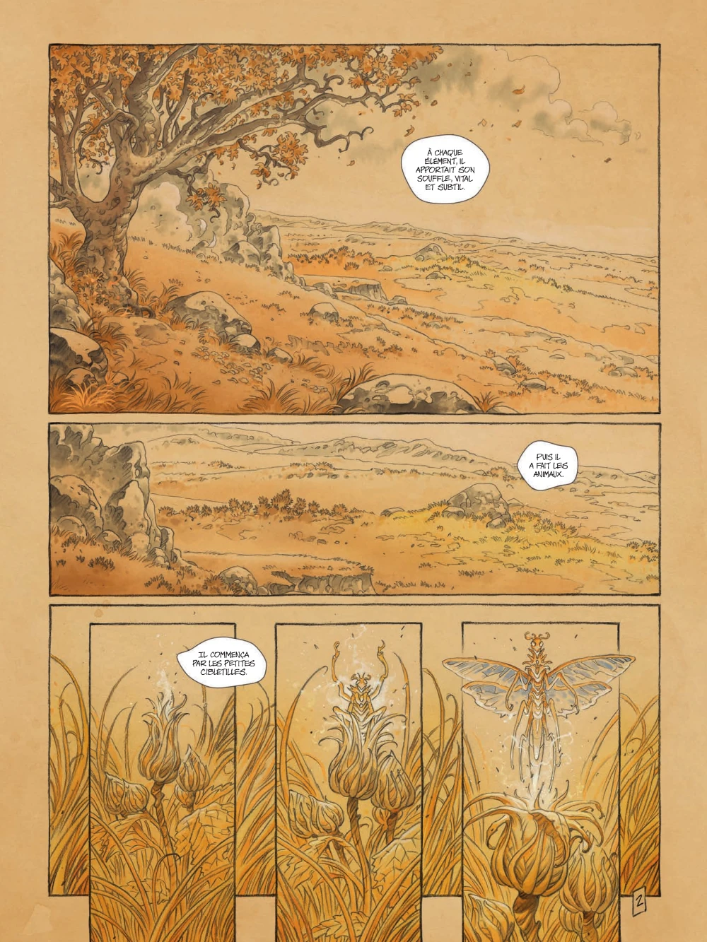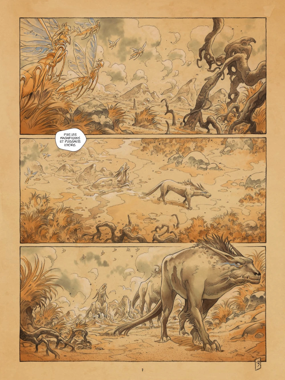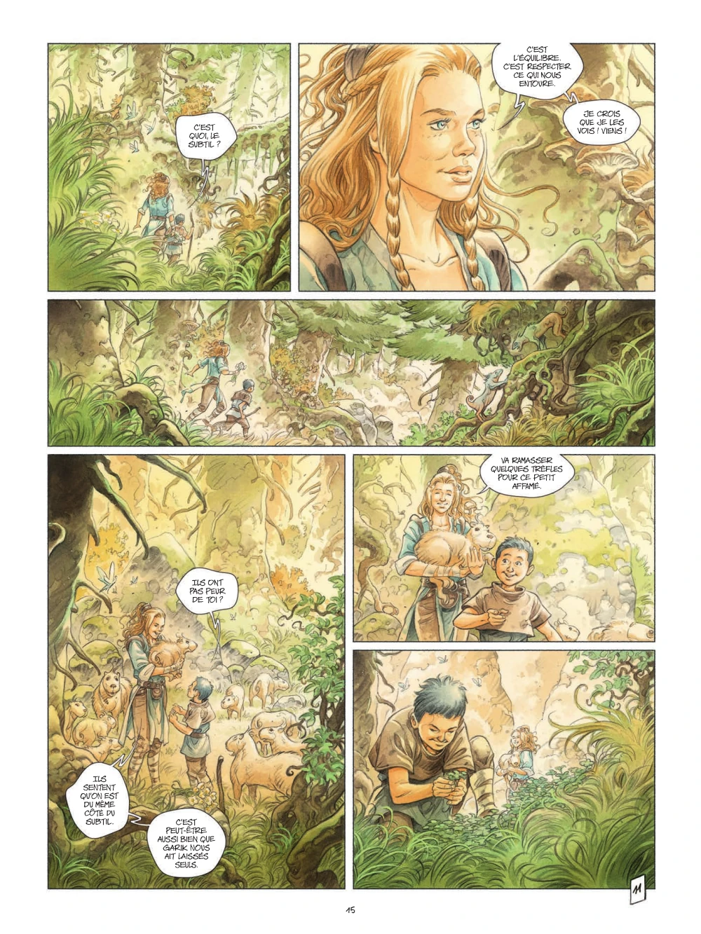 J'adore le travail graphique de Grun sur La Conjuration d'Opale. J'aime beaucoup le gap qu'il a franchi avec On Mars, scénarisé par Runberg. Je le retrouve ici, sur un scénario imaginé par sa compagne Laurine Clin, dans une ambiance fantasy dont il semble friand. Et encore une fois c'est une sorte d'orgasme visuel. Grun nous propose des décors à la fois variés et très réalistes, sortis de l'imaginaire de générations d'autrices et d'auteurs du genre. Je me suis surpris à ralentir ma lecture pour contempler de nombreuses cases, tant elles vibrent de puissance et de beauté. Mention spéciale, bien sûr, pour les ciblètilles, ces êtres ressemblant à la fois à des hommes et à des insectes volants, d'une beauté à couper le souffle, et qui gardent leur part de mystère... Il met donc en images une histoire de Laurine Clin, un récit somme toute assez simple qui parle de la recherche des origines, mais aussi de la passation entre les générations, et du vivre ensemble dans un monde que l'on peut regarder comme un miroir du nôtre. Son écriture est précise, sensible, et nous promet de belles choses si elle persiste dans cette voie. Je trouve d'ailleurs que l'univers, avec ses cinq races auxquelles une entité suprême a délégué le pouvoir de créer des hommes, mérite d'être exploré plus avant.