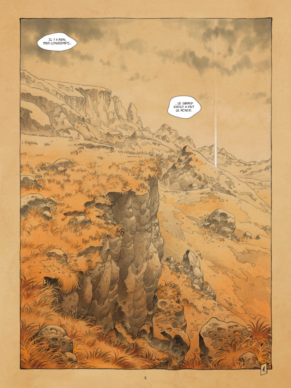 Dans un monde imaginaire façonné par une légende ancestrale, un père et son fils vivent isolés dans les montagnes. Parce que leurs origines sont aussi honteuses que terrifiantes, ils restent à l’écart des autres hommes. Mais les secrets devront être dévoilés… (texte : Editions DM)