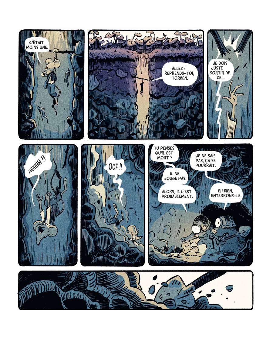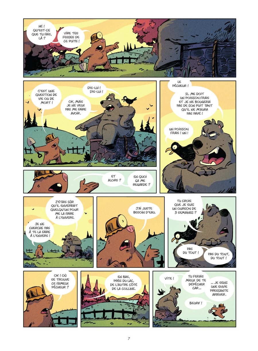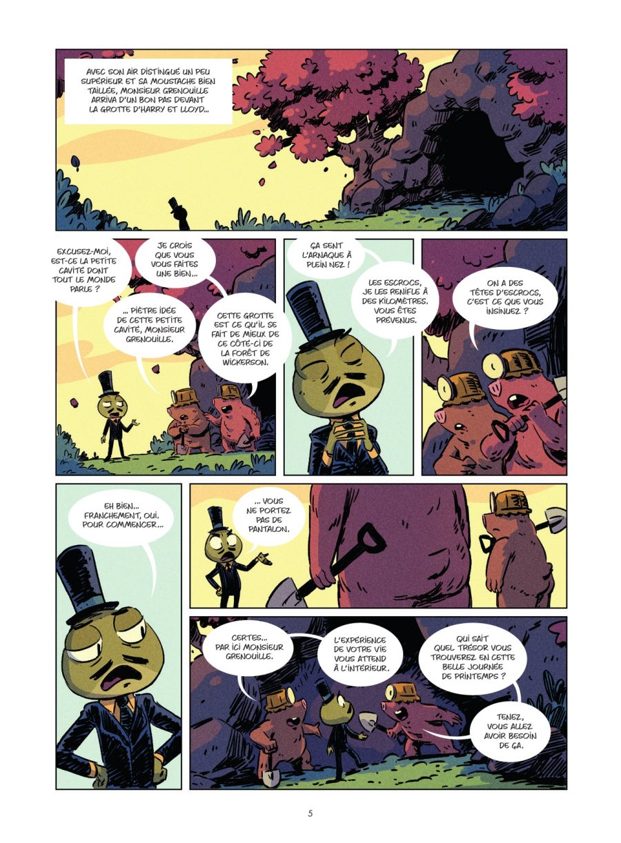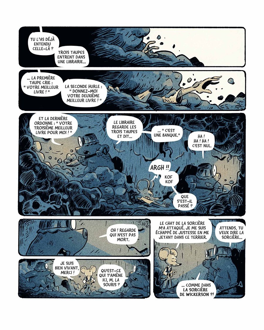 Dans la forêt de Wickerson est une réédition augmentée de l'album La Sorcière de Wickerson, qui ne contenait à l'origine qu'une seule histoire. Ce nouvel album propose trois récits : la version recolorisée et enrichie de la Sorcière, devenue L'Ogresse de Wickerson, ainsi que deux histoires plus courtes qui introduisent les lieux et les personnages secondaires, notamment les deux taupes, avant de plonger dans la forêt sous la menace de l'ogresse, avec une sorte de souris Robin des Bois. L'ensemble est présenté comme si le héros devenu vieux racontait ces légendes aux lecteurs, donnant au récit une tonalité de conte raconté qui ne manquera pas de faire penser aux Légendes de la Garde en plus léger. Graphiquement, le dessin est sympathique et dynamique, avec un trait expressif et des décors soignés. Les cadrages efficaces et le style rappelant l'animation renforcent cette impression de conte animé, et les références à la fantasy ou au cinéma ajoutent un petit plus pour les lecteurs attentifs. À noter qu'en fin d'album, l'éditeur propose de nombreuses pages et croquis montrant comment l'auteur a construit son histoire puis l'a remodelée pour cette réédition, offrant un regard instructif sur le processus créatif. L'ambiance est légère et jeune, avec de nombreuses touches d'humour parfois un peu noir. On notera que la mort y est bien présente et que ce n'est donc pas forcément un album jeunesse. Le récit phare par exemple rappelle un peu un épisode des Schtroumpfs, sauf qu'ici ceux-ci seraient réellement tués et mangés par Gargamel/l'Ogresse et le héros se montre sans pitié envers elle. Cependant, malgré cette mise en scène originale et plaisante, l'ensemble se lit trop vite et reste assez classique. Les histoires manquent d'originalité et ne laissent qu'un souvenir anecdotique. J'apprécie le côté conte aventureux, la vivacité des personnages et l'atmosphère, mais je suis resté sur ma faim côté inventivité et densité narrative. En résumé, Dans la forêt de Wickerson est un joli album tous publics, agréable à lire et vivant, mais qui se révèle trop vite parcouru et peu surprenant pour marquer durablement.