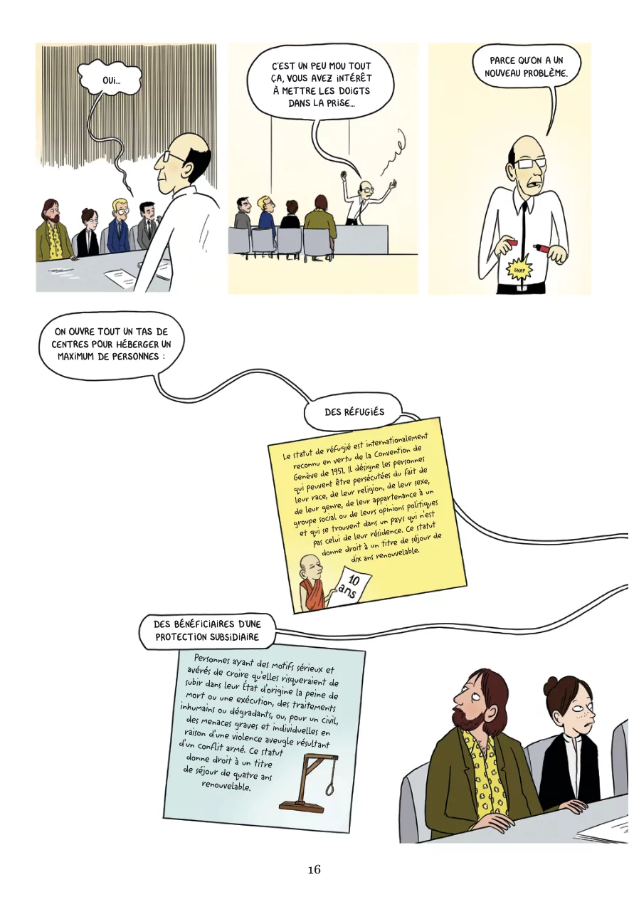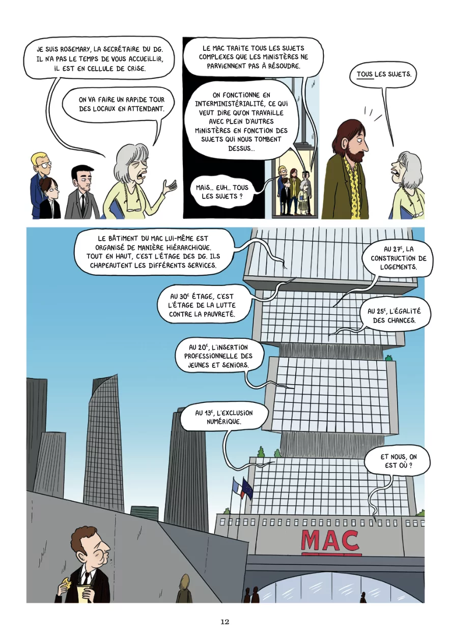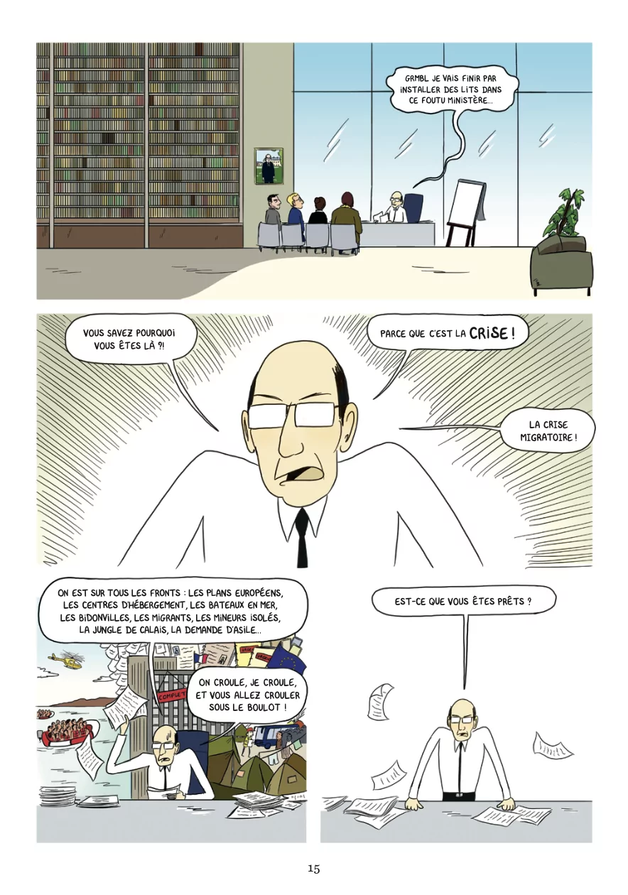 Le ministère des Affaires complexes est chargé de résoudre les dossiers sensibles de la nation. En 2015, l’afflux de demandeurs d’asile suscite la fébrilité. Une petite équipe est missionnée pour mettre à l’abri les réfugiés et faire disparaître au plus vite les campements et bidonvilles. (texte : Les Arènes BD)