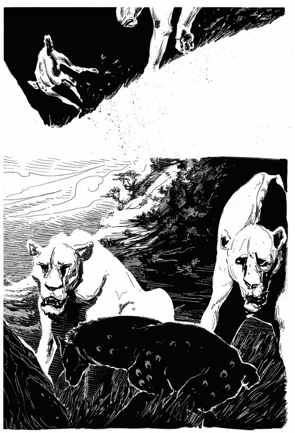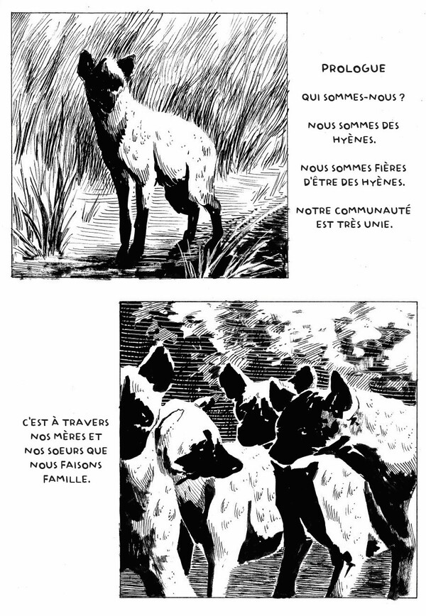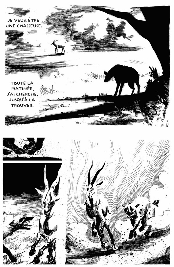 Les hyènes ne font pas des lions. Dolores Alcatena a hérité du talent graphique de son illustre père : Enrique Alcatena. Une artiste argentine reconnue dans son pays où elle a déjà publié plusieurs albums, ce "Les Folles" est sa première BD traduite en France. Une première lecture qui ne m'avait pas complètement convaincu, j'ai donc laissé passer quelques jours avant d'entreprendre une seconde lecture plus probante. Depuis l'excellent Watership Down je rechigne moins à lire une BD où des animaux sont les personnages principaux. On va donc suivre l'itinéraire de Namomo, une hyène, de sa prime jeunesse à un âge avancé. Et pour apprécier un tant soit peu ce parcours initiatique, il faut appréhender ce récit comme un conte où légendes et famille en sont la colonne vertébrale. Dolores Alcatena a voulu réhabiliter cet animal à l'aspect disgracieux, à la curieuse démarche et au ricanement glaçant, on les dit laides. Un album qui se veut féministe, les hyènes tachetées vivent en clan dans un système social matriarcal où mères, sœurs et filles en sont la clé de voûte. Une narration dominée par la voix off de Namomo où chaque chapitre se concentre sur une étape de son cheminement, cela permet de comprendre sa difficulté à se sentir une Folle au sein de son clan. Ça peut paraître brut de décoffrage et manquant d'onirisme mais le rythme est bien dosé et je me suis finalement attaché à cette hyène en quête de réponses. Un récit sur la différence et la difficulté d'appartenir à un groupe. Un noir et blanc tranché, torturé et réaliste qui me plait énormément. Dolores Alcatena a incontestablement du talent, elle arrive à retranscrire les émotions d'un simple regard ou suivant une posture tout en gardant l'aspect animal des hyènes. De même avec ce « sourire » accentué qui rend ce carnivore si impénétrable. Une BD qui divisera.