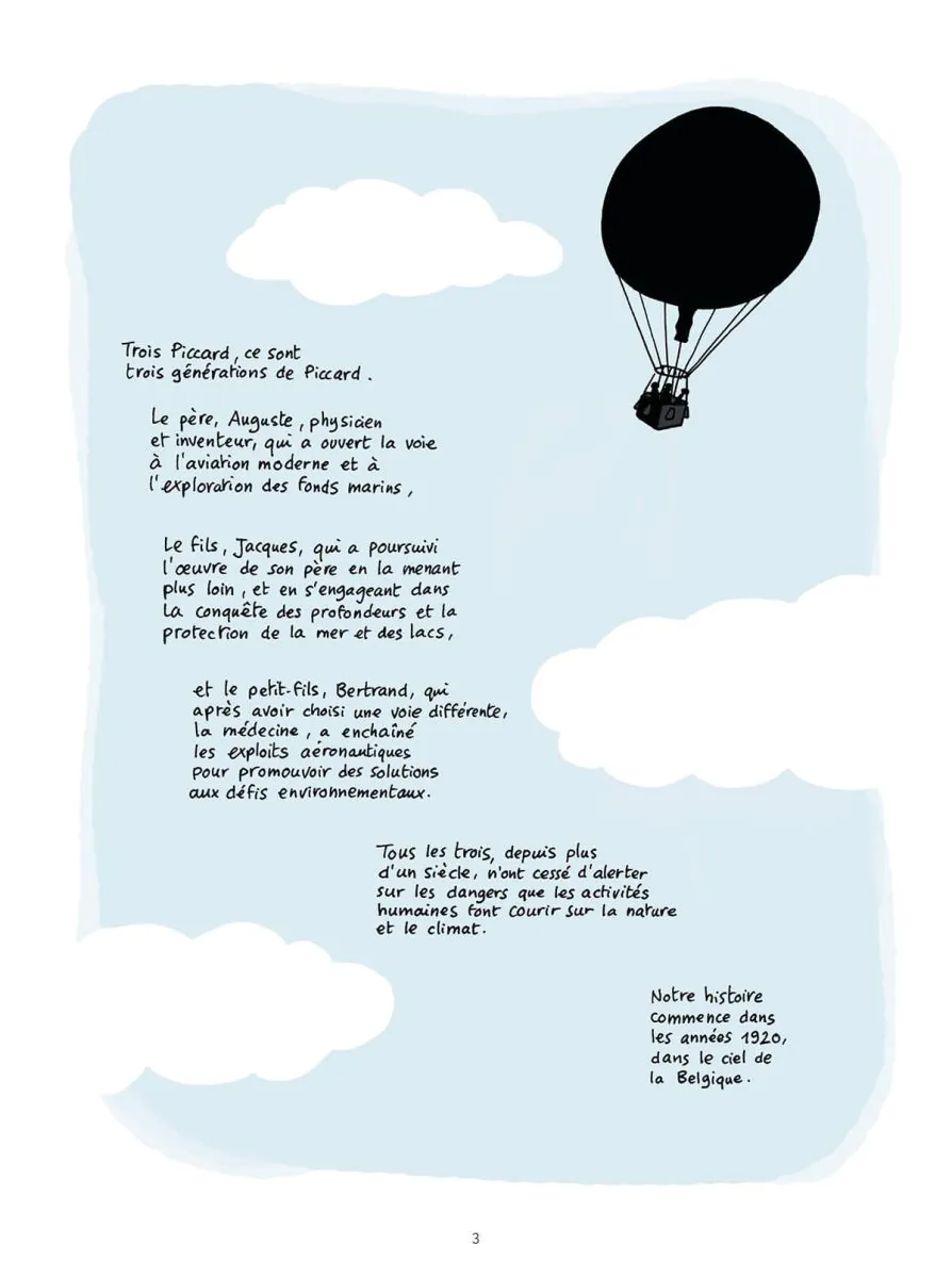 Auguste, Jacques et Bertrand Piccard : Trois générations de « savanturiers », dont chacune a contribué à repousser les limites de notre monde : Auguste, premier explorateur de la stratosphère, et inventeur du bathyscaphe avec lequel Jacques a battu un record de profondeurs dans la fosse des Mariannes. Quant à Bertrand, il fera le premier Tour du Monde en ballon avant de se lancer dans l'aventure des énergies renouvelables avec Solar Impulse, l'avion solaire. Une chronique familiale et scientifique racontée avec humour par Jean-Yves Duhoo, et le concours actif et bienveillant de Bertrand Piccard qui lui a ouvert ses archives. Texte: L'éditeur