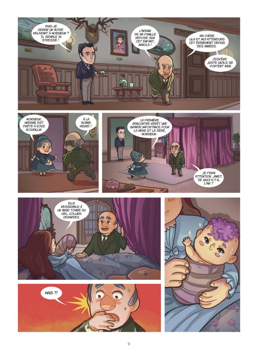 Evelÿne est une fillette turbulente aux cheveux violets. Abandonnée à la naissance, elle a été élevée par des sœurs dans un couvent. Et du haut de ses 7 ans, on peut dire qu’elle leur mène la vie dure ! Chaque jour, elle fait les quatre cent coups aux côtés de Benedict, le chat adopté en même temps qu’elle. Finalement, rien de vraiment anormal pour une enfant. À un détail près : elle fait également parler les statues et voit des fantômes ! Cette particularité rend son éducation plus compliquée, d’autant qu’Evelÿne ne maitrise pas encore ses pouvoirs. Les sœurs décident alors de la confier, ainsi que Benedict, au mystérieux Neil Farfadet, un chapelier londonien qui aidera la fillette à découvrir qui elle est vraiment.