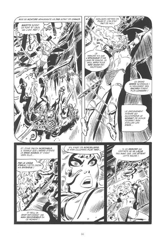 J'ai découvert et aimé Red Sonja depuis mon adolescence. Elle m'a touché à plusieurs niveaux... Frank Thorne était l'auteur des dessins et à ce moment-là, je n'avais pas besoin de savoir plus! J'ai cherché pendant de nombreuses années à acquérir toutes les histoires complètes (une quête presque incessante) et c'est maintenant chose faite avec cette édition: en plus, avec les images en noir et blanc qui mettent en valeur la qualité du dessin, je pense. Il y a de la violence, certes, mais aussi beaucoup de sensualité et parfois de la tendresse et de la solidarité envers les plus démunis. Bref, ce fut une rencontre et une redécouverte très heureuse.