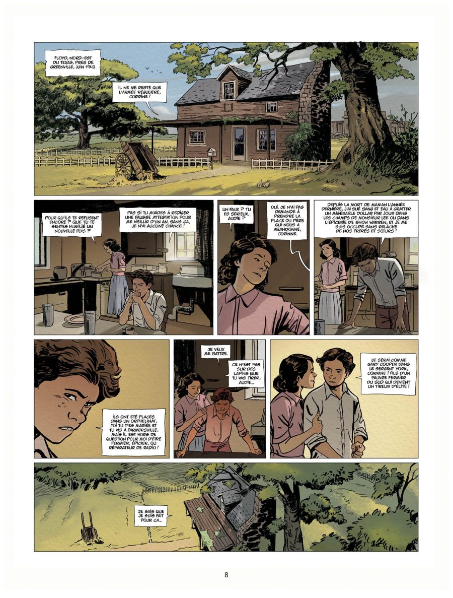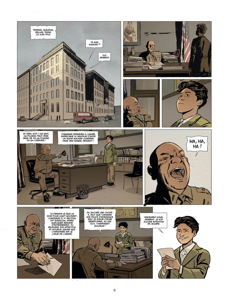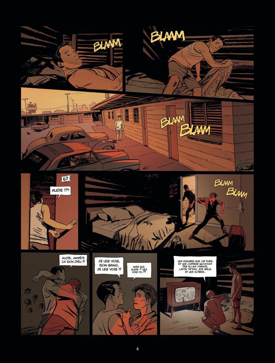 Cet album retrace le parcours d'Audie Murphy, jeune Américain frêle qui parvient à s'engager pendant la Seconde Guerre mondiale, devient l'un des soldats les plus décorés de son pays, avant de revenir marqué à vie par les horreurs du front. Son destin a de quoi intriguer, entre ascension fulgurante, actes de bravoure et traumatisme durable. Mais dans les faits, j'ai eu beaucoup de mal à m'immerger dans le récit, en grande partie à cause de son traitement graphique et narratif. Le dessin m'a posé problème. Il est globalement trop imprécis, avec des personnages qui se ressemblent beaucoup, d'autant plus qu'ils portent presque tous le même uniforme. Cela rend rapidement les scènes confuses, surtout dans les moments d'action. Les couleurs, assez ternes, n'aident pas non plus à distinguer les plans ou à donner du relief à l'ensemble. La mise en scène accentue encore cette impression. Le découpage est assez haché, avec de nombreux sauts chronologiques qui désorientent plus qu'ils ne structurent le récit. On passe d'une situation à une autre sans toujours bien comprendre le contexte, et certaines scènes, notamment les combats, manquent clairement de lisibilité. Il devient alors difficile de suivre précisément ce qui se joue ou de mesurer l'importance des événements. À cela s'ajoute un personnage principal que j'ai trouvé étonnamment lisse et insaisissable. Malgré son statut de héros, je n'ai jamais vraiment réussi à comprendre ce qui le motive, ni à ressentir son évolution. Son parcours est là, factuellement, mais il peine à prendre vie ou à susciter une véritable implication émotionnelle. Il faut attendre la scène finale, spectaculaire, pour entrevoir quelque chose de plus marquant, avec cet acte au sommet d'un tank qui évoque presque une forme de geste de vengeance désespérée, voire suicidaire. Mais cela arrive tard et ne suffit pas à compenser le manque d'incarnation du reste du récit. Alors qu'il tente de rendre hommage à une figure héroïque, cet album m'a semblé échouer à transmettre ce qui faisait sa singularité, tant sur le plan narratif que visuel. Le fond est intéressant, mais la forme m'a empêché d'y adhérer.