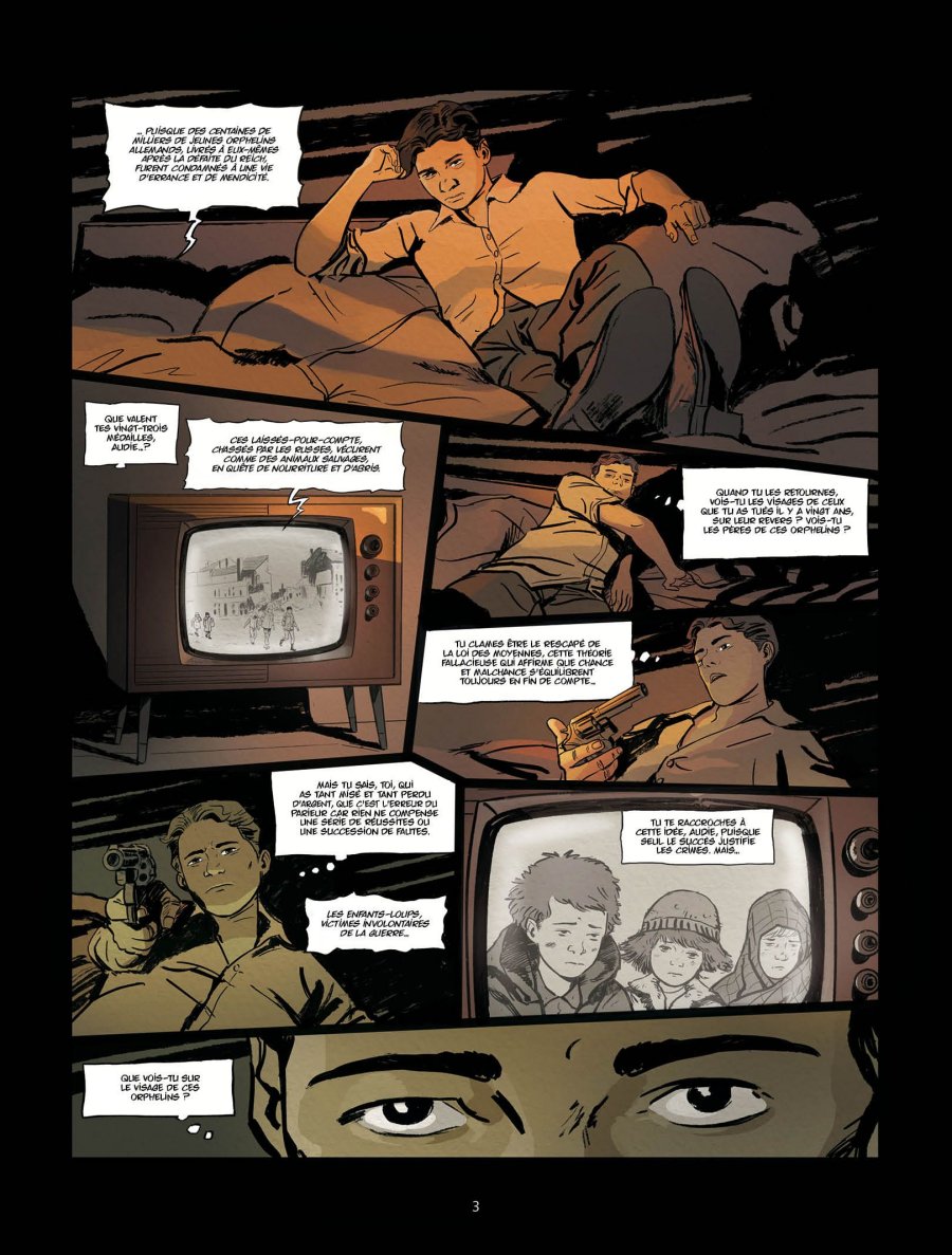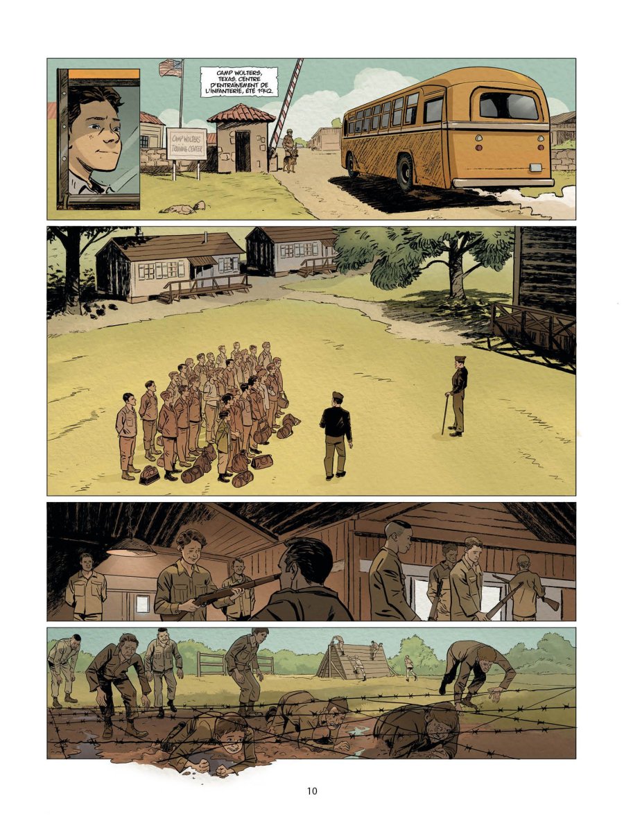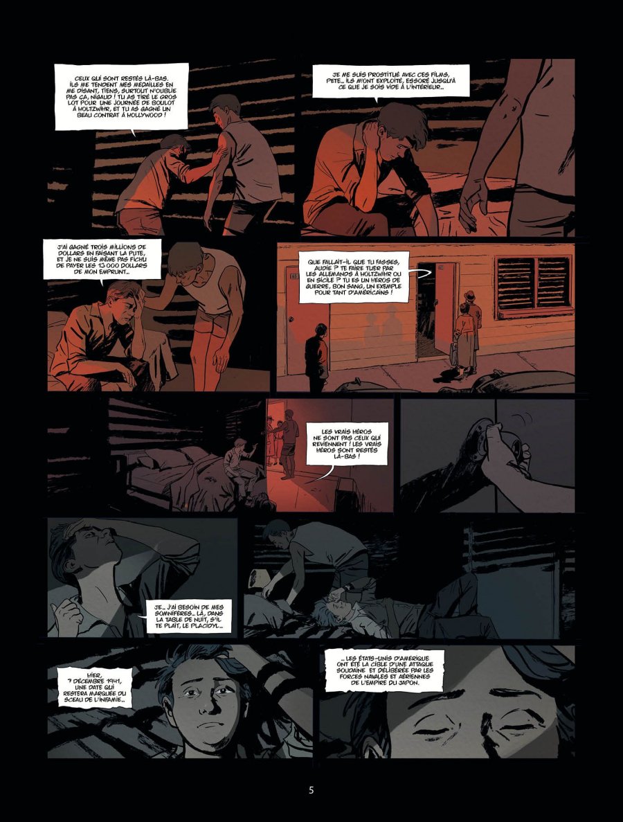 Cet album retrace le parcours d'Audie Murphy, jeune Américain frêle qui parvient à s'engager pendant la Seconde Guerre mondiale, devient l'un des soldats les plus décorés de son pays, avant de revenir marqué à vie par les horreurs du front. Son destin a de quoi intriguer, entre ascension fulgurante, actes de bravoure et traumatisme durable. Mais dans les faits, j'ai eu beaucoup de mal à m'immerger dans le récit, en grande partie à cause de son traitement graphique et narratif. Le dessin m'a posé problème. Il est globalement trop imprécis, avec des personnages qui se ressemblent beaucoup, d'autant plus qu'ils portent presque tous le même uniforme. Cela rend rapidement les scènes confuses, surtout dans les moments d'action. Les couleurs, assez ternes, n'aident pas non plus à distinguer les plans ou à donner du relief à l'ensemble. La mise en scène accentue encore cette impression. Le découpage est assez haché, avec de nombreux sauts chronologiques qui désorientent plus qu'ils ne structurent le récit. On passe d'une situation à une autre sans toujours bien comprendre le contexte, et certaines scènes, notamment les combats, manquent clairement de lisibilité. Il devient alors difficile de suivre précisément ce qui se joue ou de mesurer l'importance des événements. À cela s'ajoute un personnage principal que j'ai trouvé étonnamment lisse et insaisissable. Malgré son statut de héros, je n'ai jamais vraiment réussi à comprendre ce qui le motive, ni à ressentir son évolution. Son parcours est là, factuellement, mais il peine à prendre vie ou à susciter une véritable implication émotionnelle. Il faut attendre la scène finale, spectaculaire, pour entrevoir quelque chose de plus marquant, avec cet acte au sommet d'un tank qui évoque presque une forme de geste de vengeance désespérée, voire suicidaire. Mais cela arrive tard et ne suffit pas à compenser le manque d'incarnation du reste du récit. Alors qu'il tente de rendre hommage à une figure héroïque, cet album m'a semblé échouer à transmettre ce qui faisait sa singularité, tant sur le plan narratif que visuel. Le fond est intéressant, mais la forme m'a empêché d'y adhérer.