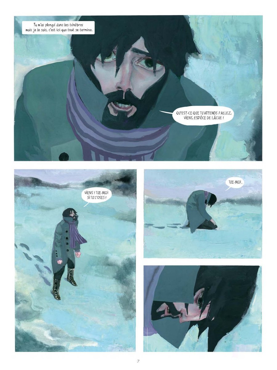Inutile de présenter Frankenstein, classique parmi les classiques, déjà adapté de nombreuses fois, notamment en bande dessinée. David Sala propose ici sa version personnelle, qui lui permet d'exprimer pleinement son talent d'illustrateur et d'appuyer intelligemment sur les travers dépeints dans le roman. Frankenstein, ce monstre créé de toute part, ne trouve pas sa place dans la société. Le fond de l'histoire traite de la différence, des minorités, de la violence. L'interprétation de David Sala développe à merveille ces thématiques. Car au delà du lien tumultueux entre la créature et son créateur, cette version appuie sur toutes ces dimensions humaines. L'acceptation de l'autre, la différence, l'amour, la haine... Cette histoire est le terrain de jeu idéal pour mettre en exergue tous ces sentiments. L'auteur s'en sort hyper bien, et son message passe avec efficacité. Il y a des scènes assez dures, assez touchantes, que ce soit avec des silences, distillés avec justesse ça et là, ou avec des dialogues acerbes, le ton sonne juste tout au long de l'album. Ce récit, c'est surtout une façon de dépeindre la société, celle de l'époque du récit... mais également la notre, celle d'aujourd'hui, dont la vison n'a visiblement pas évoluée. Une histoire touchante, toujours d'actualité donc, et très bien adaptée ici.