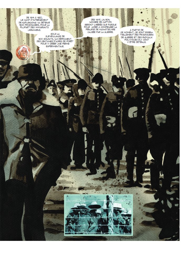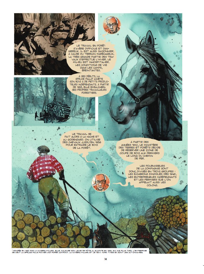 Un album qui m'a surpris dans sa forme. Je m'attendais à une œuvre de fiction qui raconterait une tragédie syndicale oubliée (il faut dire que le nord de l'Ontario est une région surtout rurale, peu peuplé et loin du centre d'animation de cette province) et en fait c'est un documentaire. On suit tout le long le scénariste, qui est aussi historien, discuté de l'affaire avec une autre historienne dans des petites cases apposés sur des dessins plus grands et c'est la source d'une bonne partie du texte de l'album. Je ne suis pas particulièrement fan du procédé, en particulier parce que l'aspect art séquentiel de cette BD est souvent minimal hormis quelques moments percutant où ne sont pas présent les historiens comme lorsqu'on voit un individu prendre son fusil pour tirer sur les grévistes. C'est vraiment le genre de BD documentaire où j'ai l'impression qu'on aurait pu faire un livre sans problème. Il faut dire aussi que le travail de Quesnel ressemble plus à de l'illustration et si j'aime bien les décors, j'aime un peu moins les personnages qui sont souvent trop figés. On dirait juste que quelqu'un a dessiné par-dessus des photos. Sinon, cela reste quand même un album intéressant qui remets en lumière une affaire que toute le monde a oubliée. L'événement en lui-même est d'ailleurs banalement tragique pour n'importe qui qui connait un peu l'histoire des luttes ouvrières: compagnie toute puissante qui fait la loi, grévistes qui essaient d'améliorer leurs sorts, les autorités qui ne font rien et cela se termine dans le drame et la parodie de justice. Triste schéma qu'on a vu bien trop souvent !