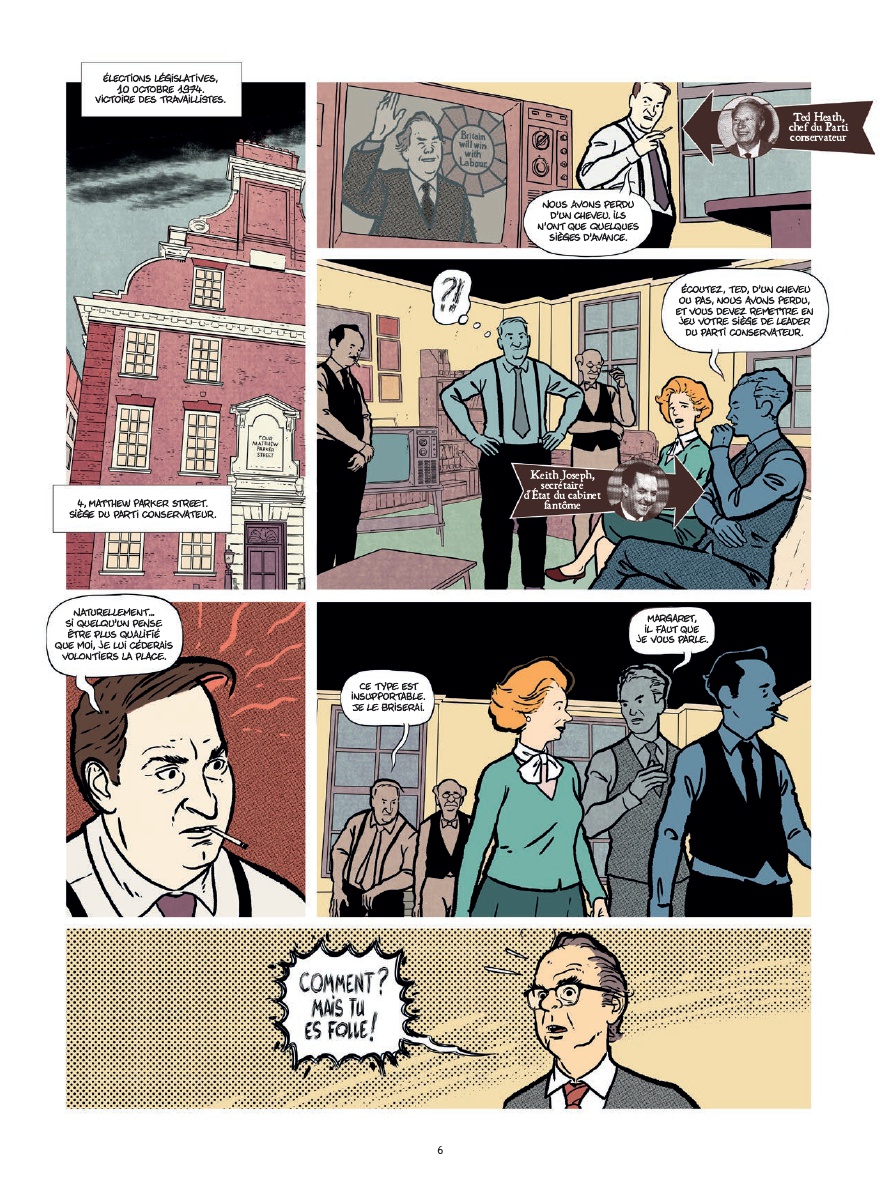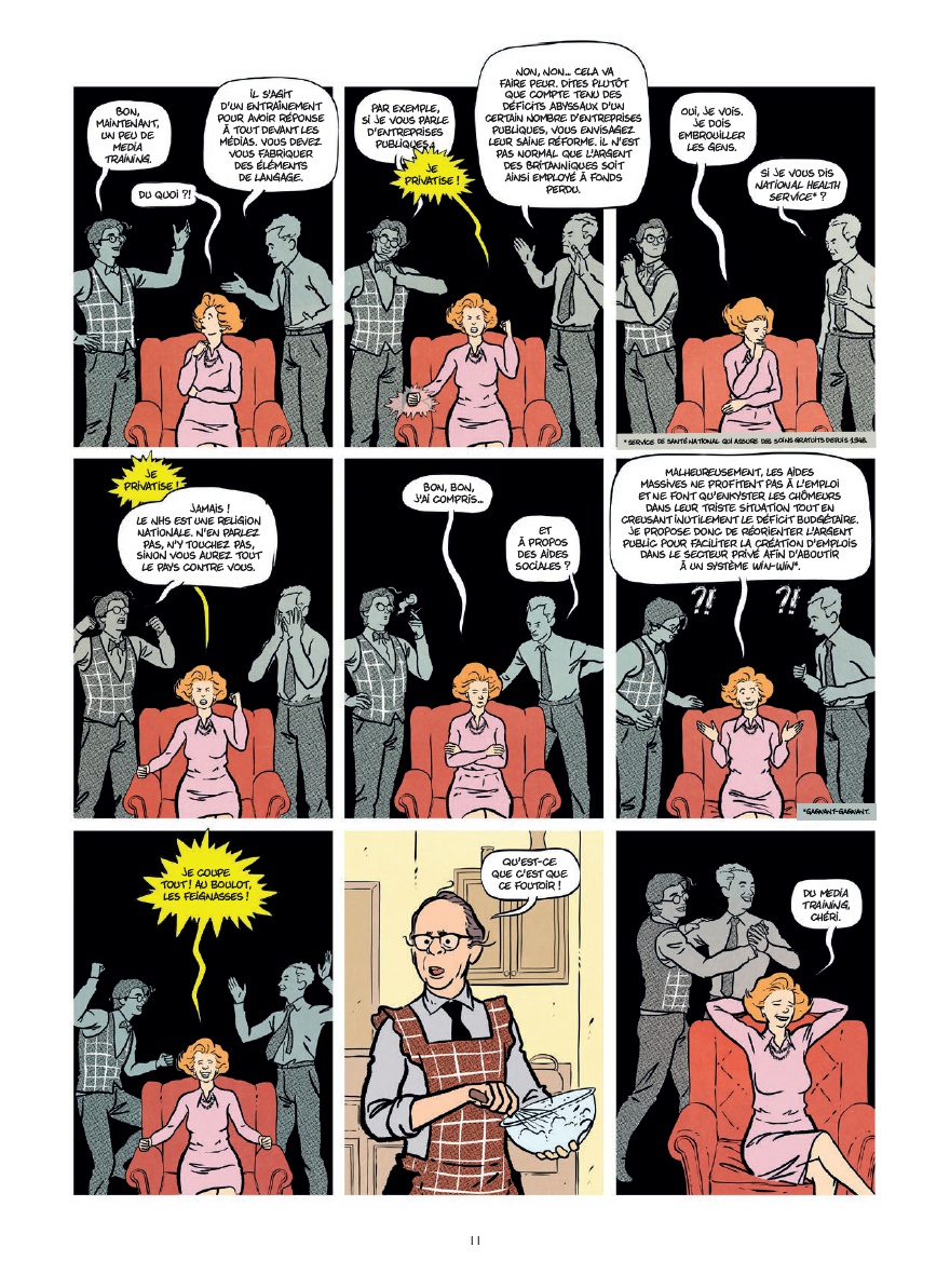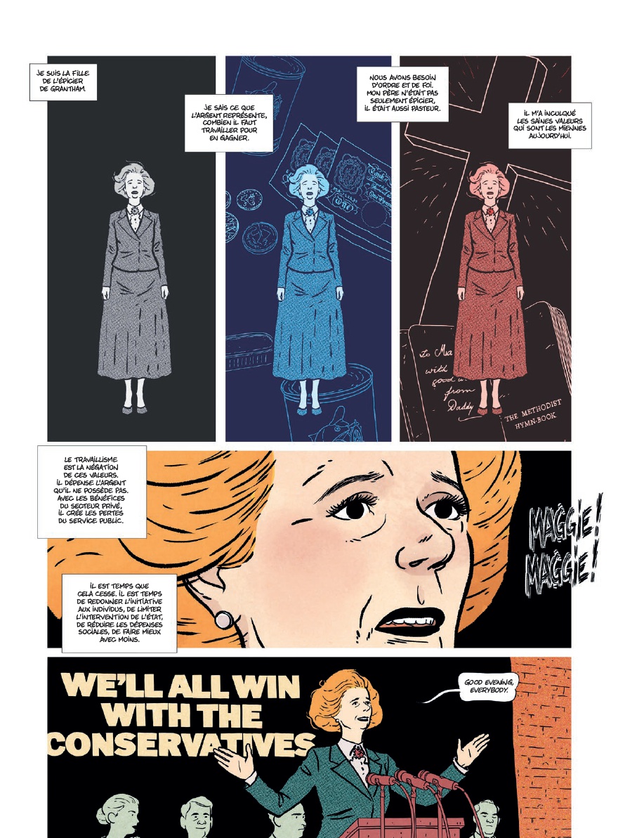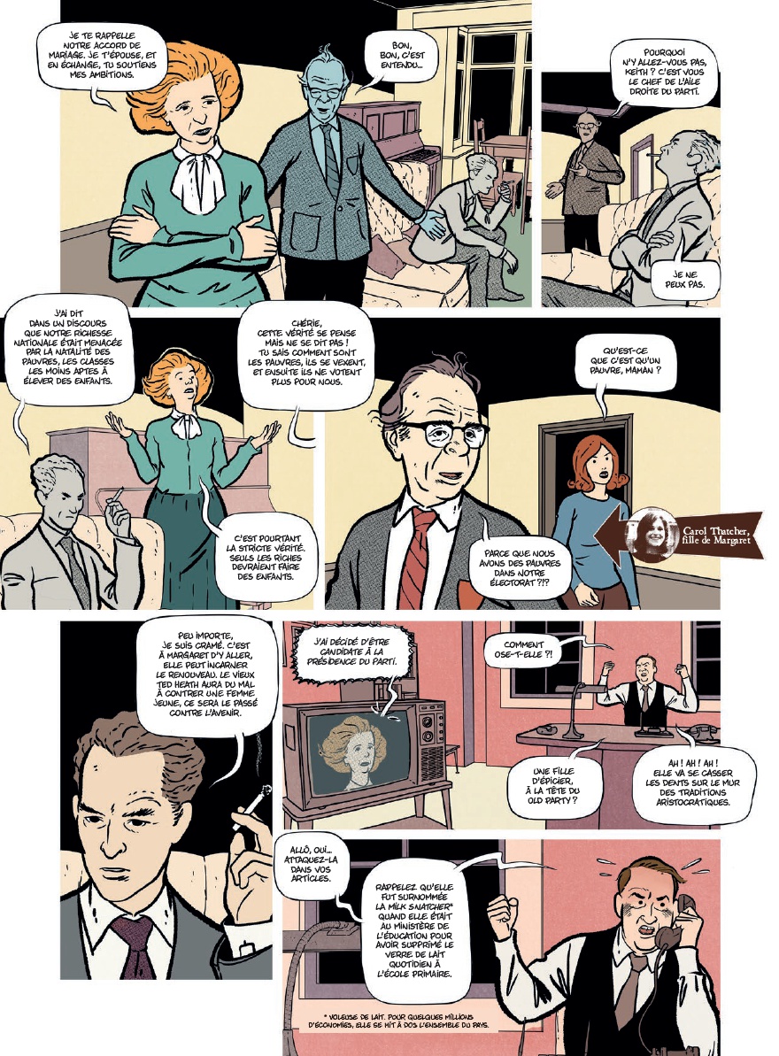 Angleterre, années 1970. Alors que le pays s’enlise dans la crise, une femme discrète s’impose contre tous : Margaret Thatcher. Fille d’épicier devenue cheffe du parti conservateur, elle accède au pouvoir en 1979 et engage une rupture radicale. Privatisations, affrontements avec les syndicats, guerre des Malouines, détestation de l’Europe qualifiée de « pays de cinglés », lune de miel avec Reagan… Un grand sabbat néolibéral commence ! Experte en communication, la « Dame de fer » fait marcher au pas ses collaborateurs et au bazooka ses adversaires. Détestée autant qu’admirée, Thatcher va bouleverser les codes du pouvoir et transformer durablement la société britannique, pour le meilleur et pour le pire…