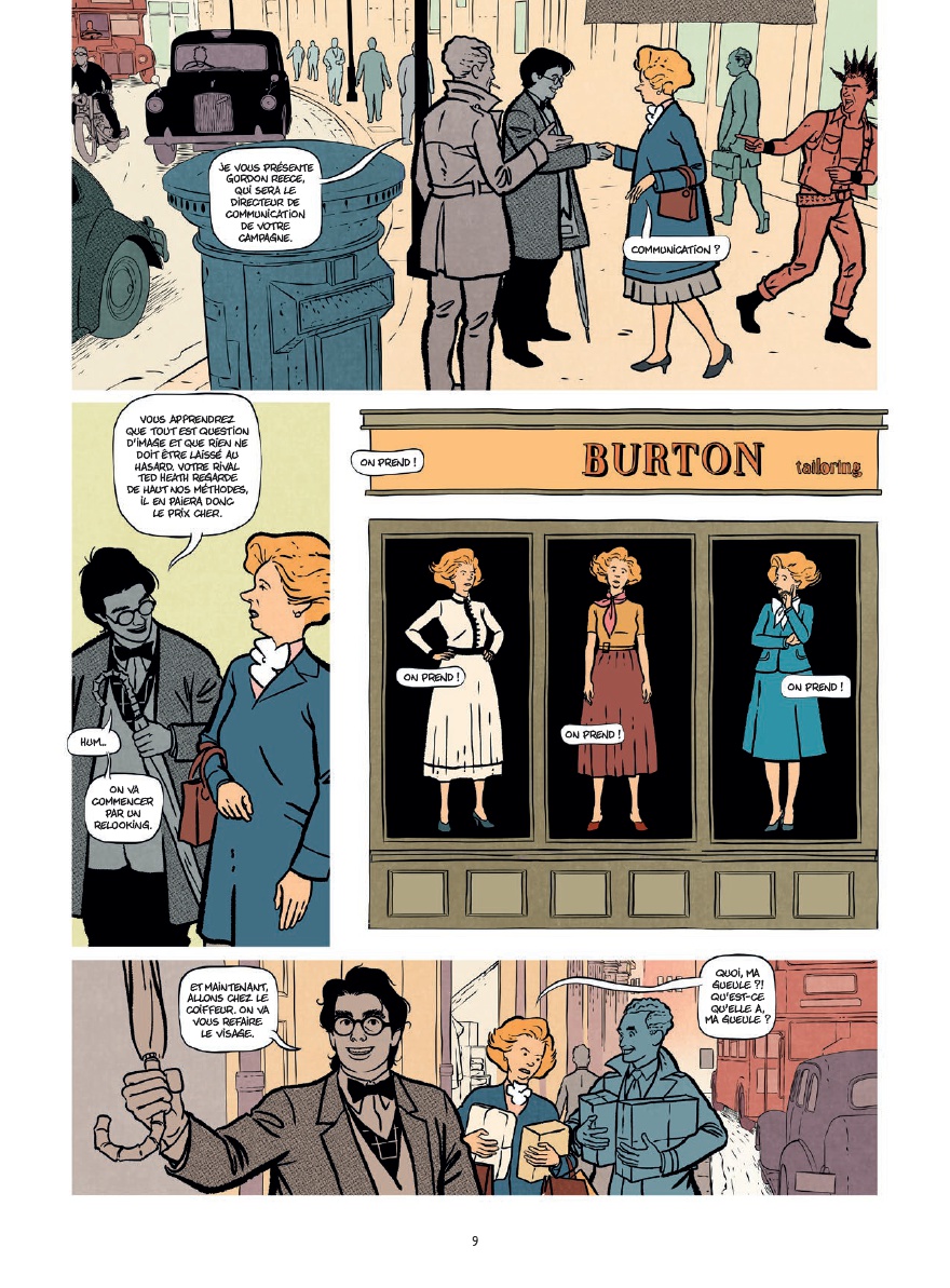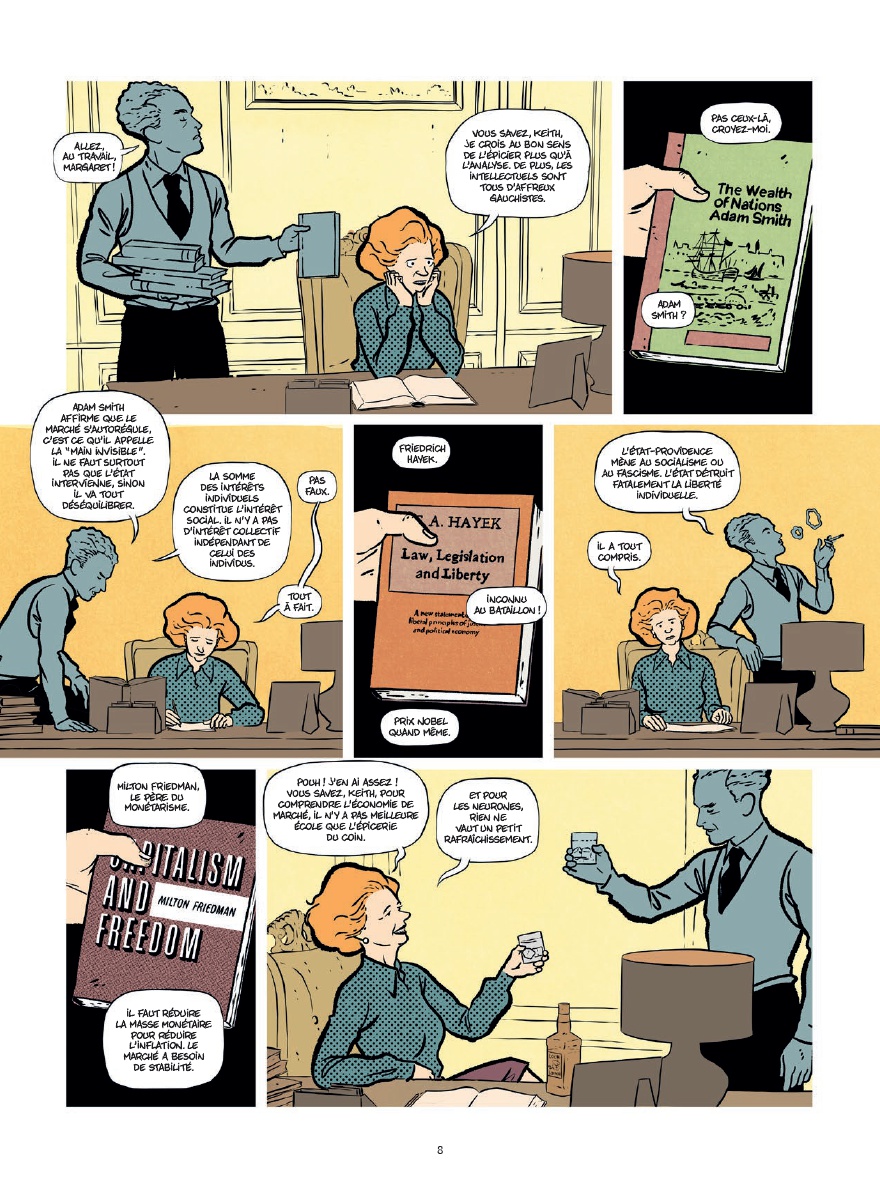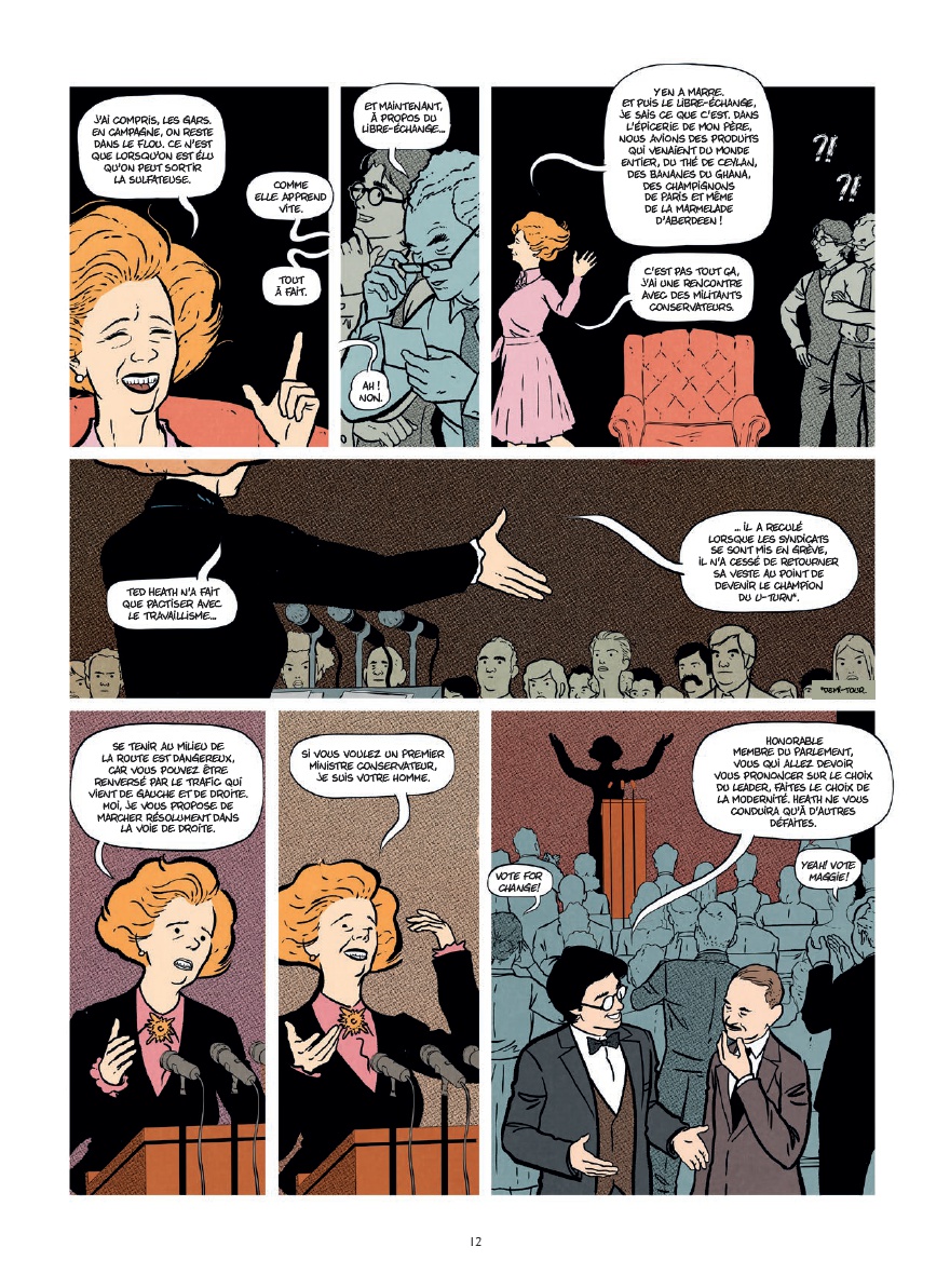 Après s'être attaqué à Ronald Reagan dans Le Crétin qui a gagné la guerre froide, Jean-Yves Le Naour poursuit son exploration des grandes figures du libéralisme triomphant des années 80 en consacrant cette fois un album à Margaret Thatcher. Et là encore, il le fait avec ce ton très particulier, à mi-chemin entre le biopic historique sérieux et la satire politique complètement acide. L'album retrace son ascension, de fille d'épicier (comme elle aime le rappeler sans arrêt) à Première ministre britannique, puis déroule les grands marqueurs du thatchérisme : dérégulation, réduction de l'État, privatisations, casse des syndicats, guerre des Malouines et proximité idéologique avec Reagan. Le Naour adopte un ton caustique où le loufoque et un humour souvent cynique se mélangent constamment à la réalité historique, ce qui donne une mise en scène drôle sans sacrifier le fond politique. C'est le genre de BD qui se lit facilement tout en donnant envie de creuser ensuite certains événements ou décisions évoqués. Graphiquement, Emilio Van der Zuiden propose une ligne claire assez élégante et très lisible, avec une mise en scène échevelée qui colle bien à ce ton mi-figue mi-raisin : suffisamment légère pour accompagner la dimension humoristique, mais assez sobre pour ne pas désamorcer la gravité du fond. Ce qui fonctionne bien, c'est la manière dont Margaret Thatcher est représentée de façon volontairement ambivalente, tant sur le plan graphique que narratif : tantôt comme une cruche aux idées profondément odieuses, parfois presque grotesque dans sa rigidité idéologique, tantôt comme une stratège politique redoutablement machiavélique, capable de manipuler ses conseillers, ses ministres et son image médiatique pour rester au pouvoir malgré la haine d'une grande partie de la population. L'album rappelle aussi à quel point ses politiques ont broyé une partie des classes populaires britanniques, notamment les mineurs et les bastions ouvriers, en assumant une brutalité sociale qui explique pourquoi tant de Britanniques l'ont haïe. Le récit évoque d'ailleurs en filigrane l'Angleterre punk de la même époque, celle qui voyait en elle une incarnation détestable du pouvoir et la désignait comme une figure à combattre. Sans développer énormément cet aspect culturel, on ressent bien cette période où une partie de la jeunesse percevait le thatchérisme comme quelque chose de profondément violent, teinté de dérives autoritaires voire fascisantes. Une BD politique très orientée idéologiquement, clairement, mais qui assume totalement son point de vue et qui réussit surtout à être à la fois instructive et amusante.