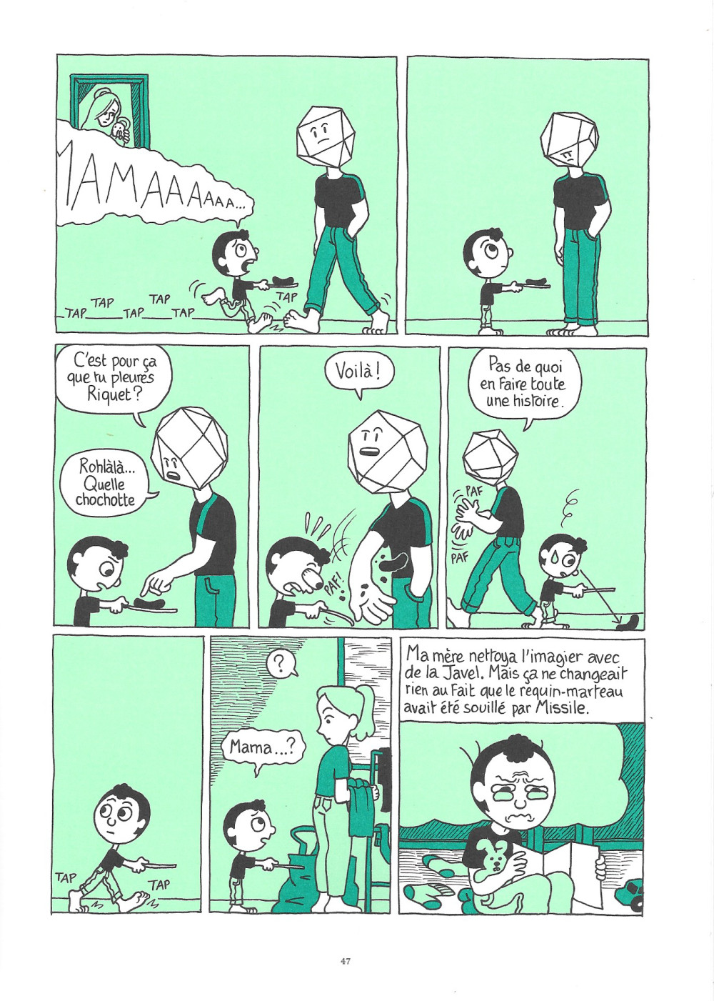 Théo Grosjean commence une série qui mélangerait l'autobiographie et la fiction. Je n'ai aucune idée ce qui est inventé ou non dans ce premier tome et j'avoue que je m'en fous un peu. J'ai trouvé le résultat moyen avec des bons et des moins bons moments. Parfois, je ne comprenais pas les intentions de l'auteur comme le fait que pendant un moment le visage du père est différent du reste de la famille jusqu'à ce que le petit dernier se rends compte que son père a un visage comme les autres. On suit donc Riquet, le dernier enfant d'une famille un peu dysfonctionnelle où le père est gendarme et la mère très religieuse. L'action se passant lorsque j'étais moi-même enfant, je me suis reconnu dans certaines situations. Le fait que le père est gendarme permet de découvrir un peu se métier, mais je ne pense pas avoir appris grand chose de nouveaux et je doute que plusieurs lecteurs de voir qu'il y a du machisme et du racisme dans ce milieu. Je comprends pourquoi Riad Sattouf a publié cette série dans sa maison d'édition parce que le travail de Grosjean ici rappel son propre travail et au déprimant de cette série. En effet, on dirait du Sattouf, mais en moins maitrisé. Ça se laisse lire et il y a des bons moments, mais ce n'était pas palpitant à lire.